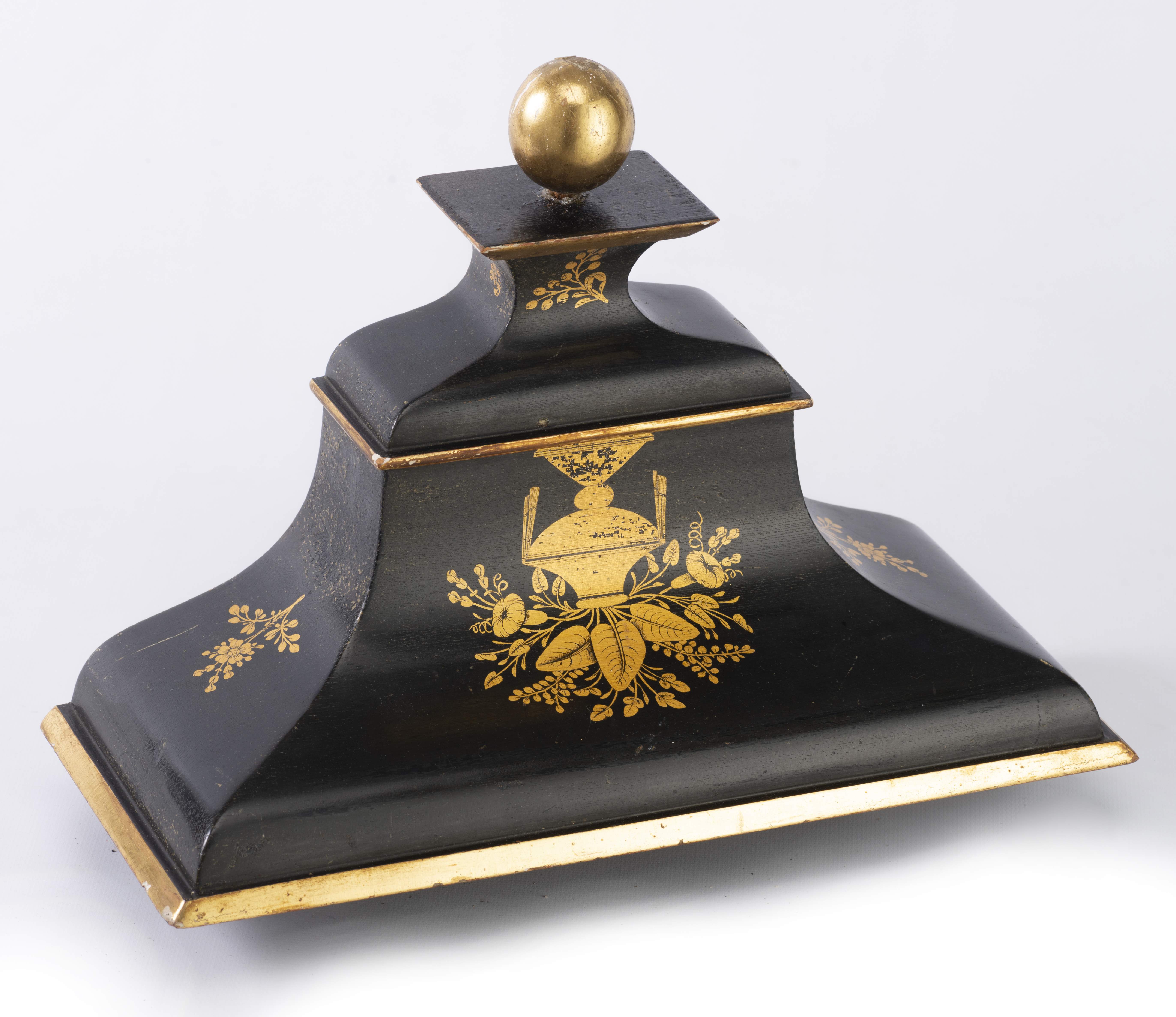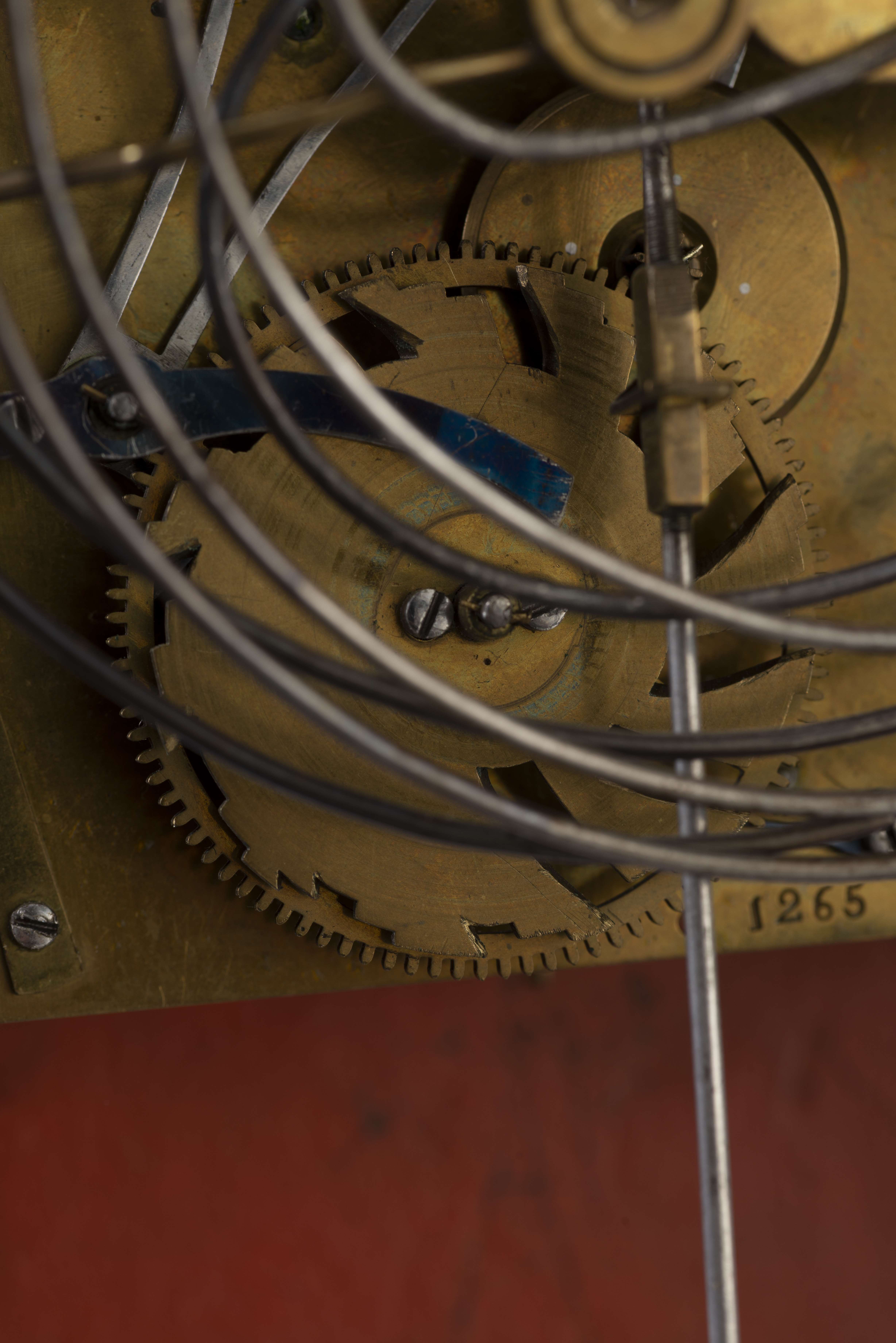 Horloge neuchâteloise à caisse en bois peint en noir avec surdécor à l'or de bouquets de fleurs, avec son cul de lampe à décor d'un vase fleuri. cadran bombé, aiguilles lune et soleil, mouvement postérieur.
