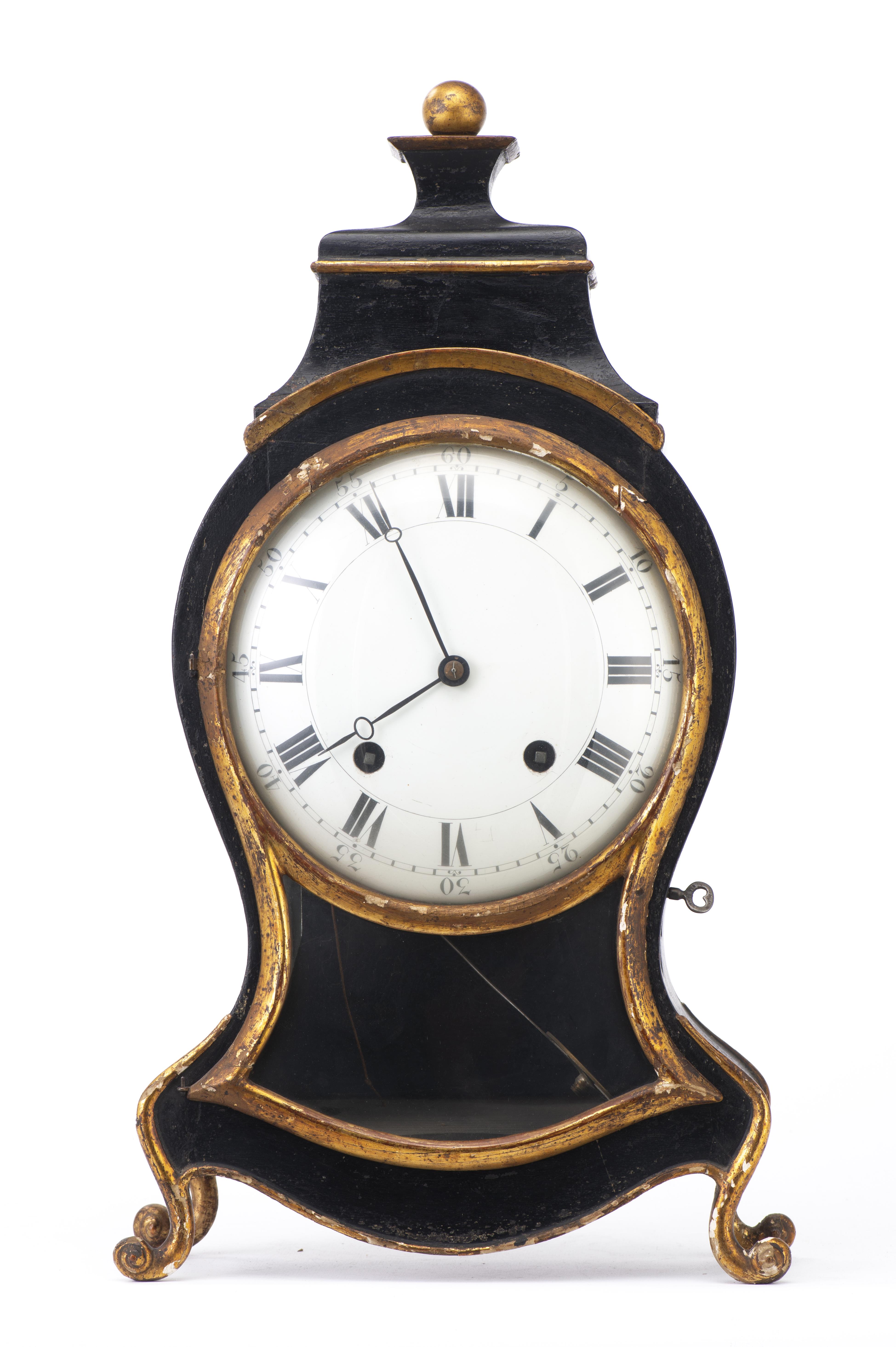 Pendule neuchâteloise à caisse en bois laqué noir à 2 cloches et 4 marteaux, balancier à fil, sonnerie à répétition et à reprise, vers 1820.