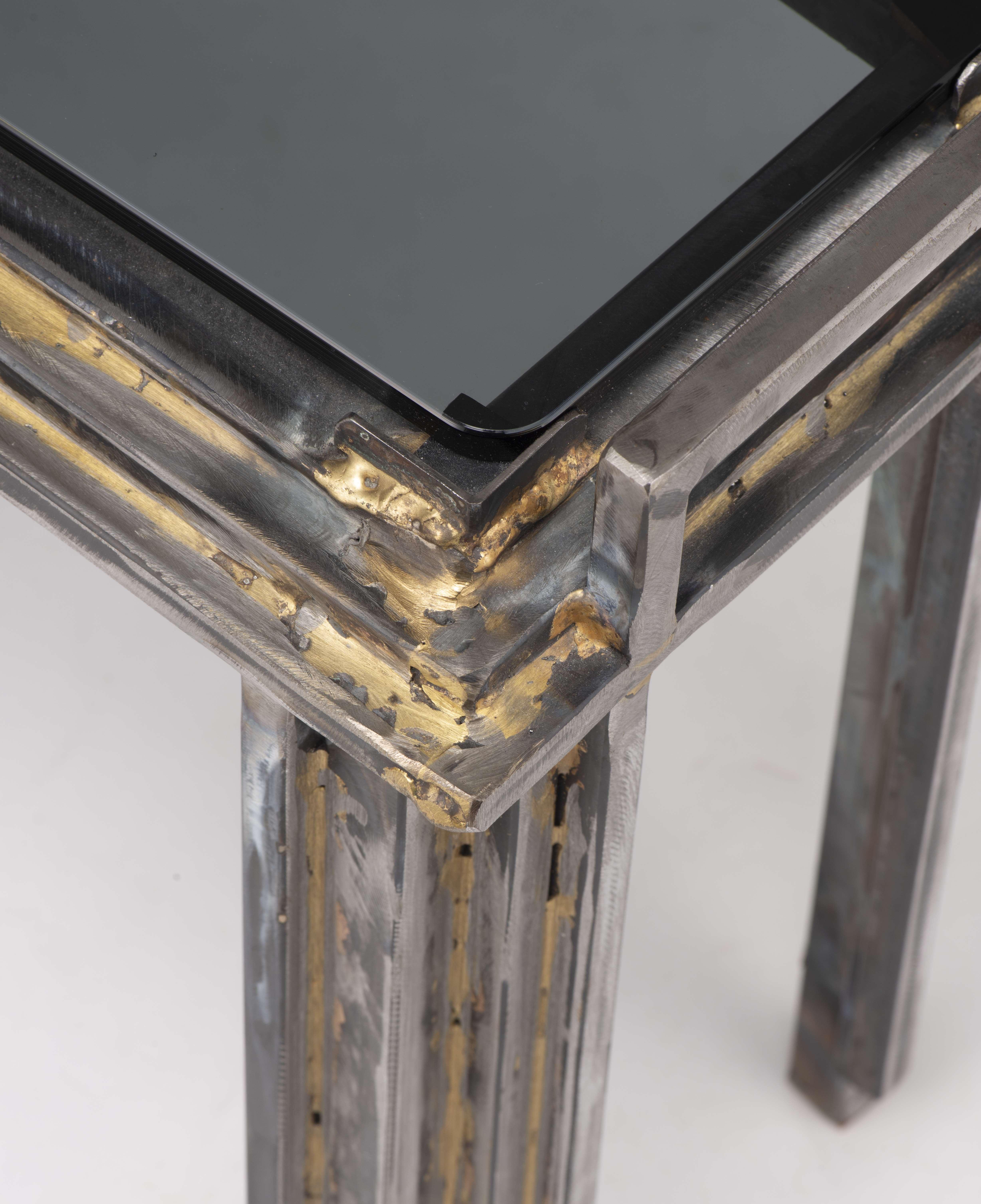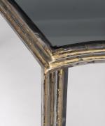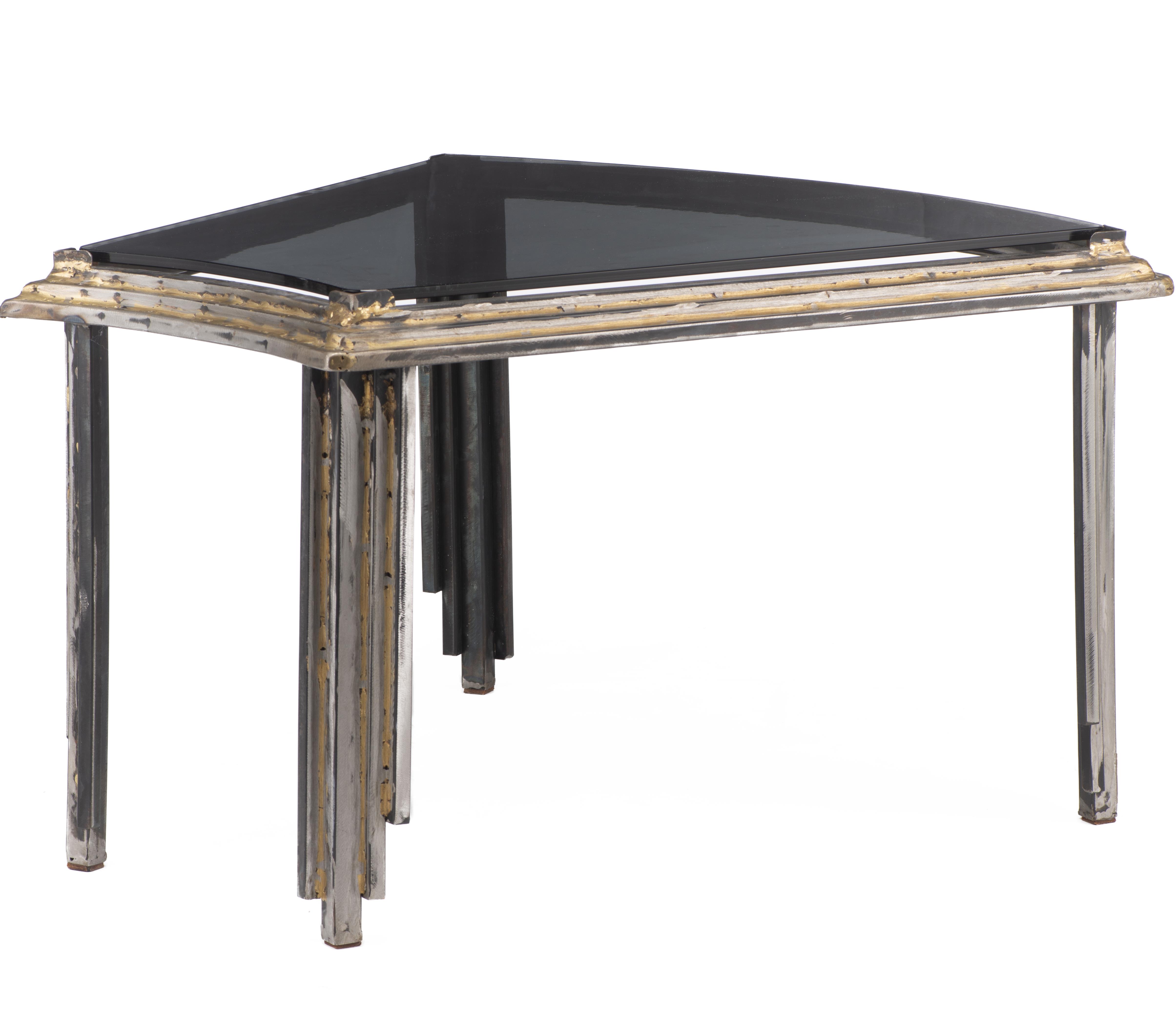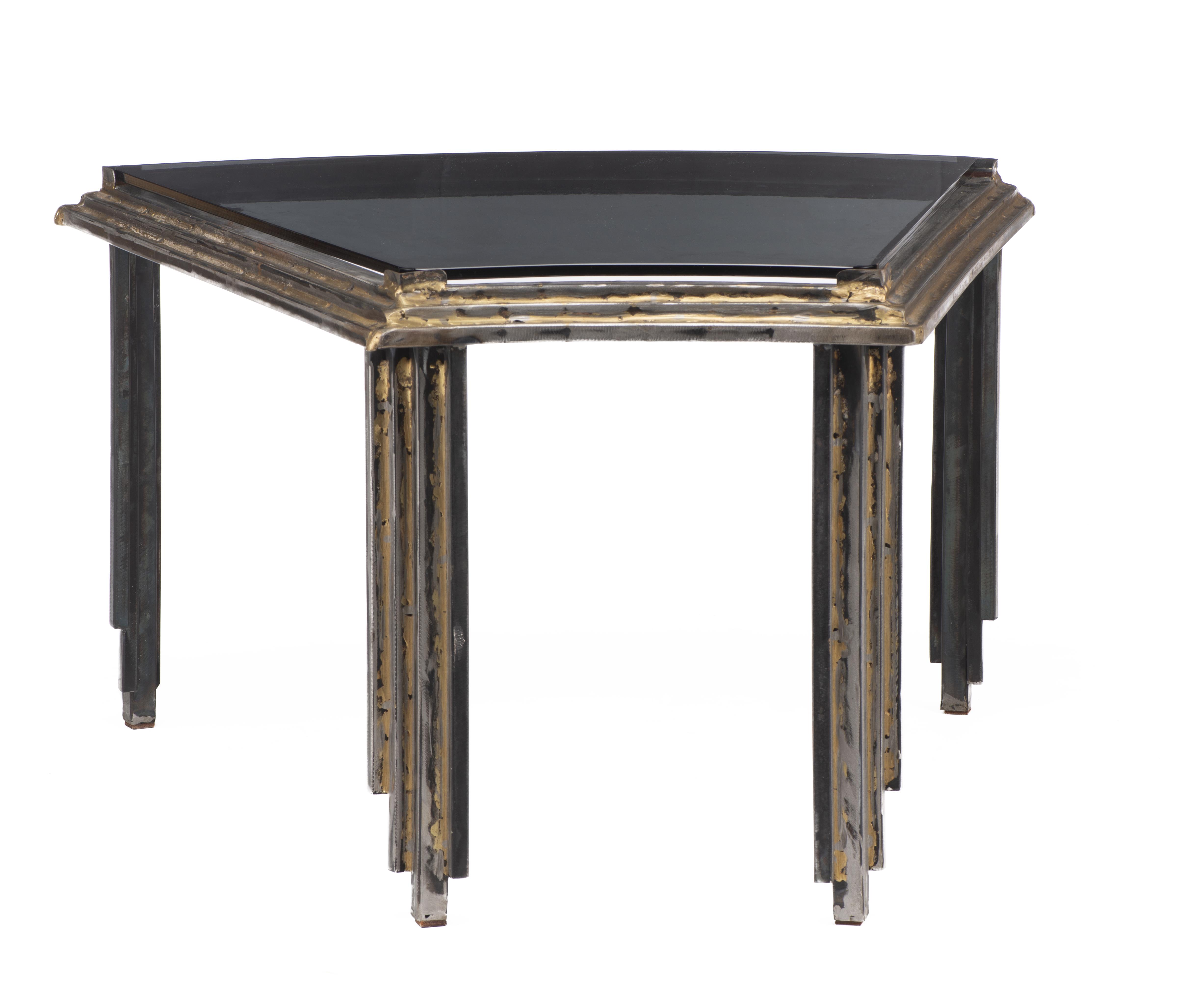 Jacques BASLER (né en 1942) deux tables bout de canapé en forme de tranche de gâteau en métal doré et métal noirci avec dessus de verre fumé.