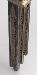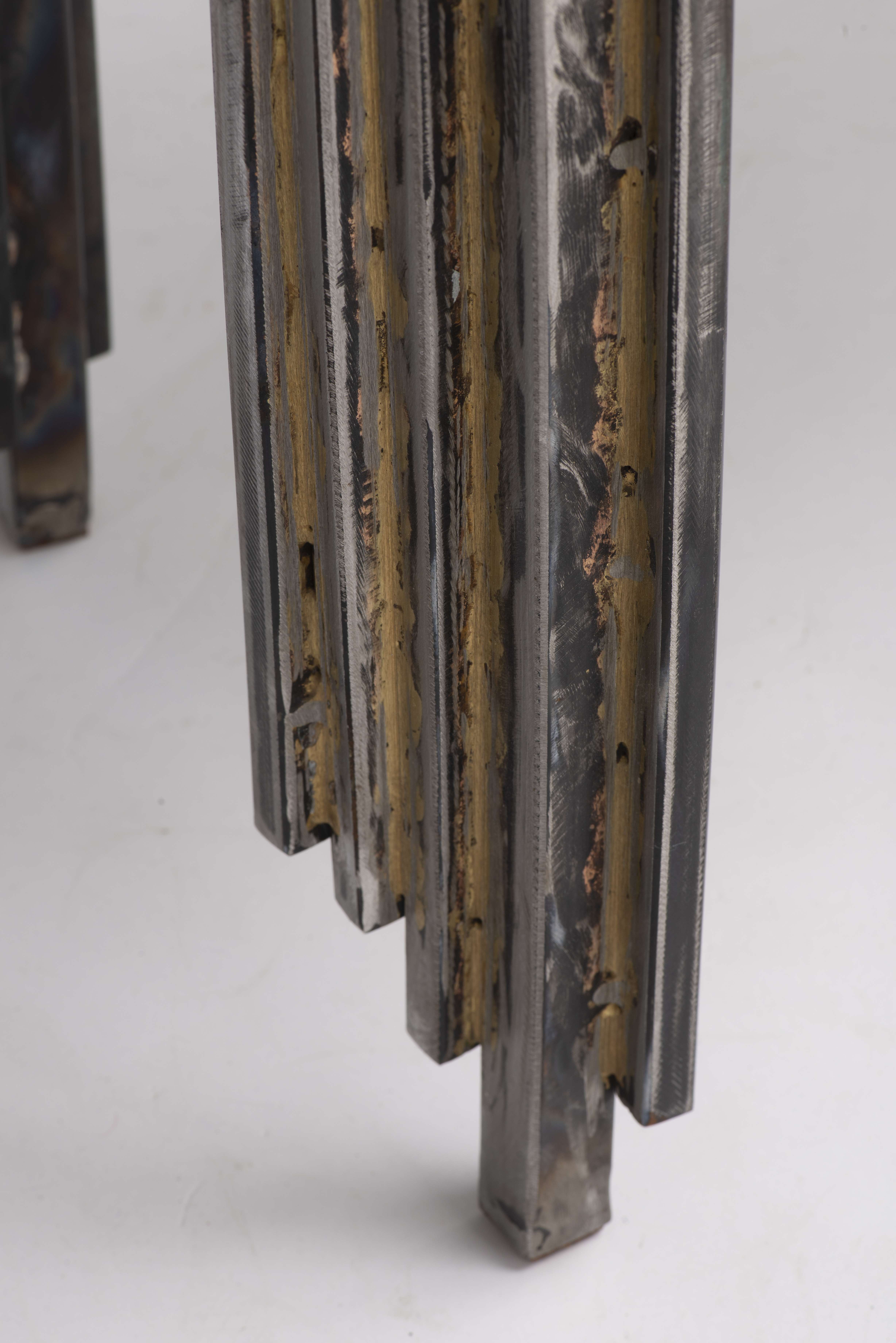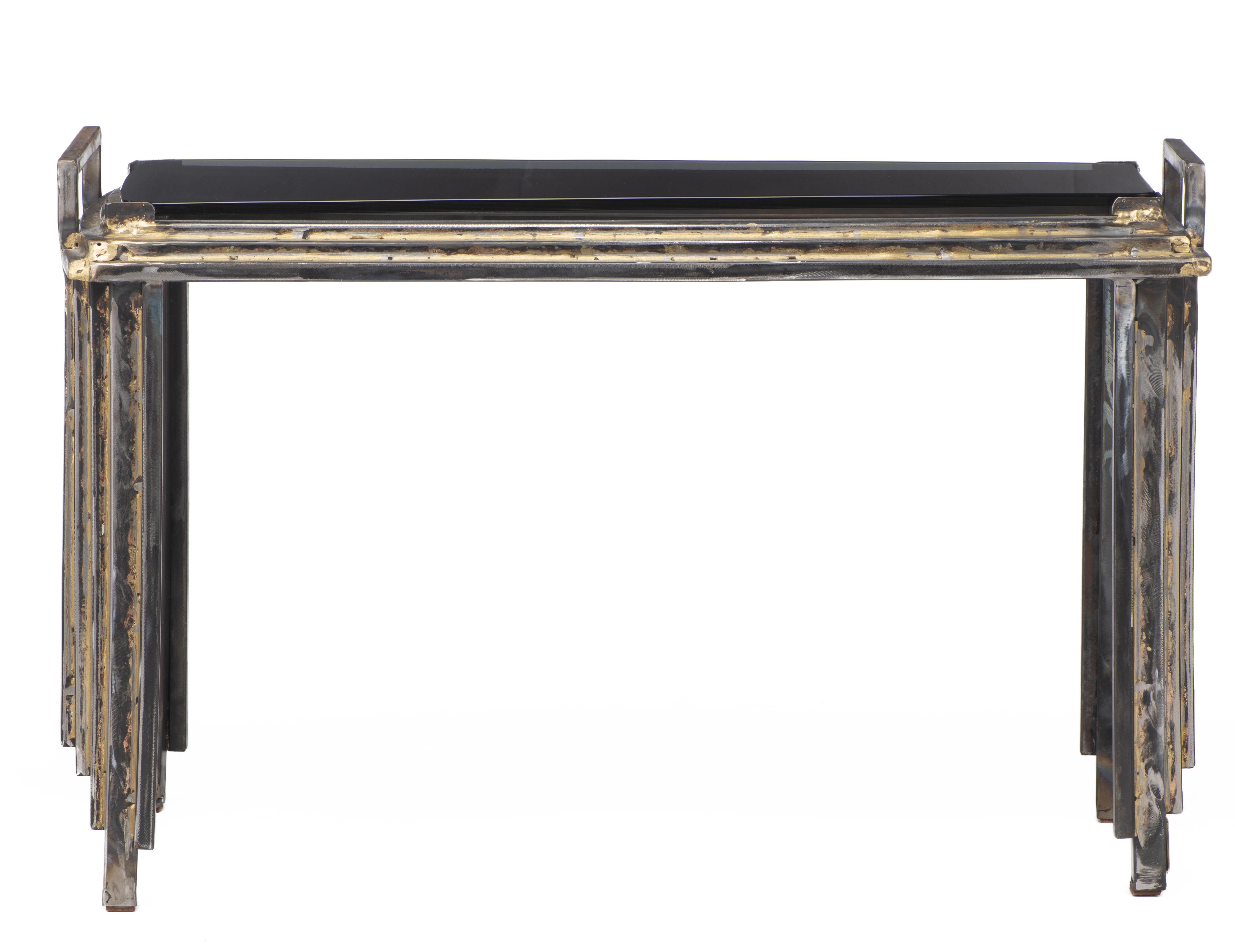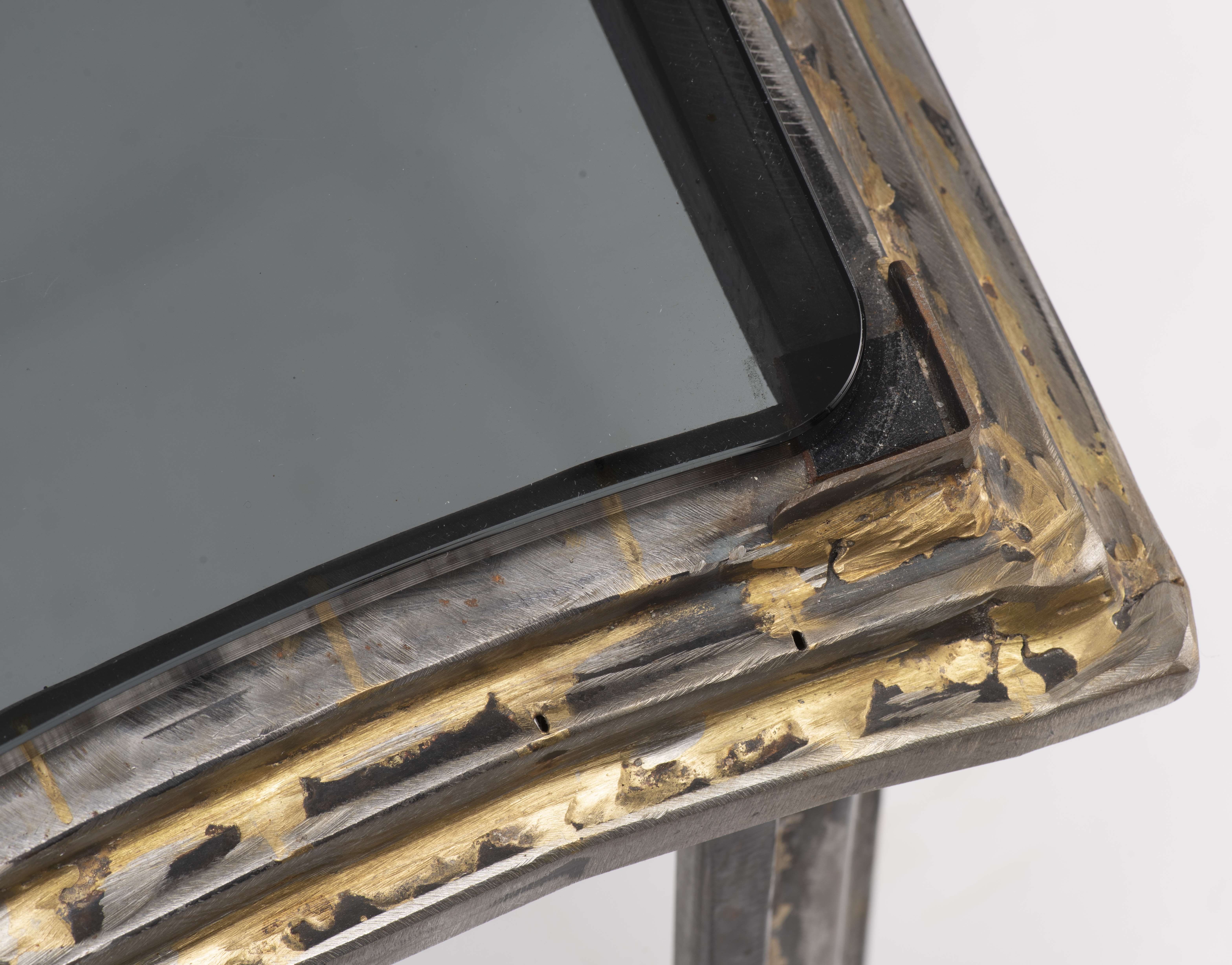Jacques BASLER (né en 1942) deux tables bout de canapé en forme de tranche de gâteau en métal doré et métal noirci avec dessus de verre fumé.