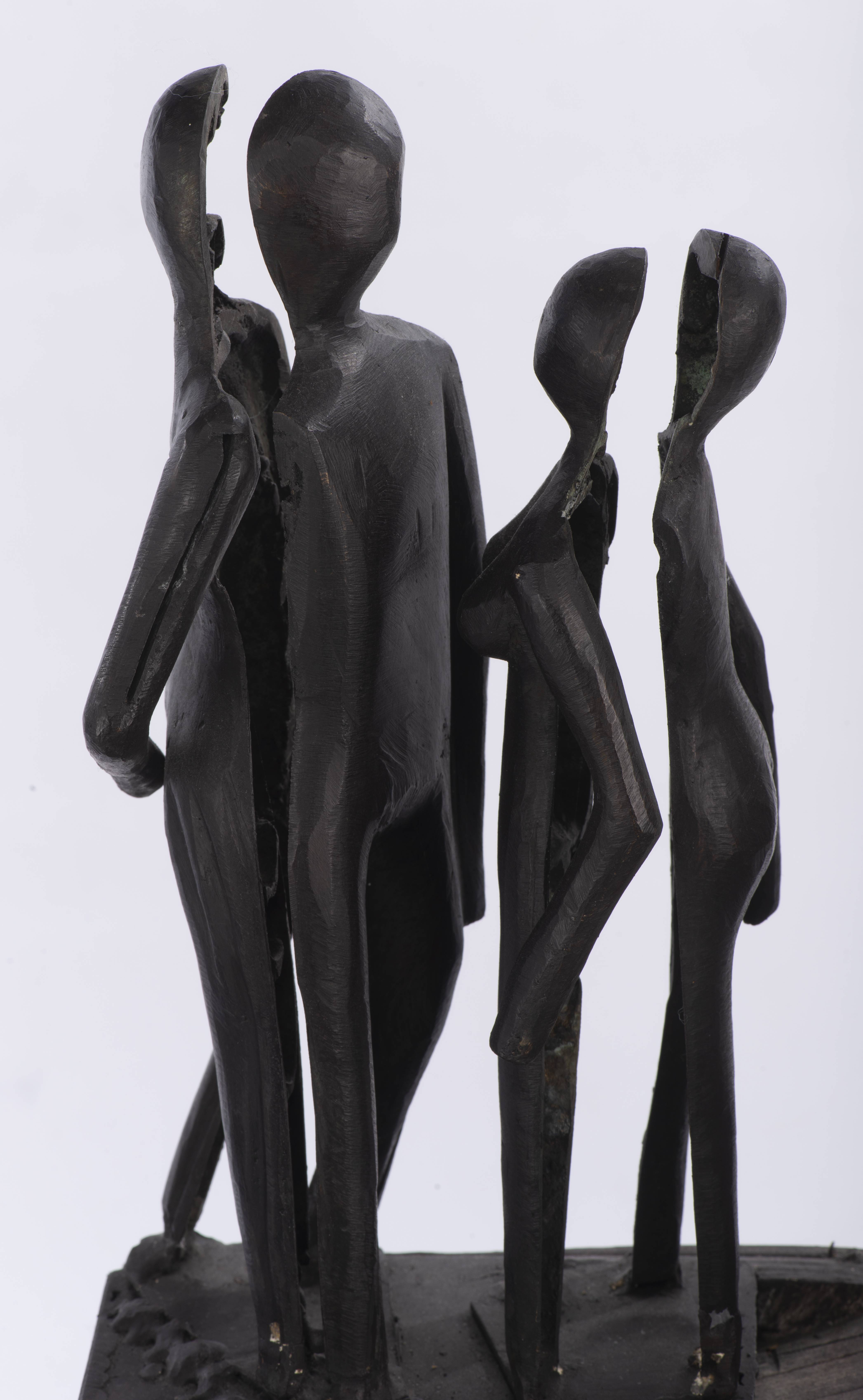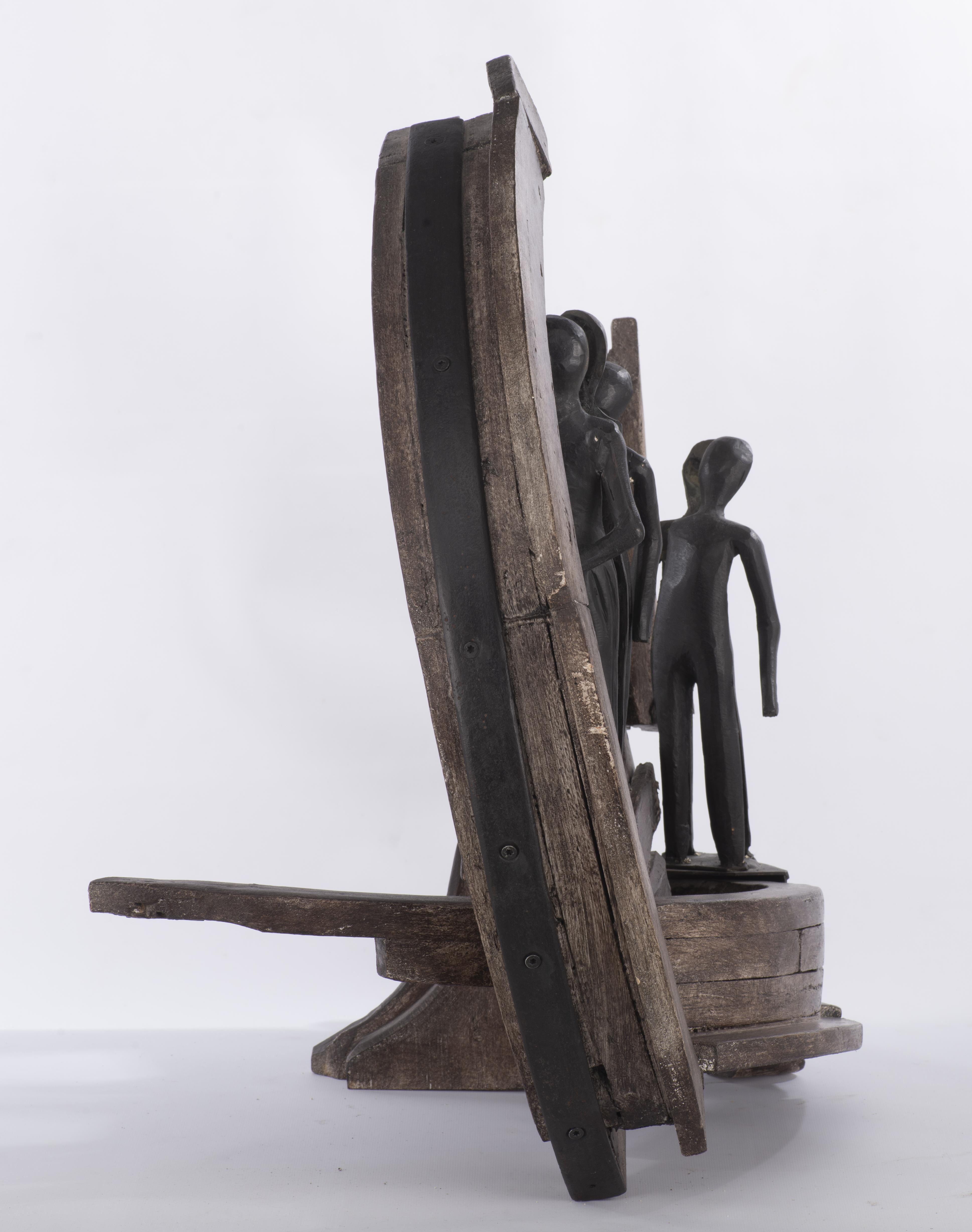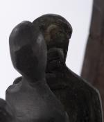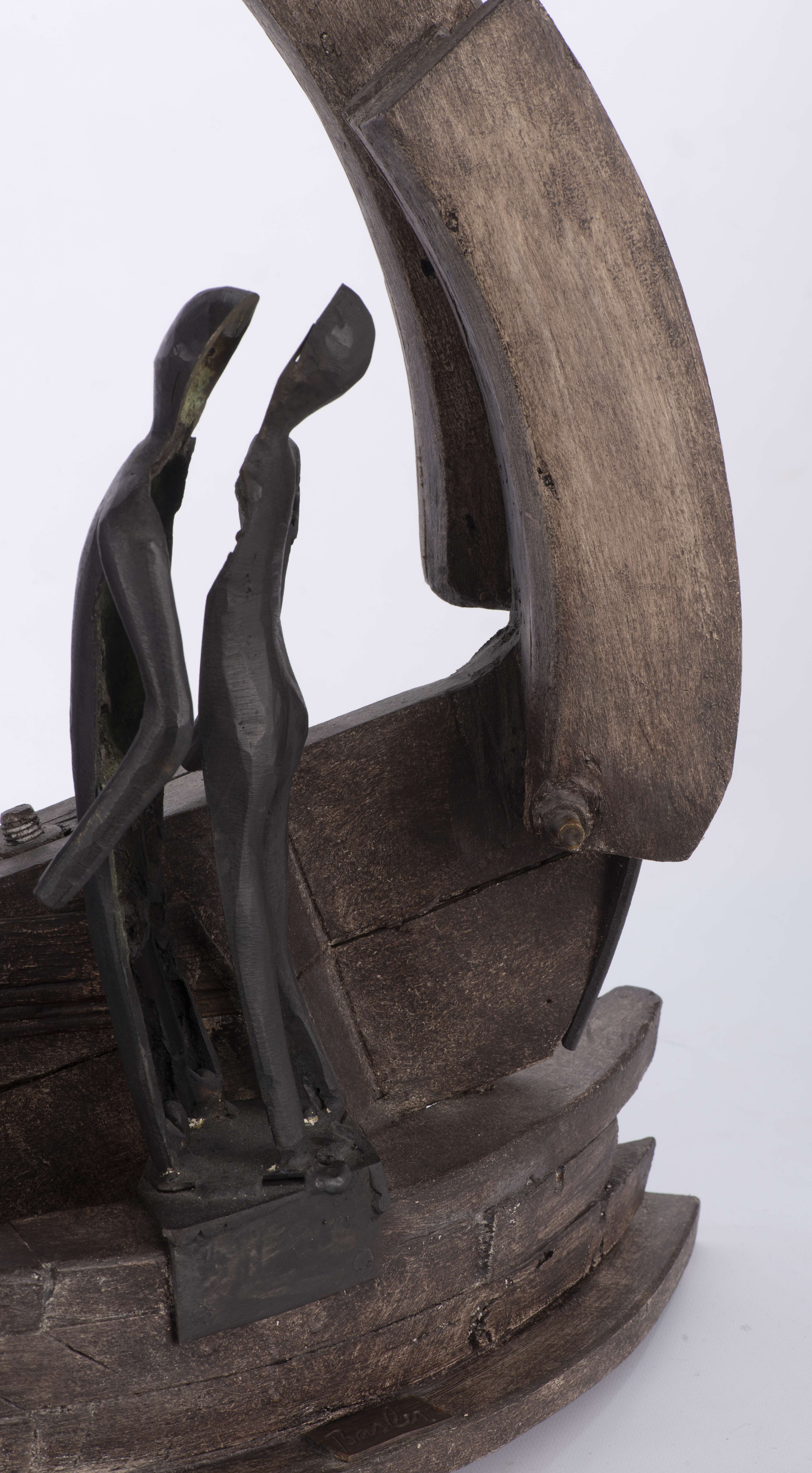 Jacques BASLER (né en 1942) sculpture en bois et métal de trois couples dans un anneau brisé, signé Basler vers la base.