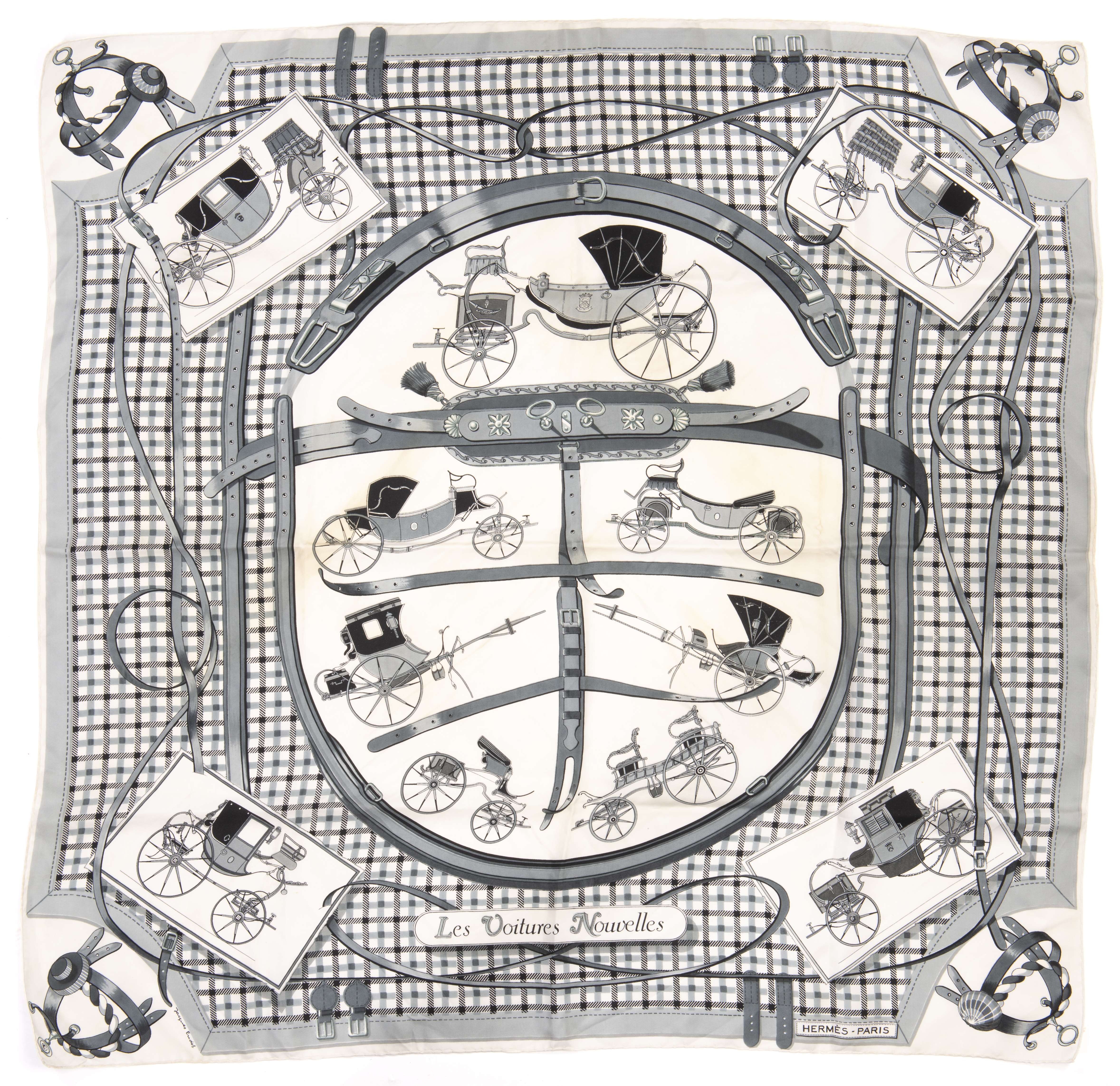 Hermès Paris, carré en soie "Les Voitures Nouvelles" par Jacques Eudel, première édition datant de 1968.