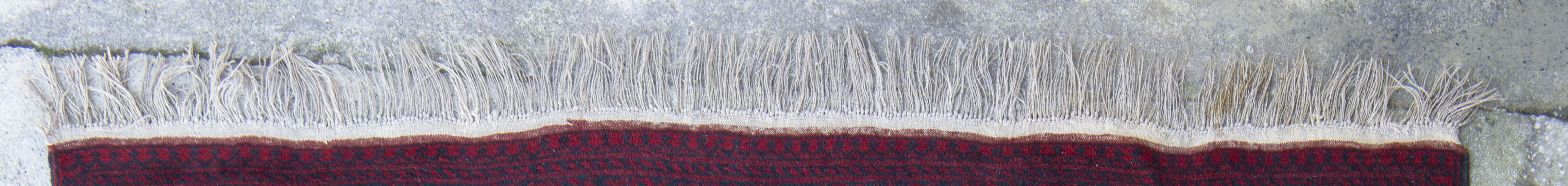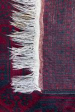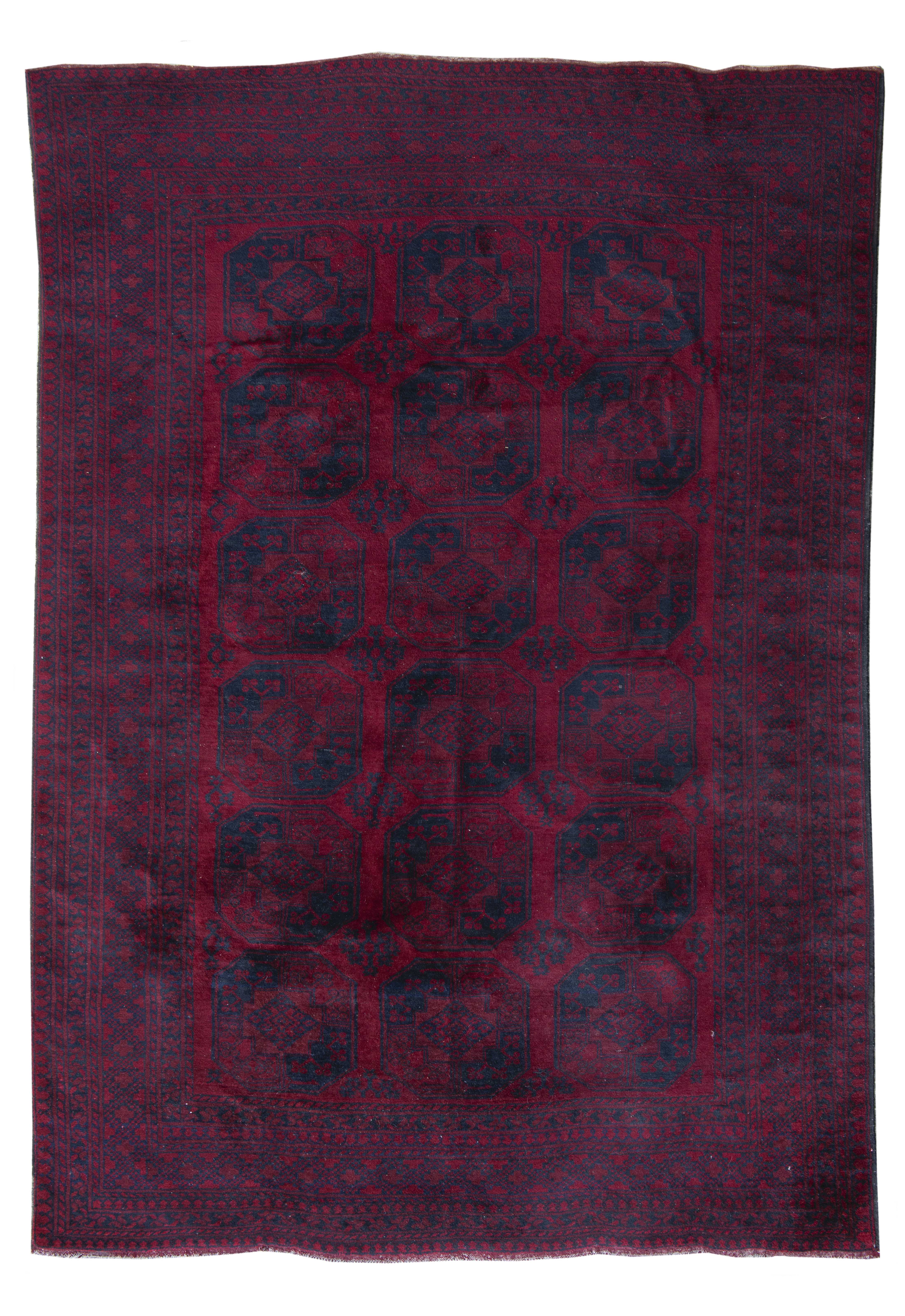 Tapis Boukhara en laine à décor de 18 güls noirs octogonaux sur champ principal rouge, bordure principale à décor d'entrelacs géométriques en noir sur fond rouge.