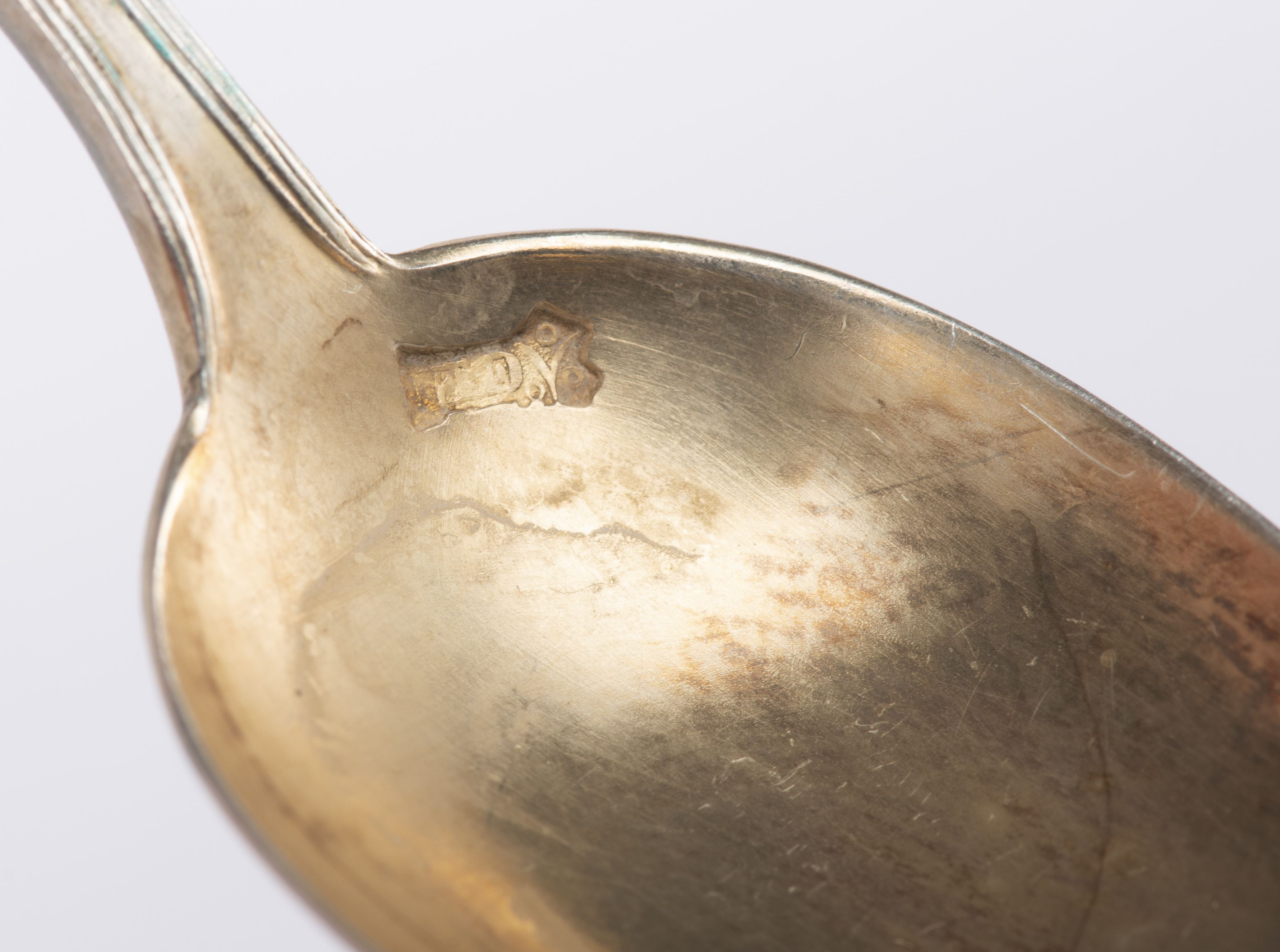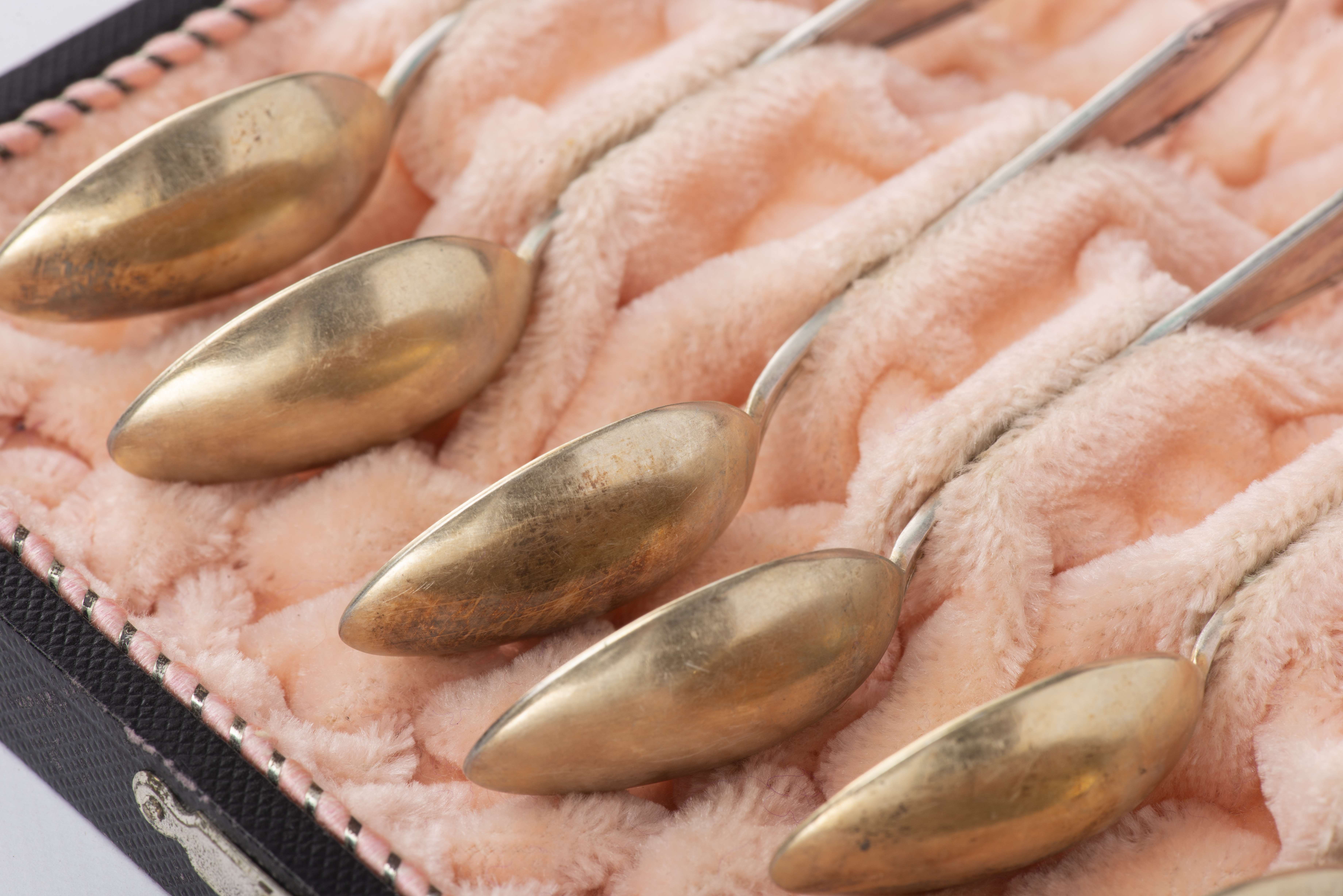 Six cuillères à moka en argent .800 Jezler à décor au ruban croisé et cuilleron vermeil.