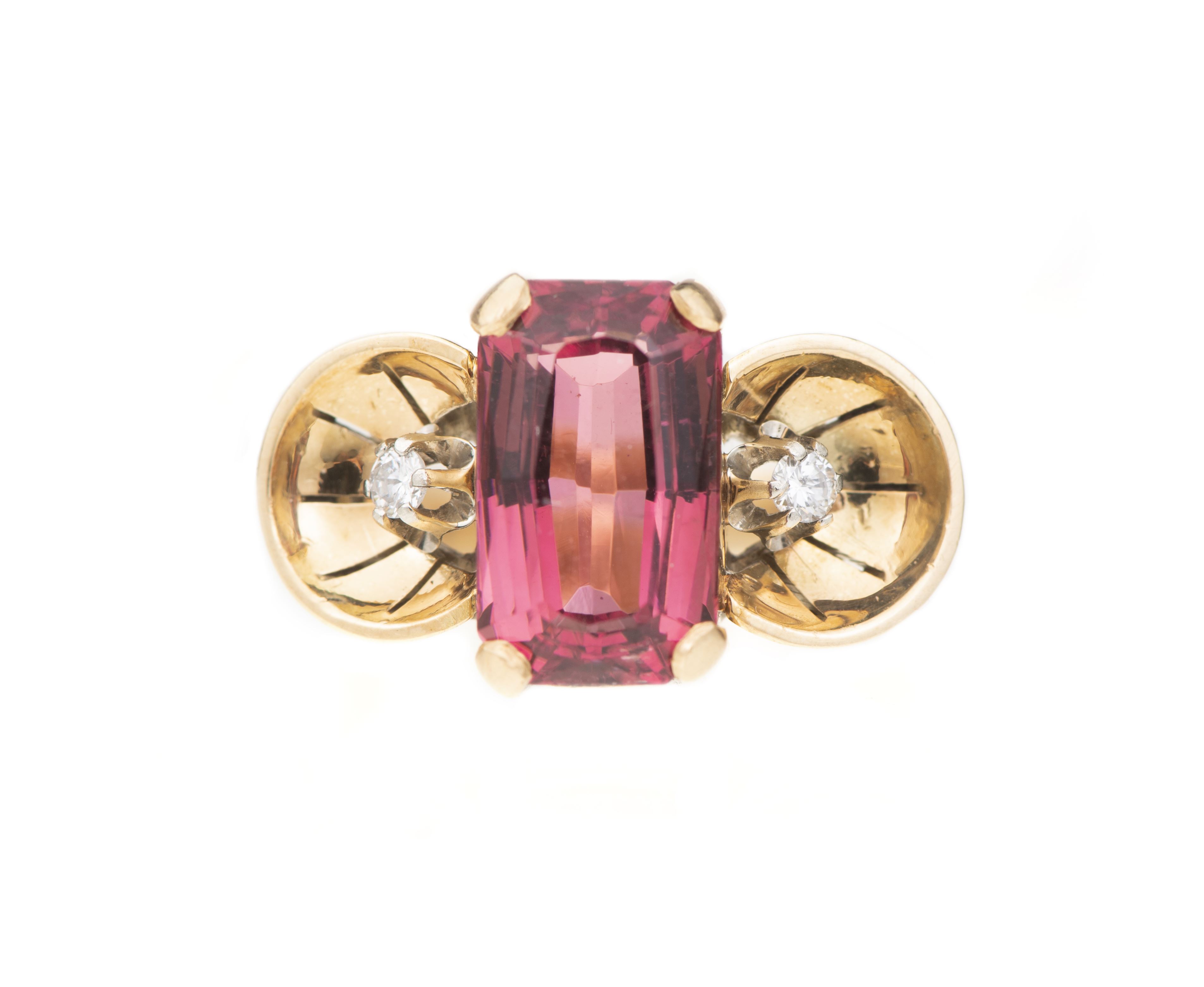 Bague des années 1940 en or jaune .585 avec une tourmaline rose de taille émeraude de 6 ct et deux diamants de 0.06 ct.