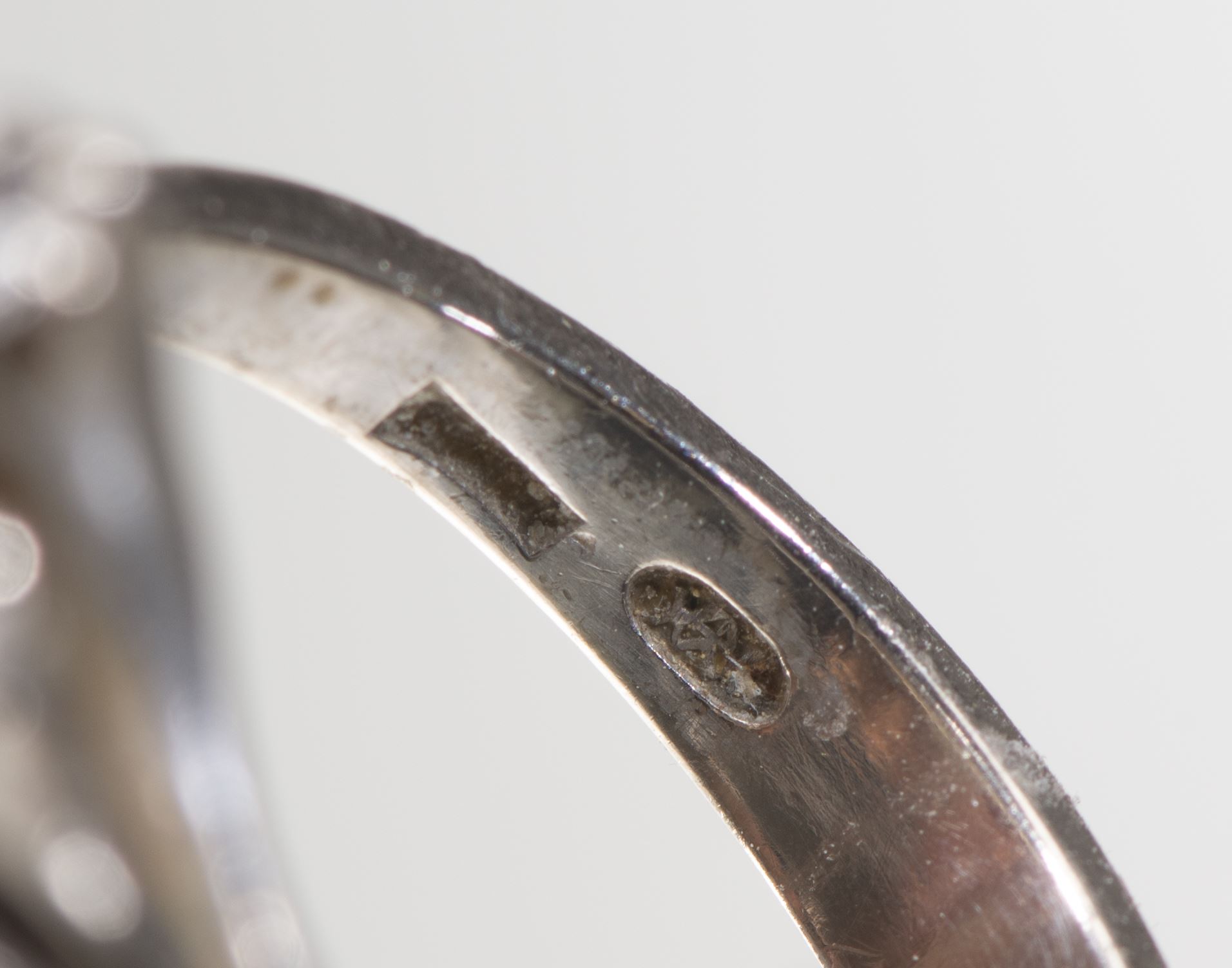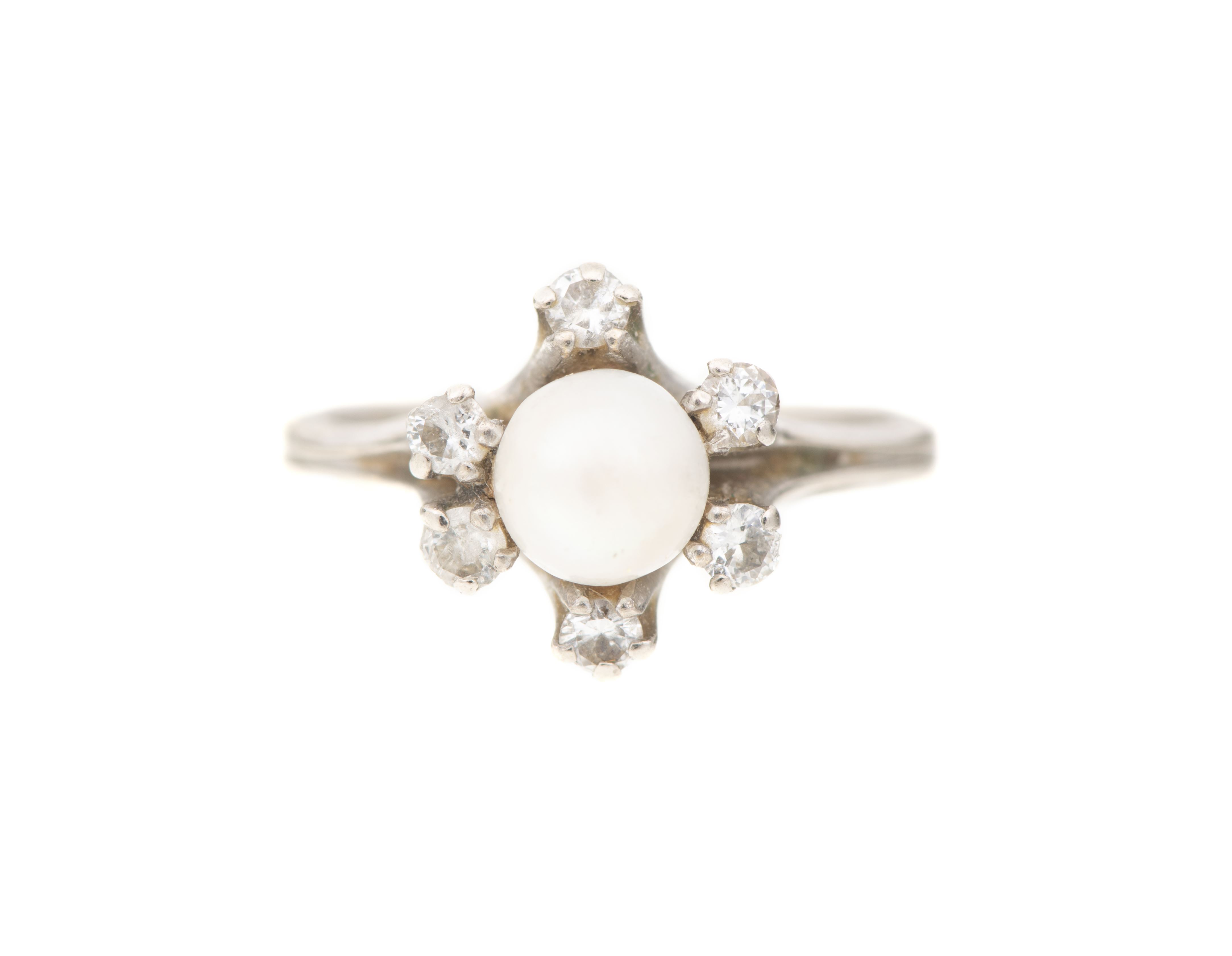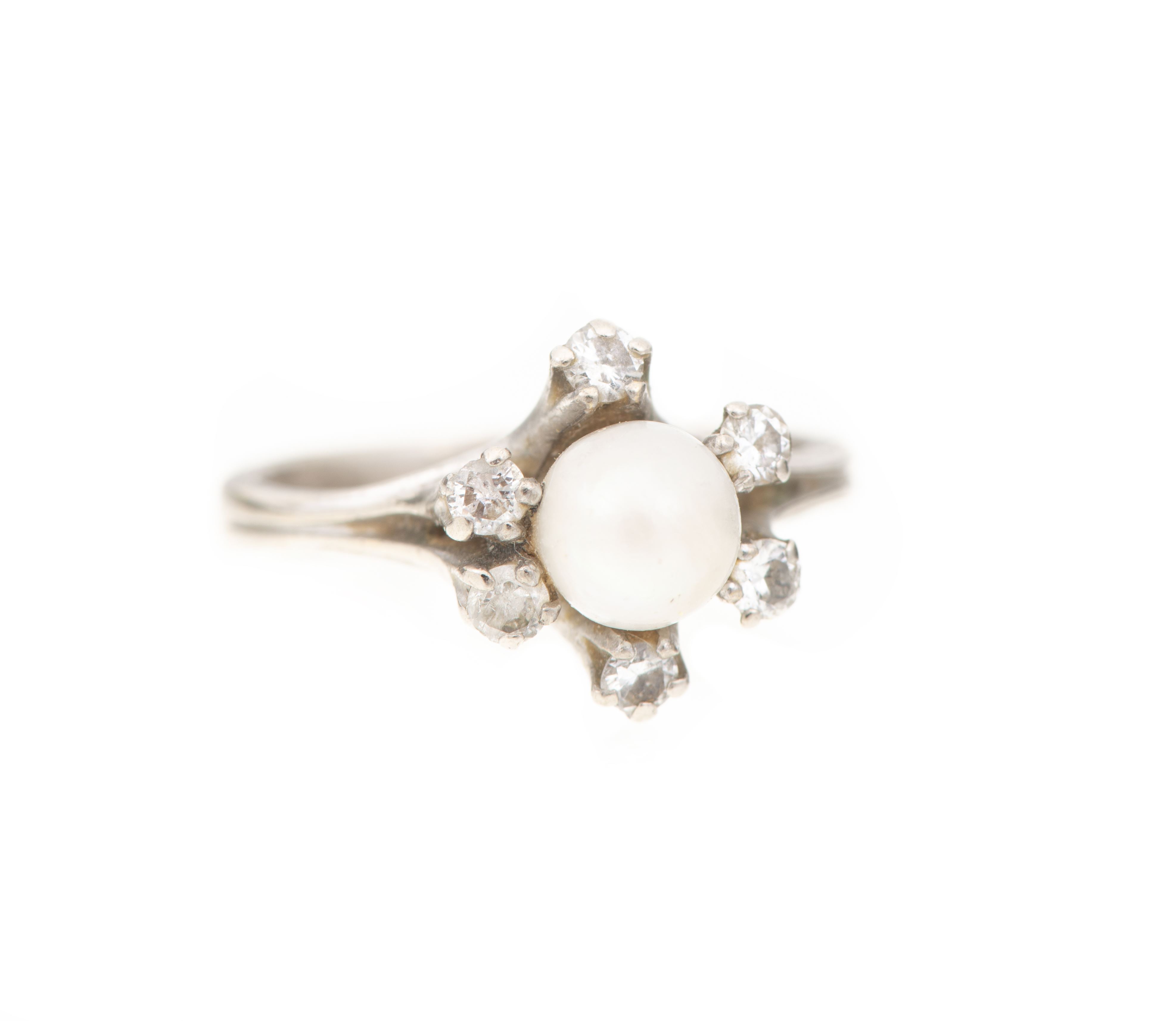 Bague en or gris .750 avec une perle D. 6 mm et entourage de 6 diamants, serti à griffes, taille brillant, pour un total de 0.10 ct.