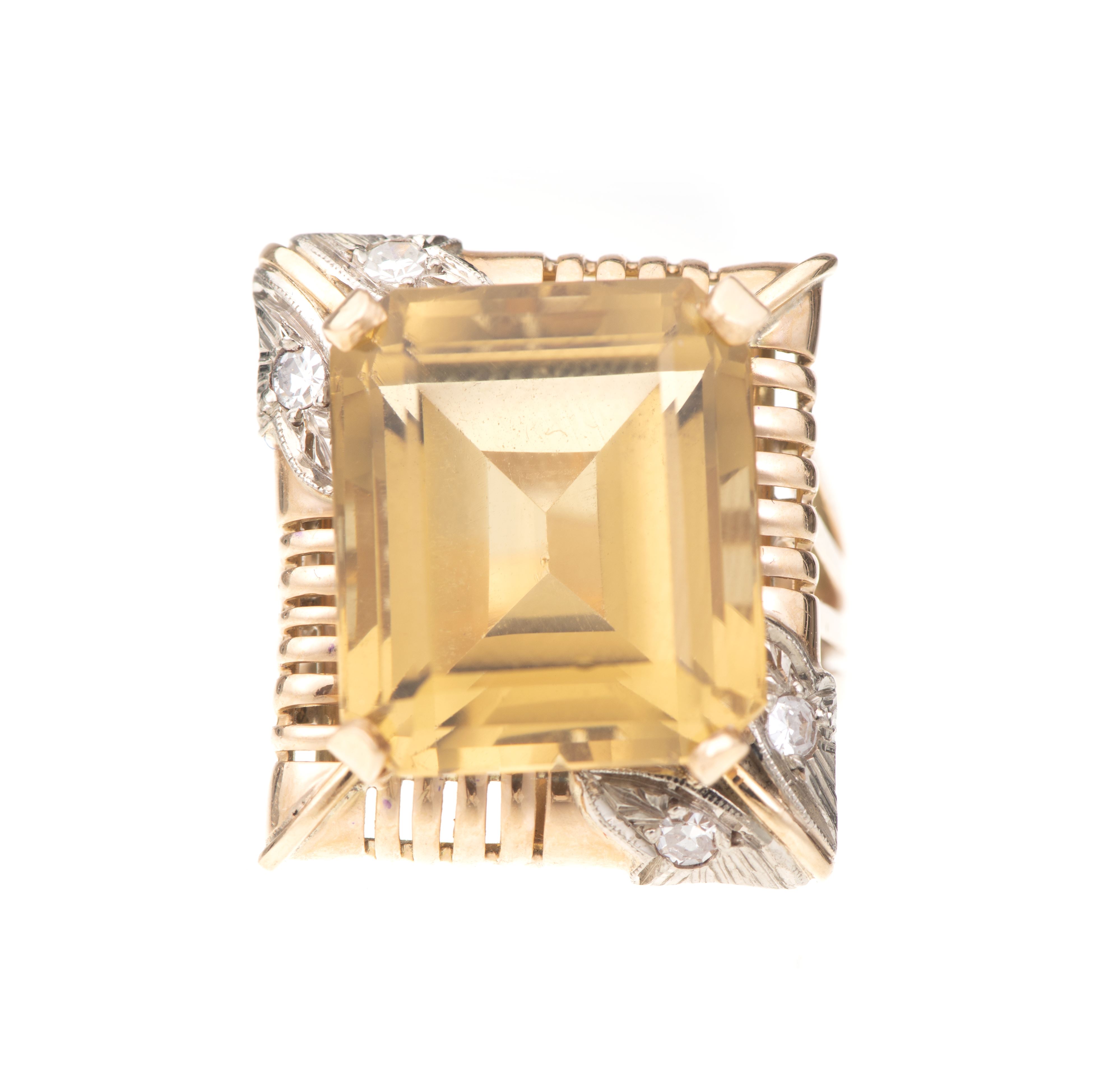 Bague des années 1940 en or rose .585 avec une citrine carrée de env. 15 cts et quatre diamants de taille 8/8 pour 0.04 ct.