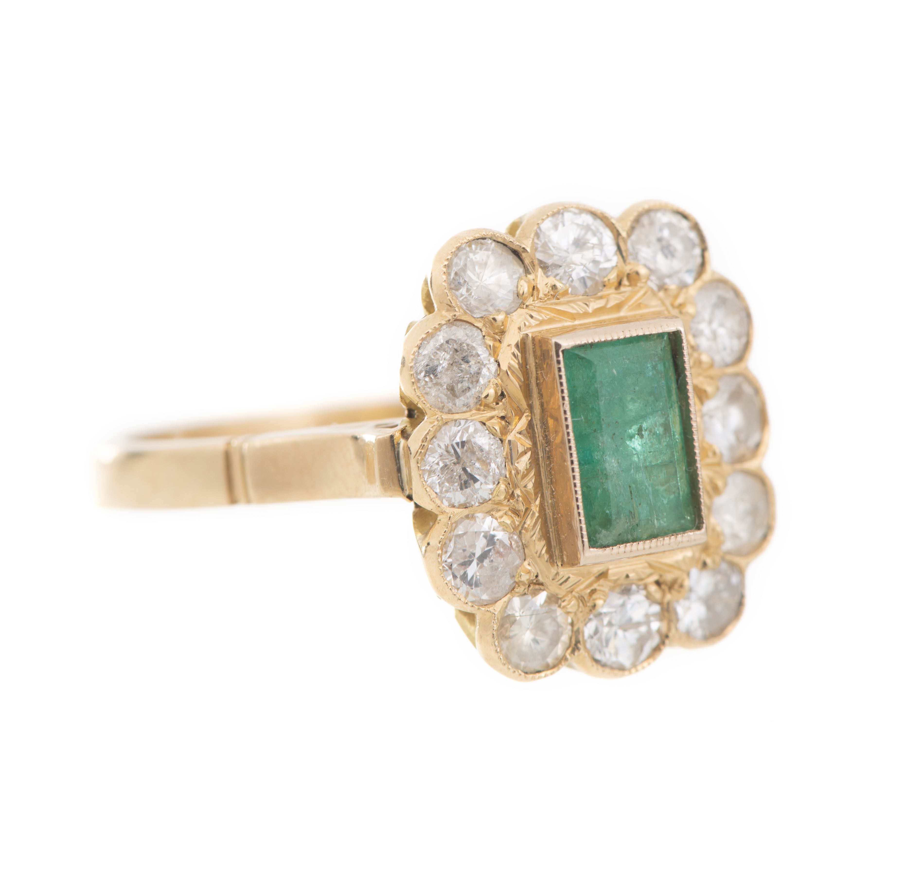 Bague en or jaune .750 avec une émeraude de 0.90 ct entourée de douze diamants pour 0.40 ct.