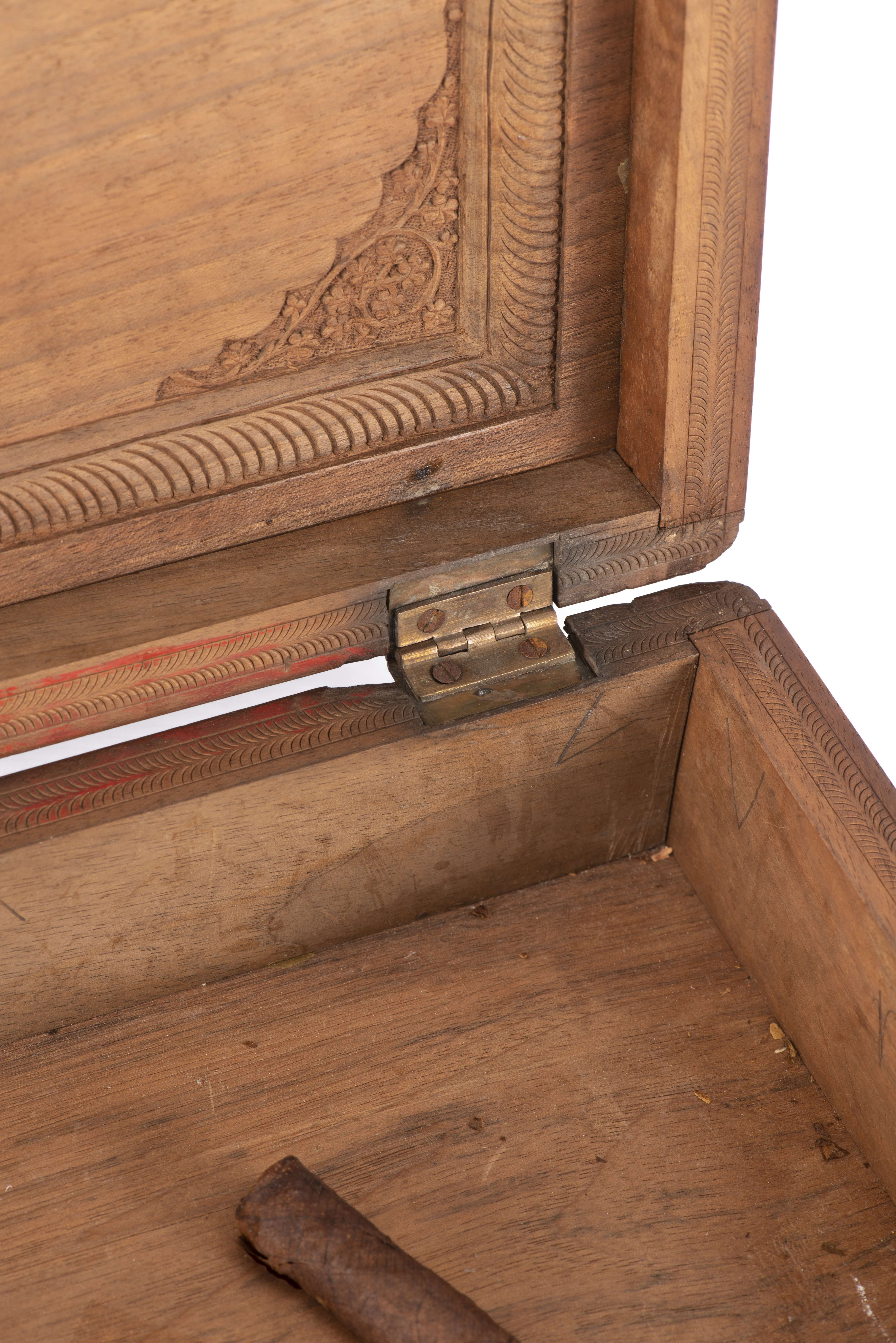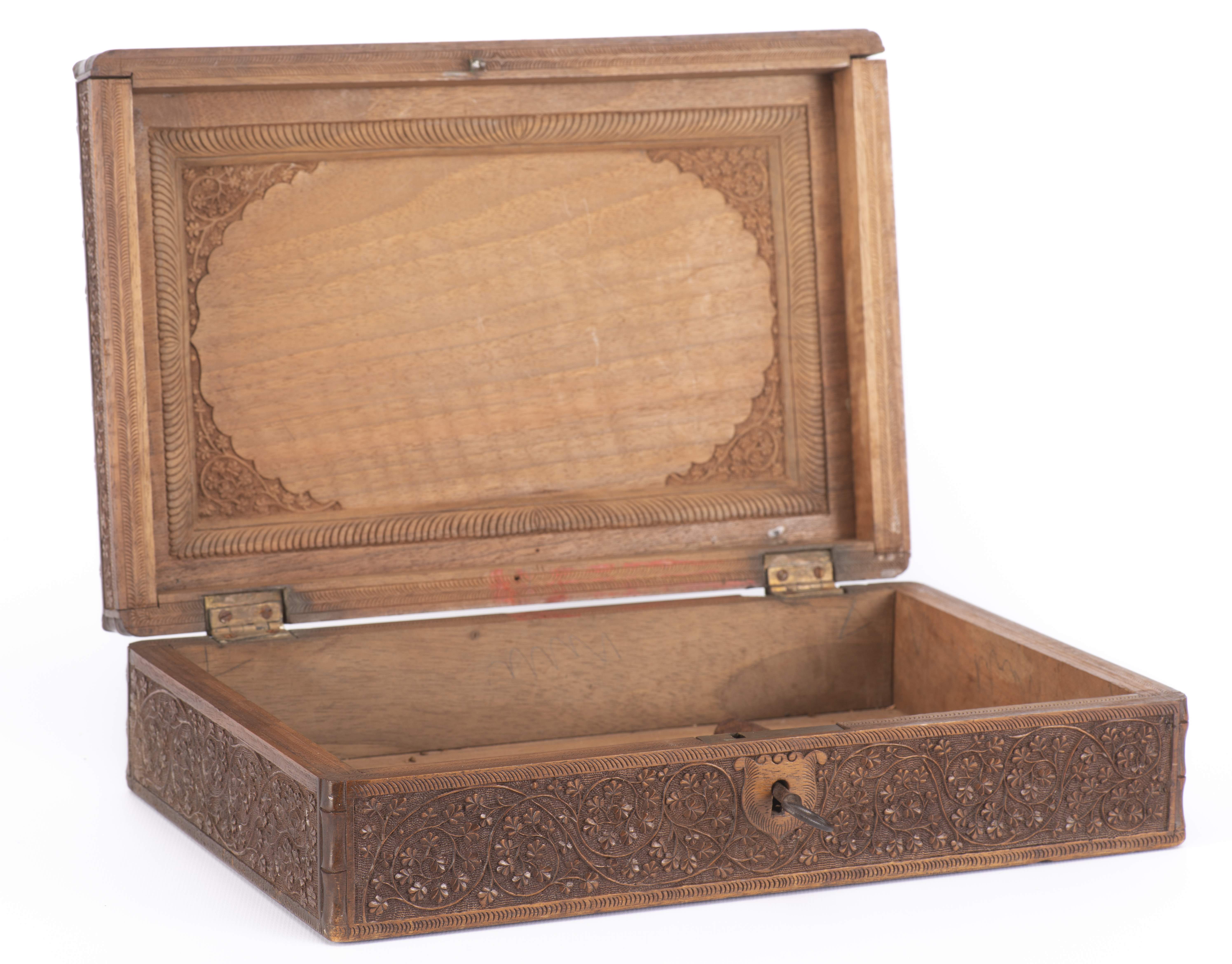 Boîte rectangulaire indienne finement sculptée à décor de rinceaux et de fleurs, avec sa clé.