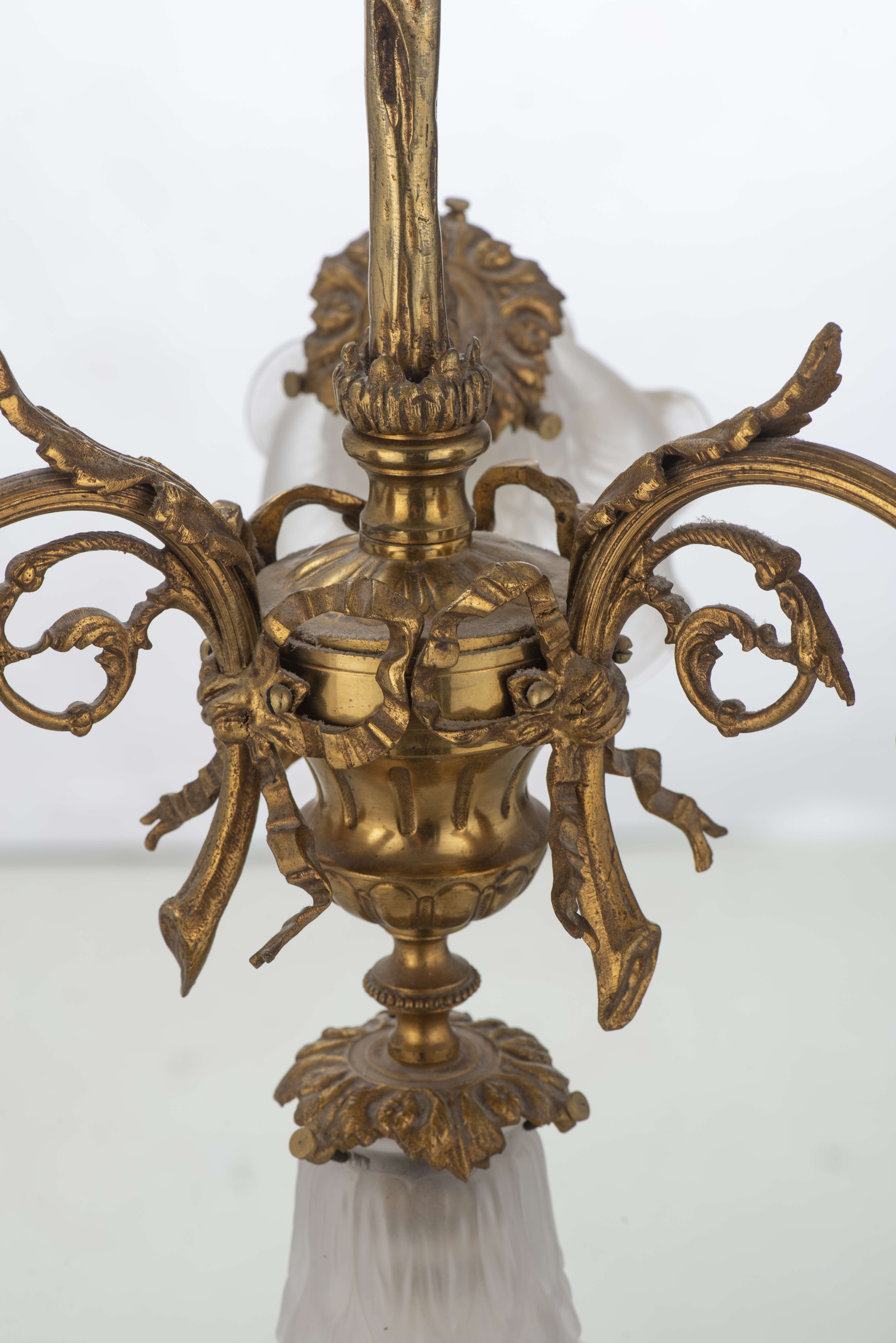 Lustre en bronze doré à 4 feux, à abat-jour tulipe en verre poli. Art nouveau.