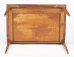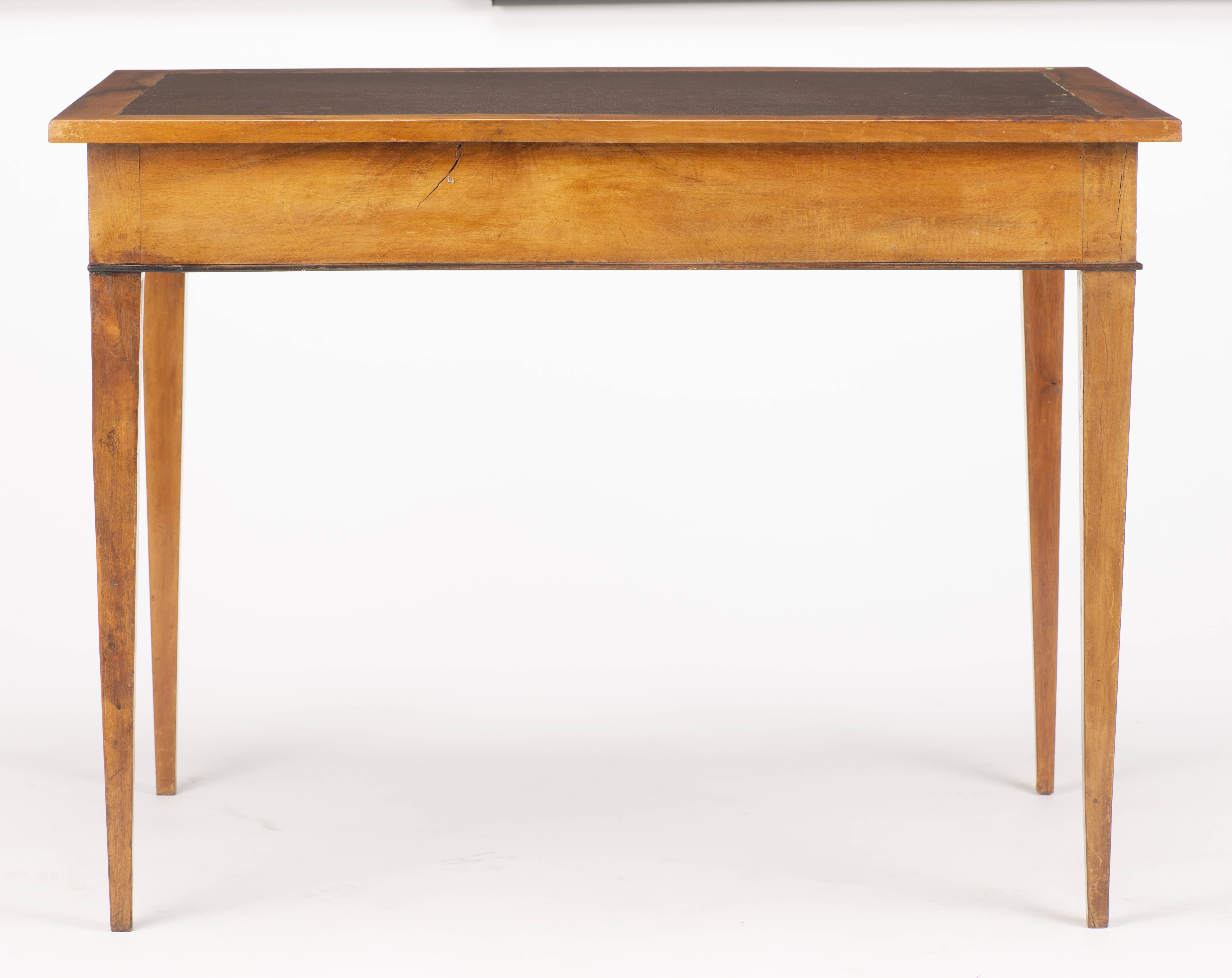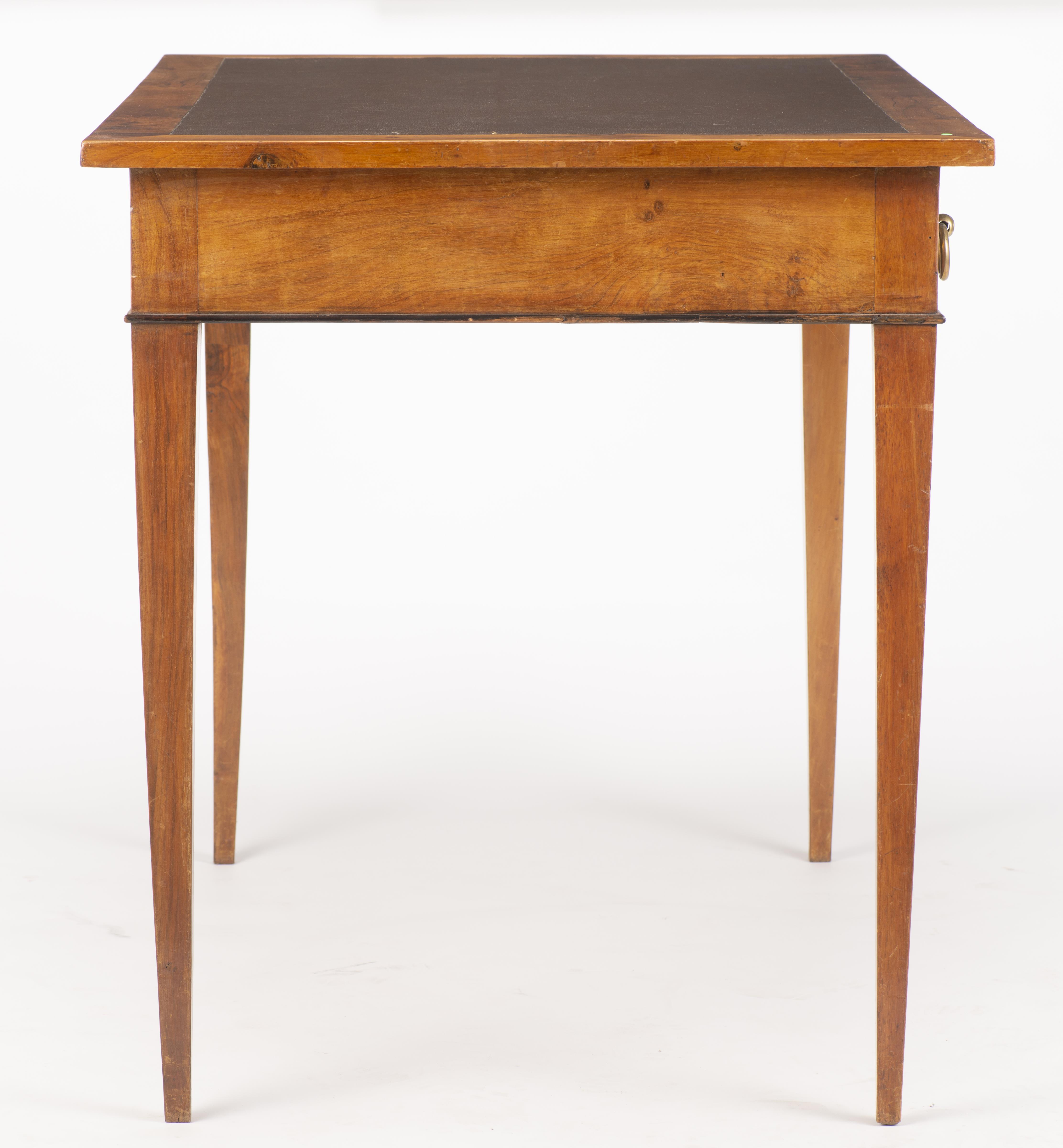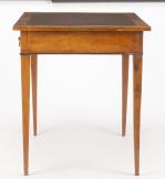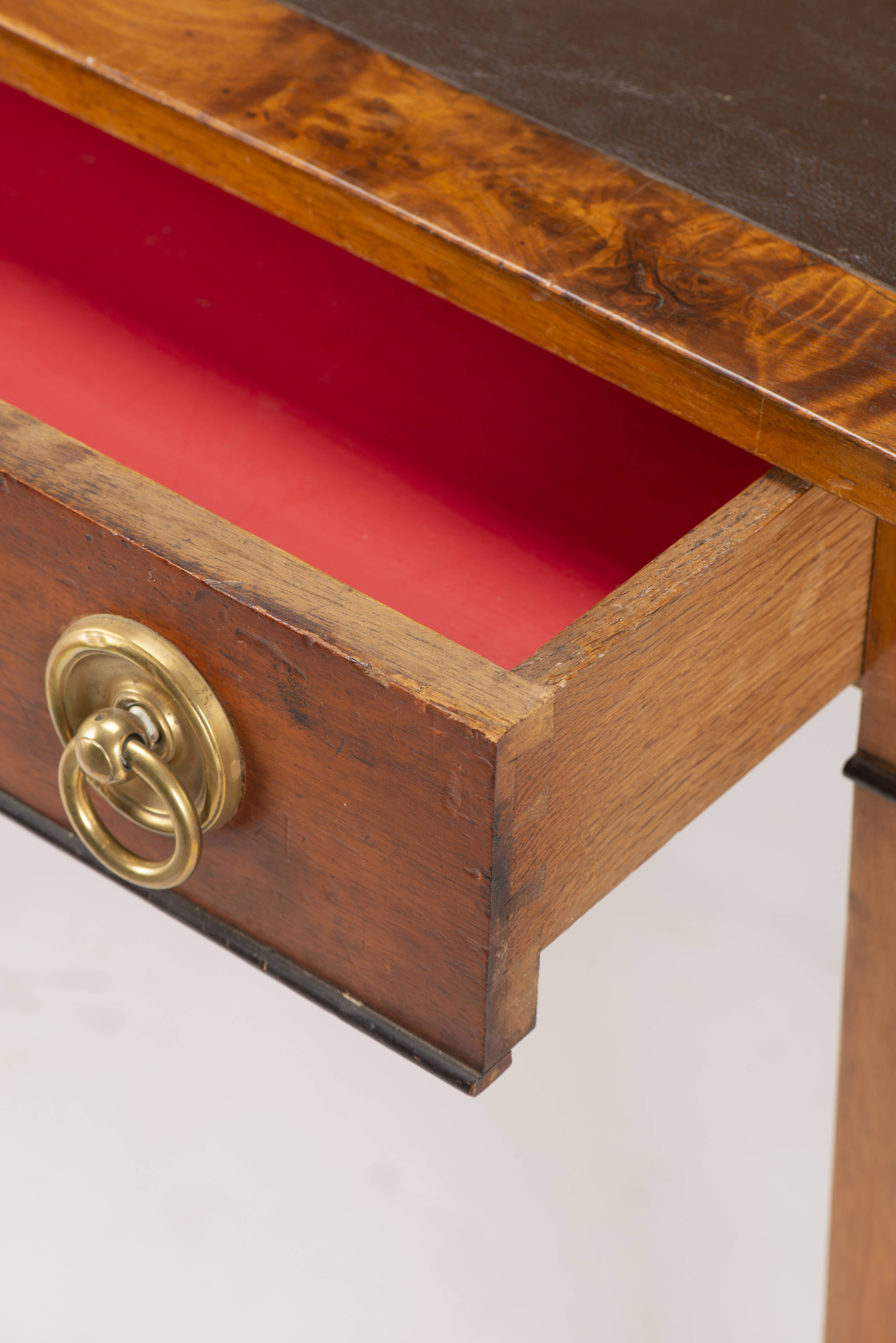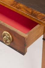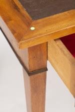 Petite table de bureau en acajou à bâti en chêne, plateau recouvert d'un tissu ciré brun, un tiroir en façade dans le bandeau. Liseré noir délimitant le bas du bandeau.