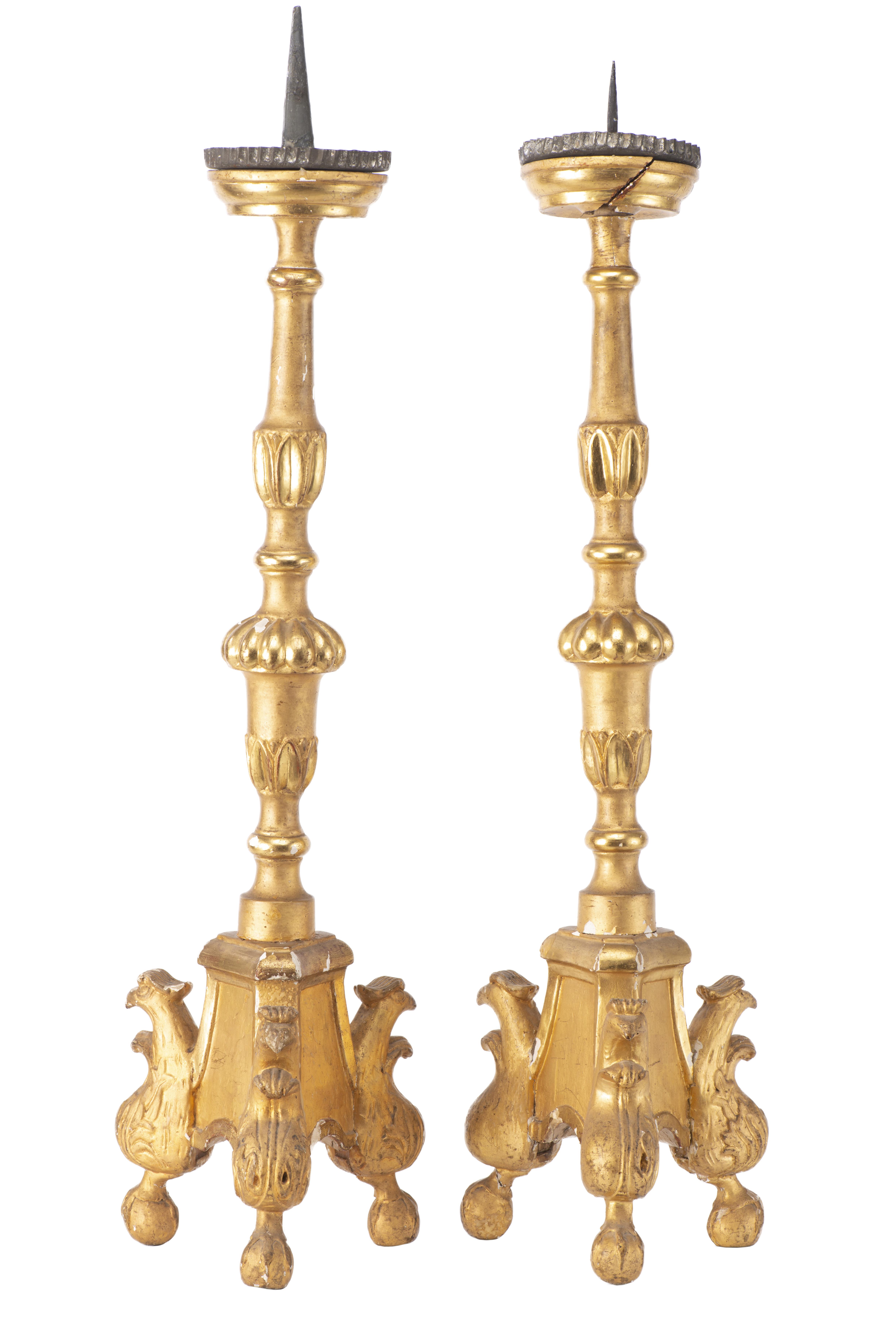 Paire de bougeoirs d'église en bois doré terminés par trois pieds en forme d'oiseaux. Italie XIXe.