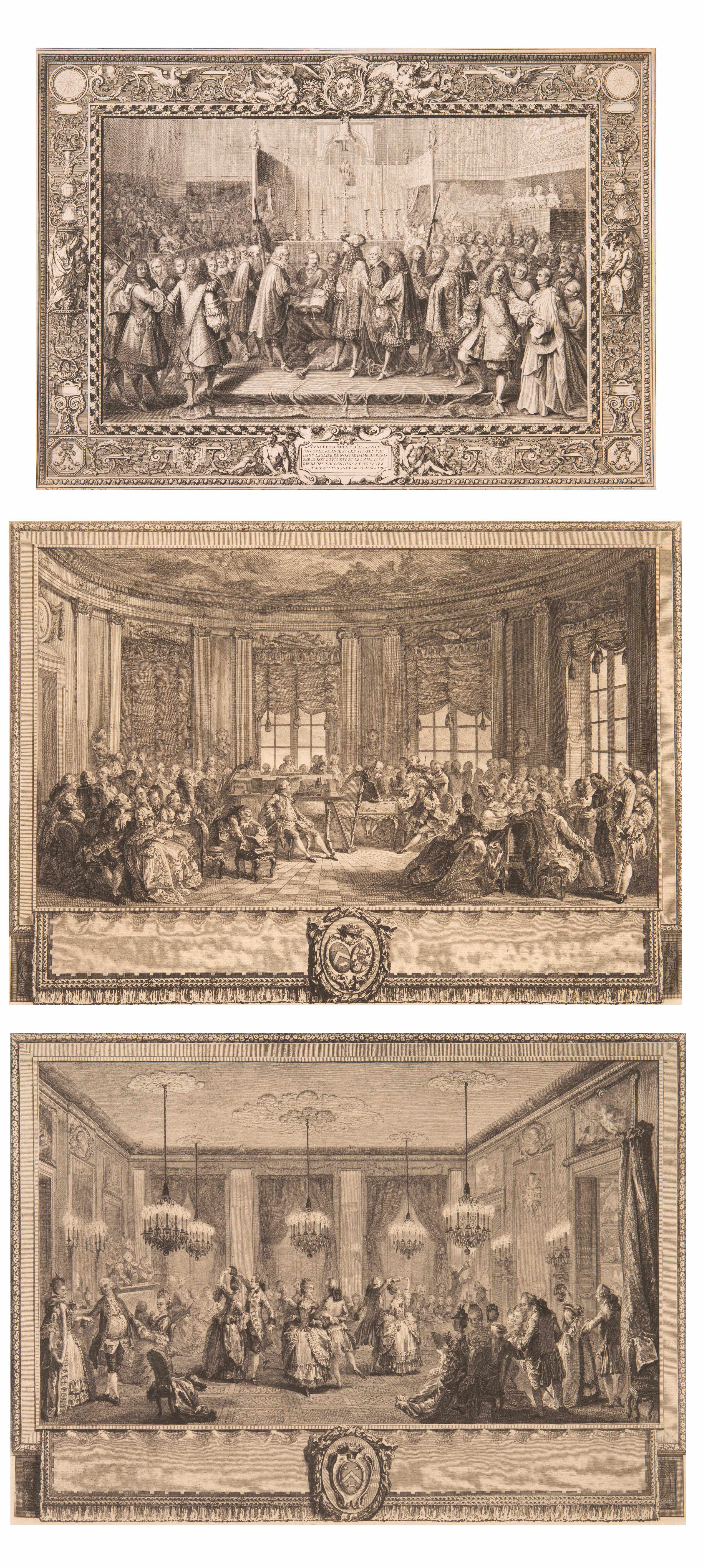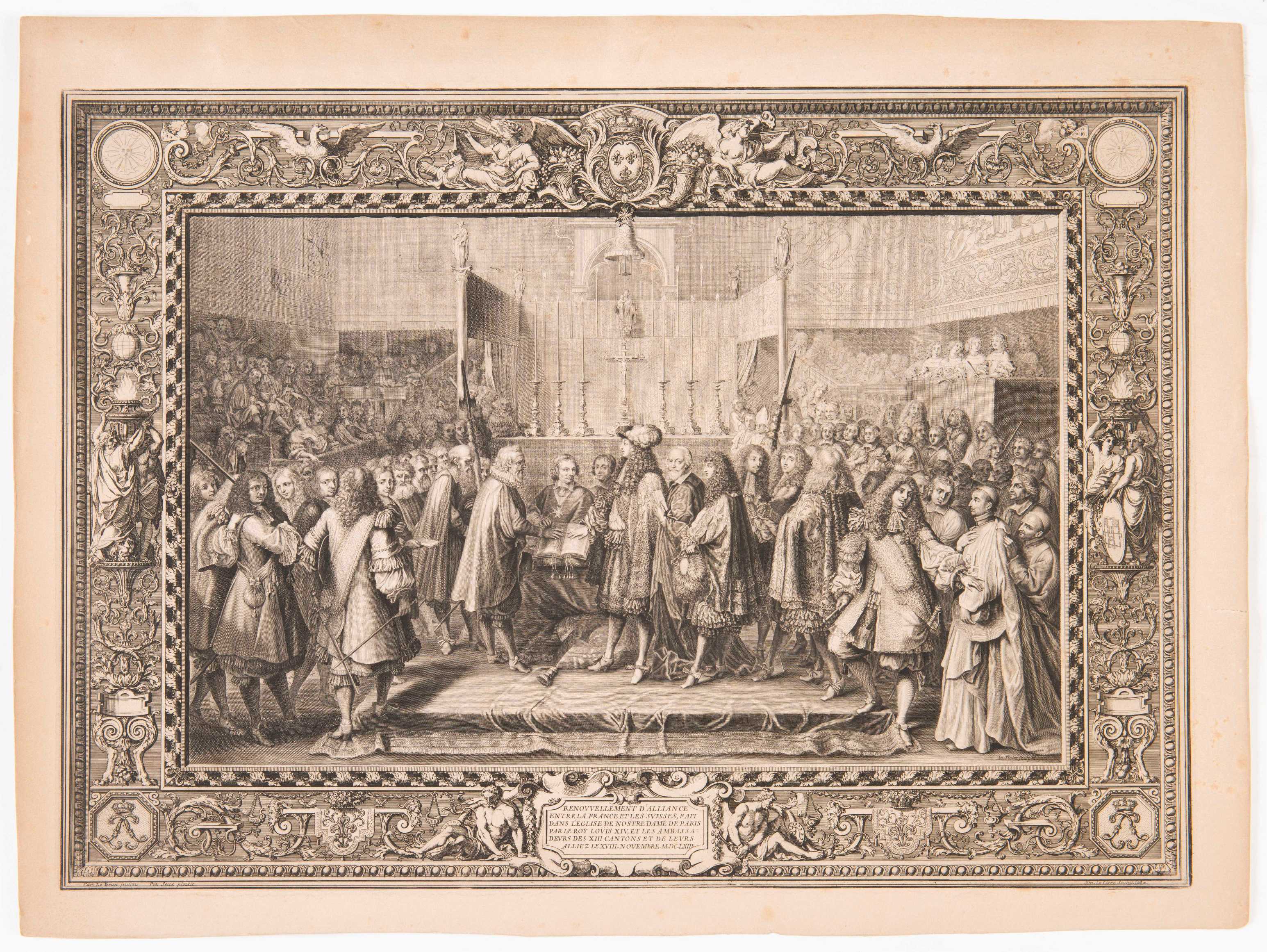 On y joint une gravure du renouvellement d'Alliance entre la France et les Suisses, fait dans l'Eglise de Notre Dame de Paris par le Roy Louis XIV, et les ambassadeurs des XIII cantons et de leurs alliez le XVIII novembre MDCLXIII, dessiné par Le Brun Jnuen et gravé en 1680 par Le Clerc.