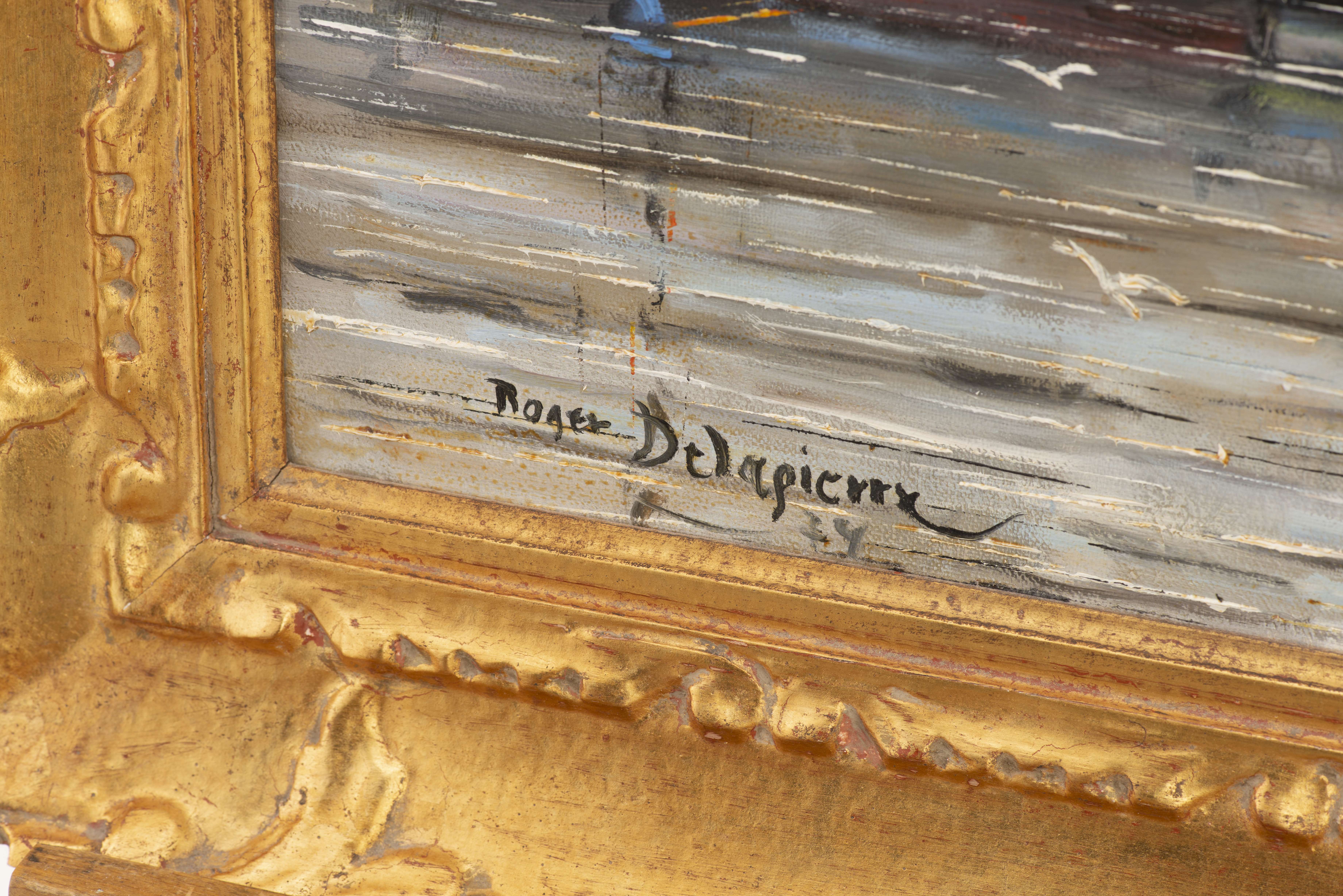 Roger DELAPIERRE (né en 1935) "Port de Genève". Huile sur toile sbg.