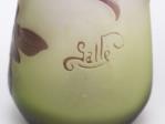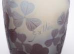 - 1 vase à panse légèrement arrondie, col droit et lèvre évasée, à décor de fleurs et trèfles à 3 feuilles violets sur fond gris, H. 12.5 cm
