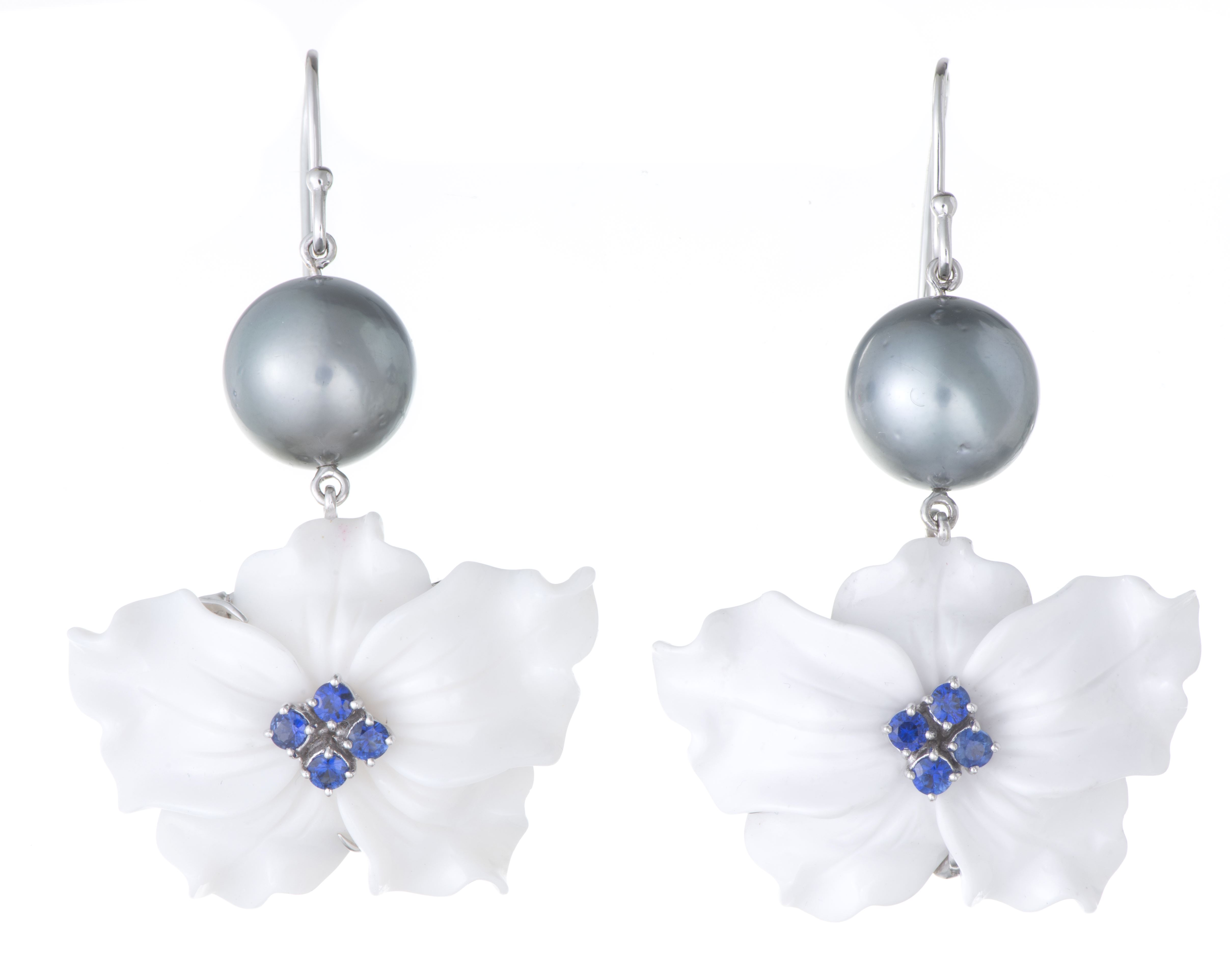 Paire de pendants d'oreilles sur or .750 en forme de fleur avec étamines à 4 saphirs bleus, pétales en agate blanche, une perle de Tahiti de diam. 12 mm.