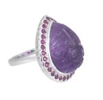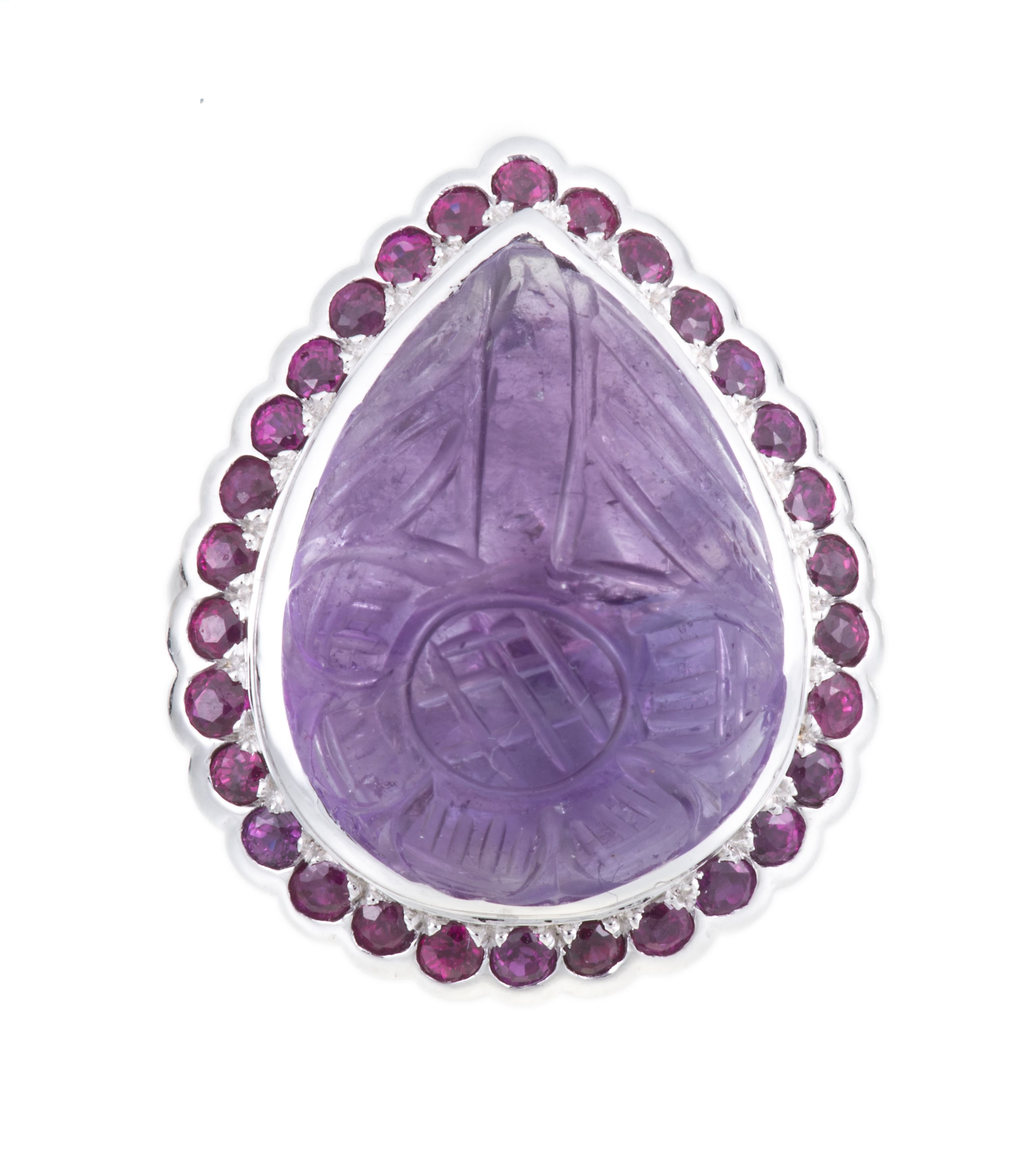 Bague en or gris .750 avec une améthyste cabochon de env. 15 cts de forme poire, gravée d'une fleur, avec un entourage de 30 rubis sertis clos pour un total de 1.20 ct.