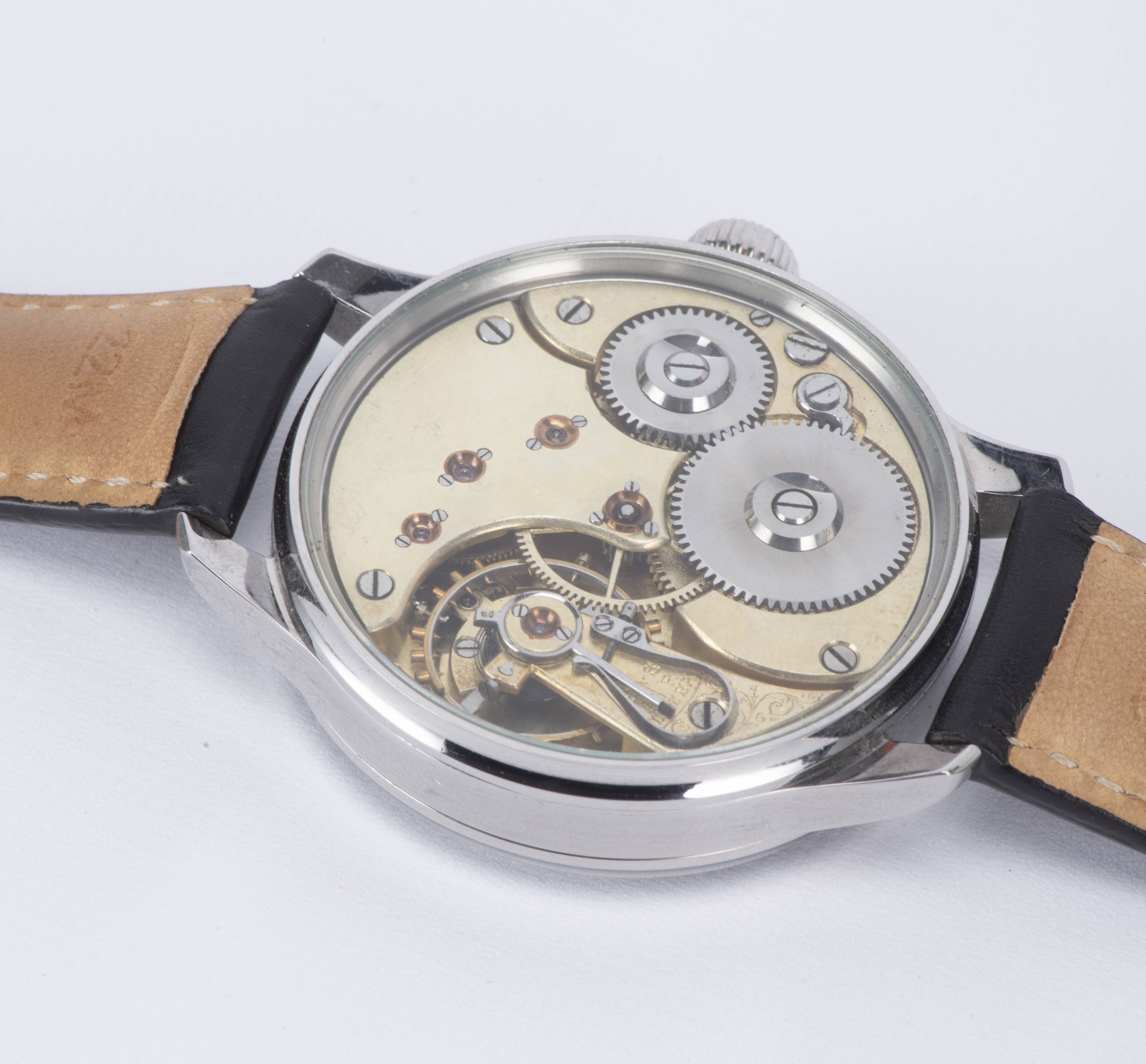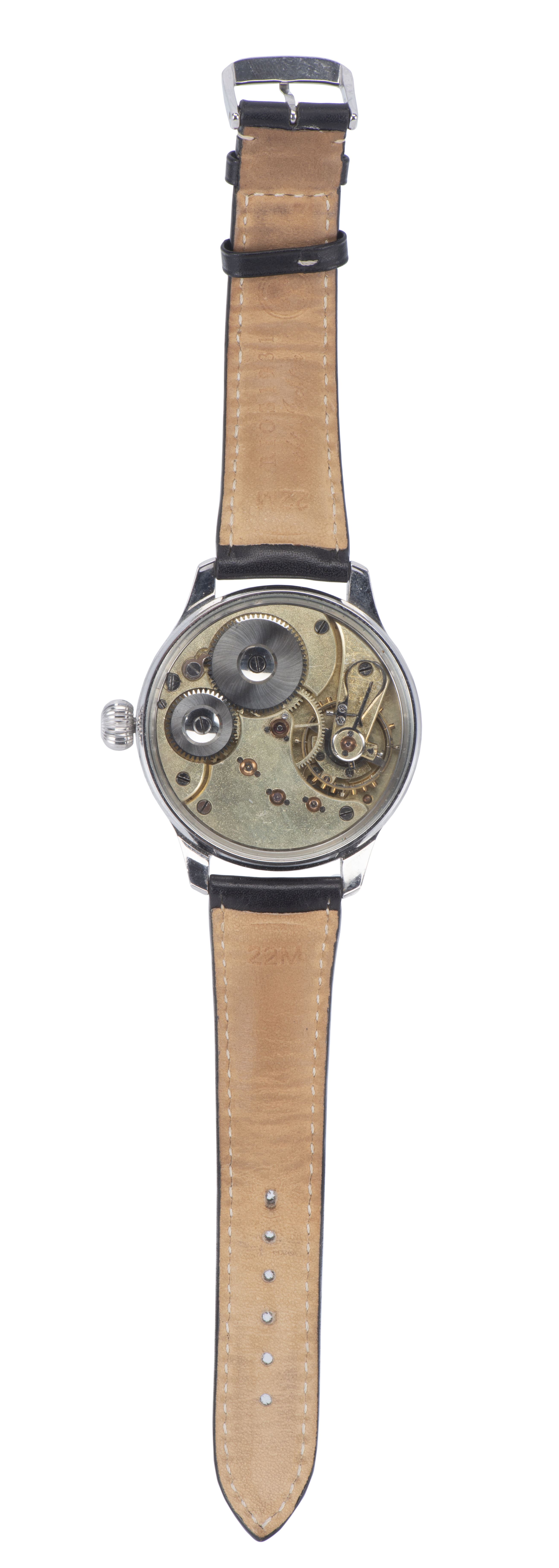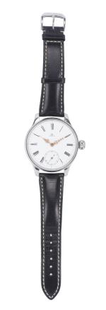 Omega, montre de poche transformée en montre-bracelet, mvt mécanique, cadran en émail blanc, chiffres romains, cadran des secondes à 6h, aiguilles dorées.