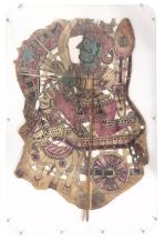 Marionnette Wayan Kulit or Shadow Puppet from Java, Indonesia, en bois et parchemin représentant Shiva sur un char avec son arc prêt à tirer des flèches.