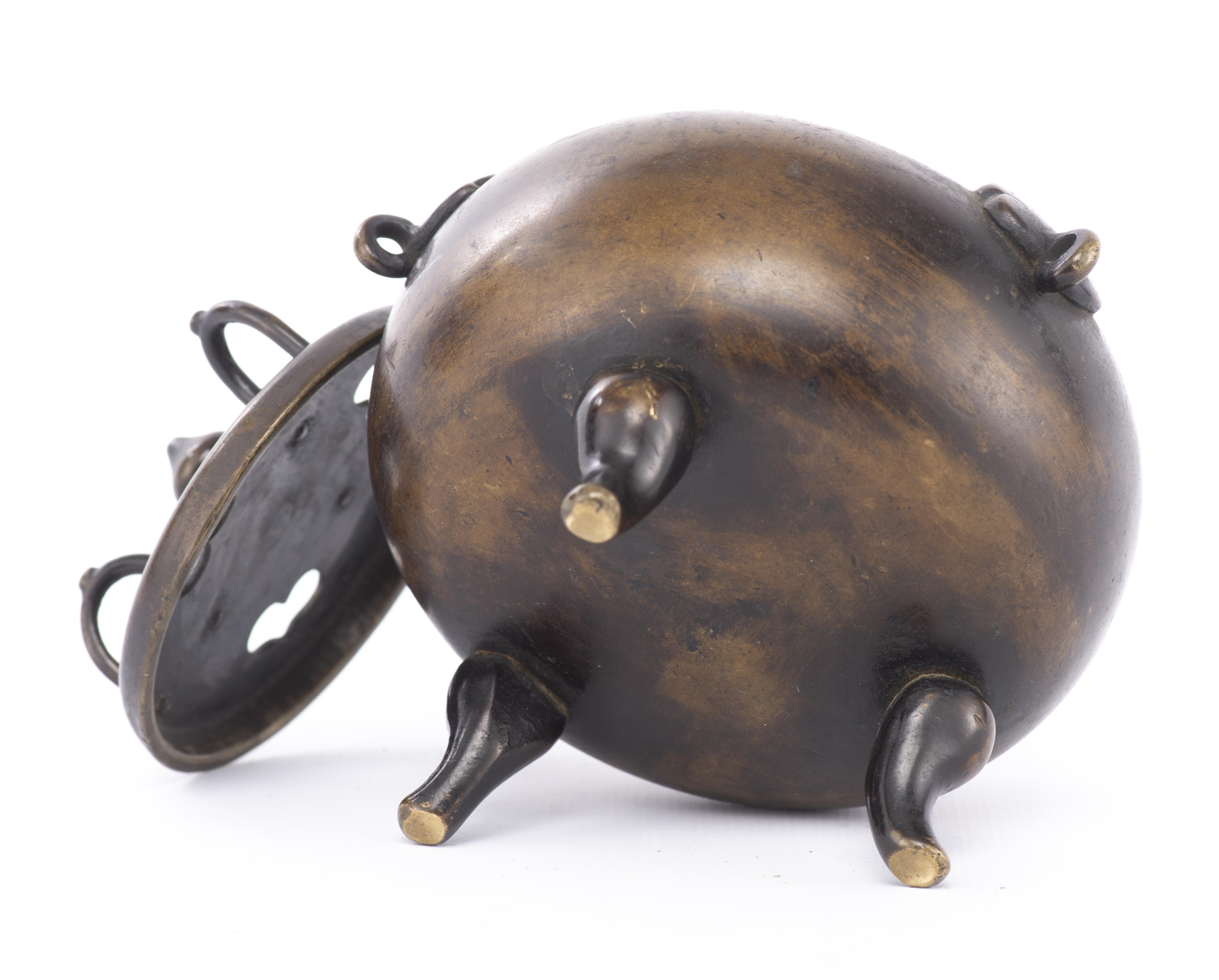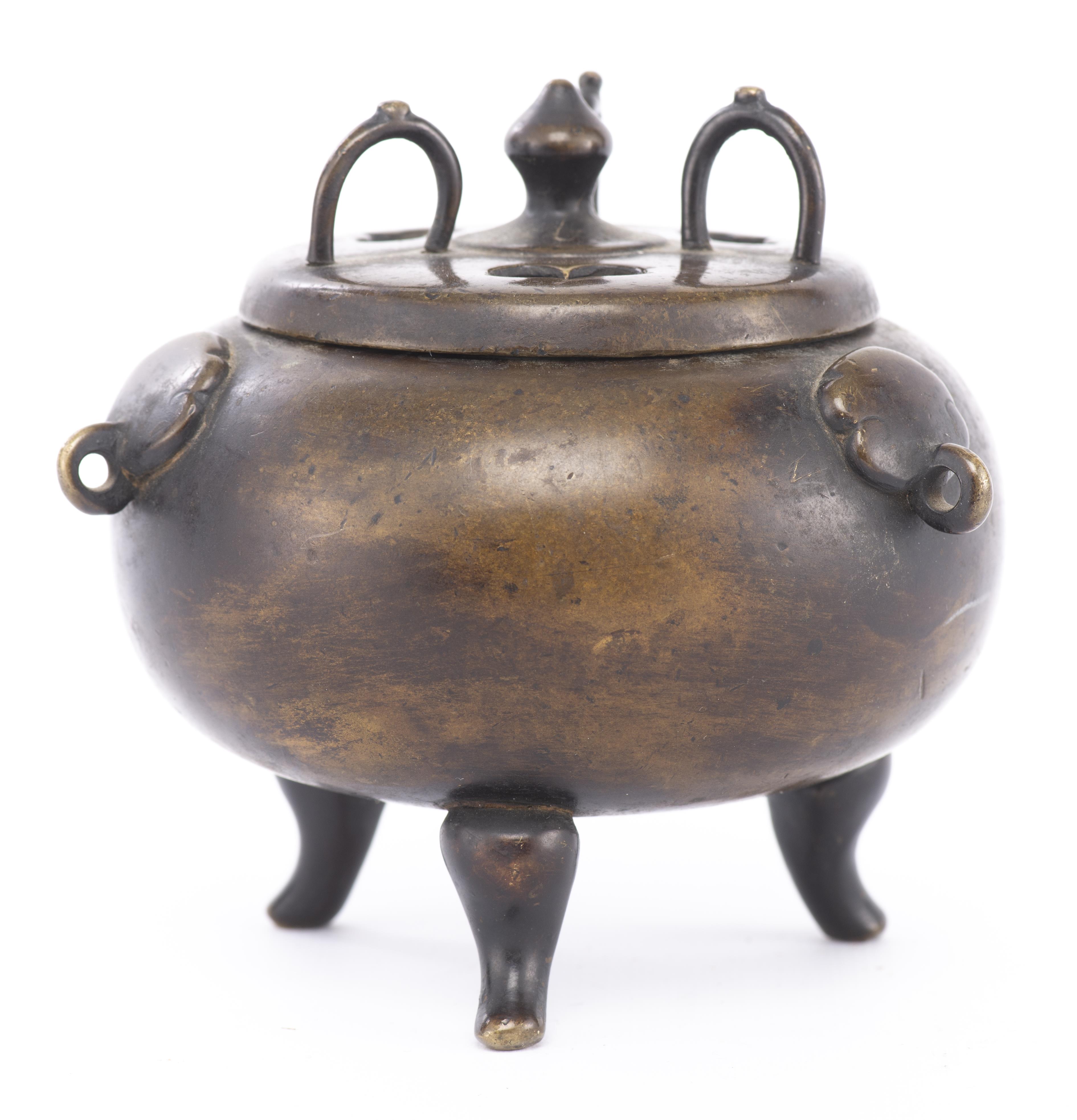 Brûle-parfum tripode en bronze de Chine à 3 anses, couvercle ajouré de 3 cœurs et orné de 3 boucles.