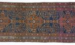 Tapis Tabriz de passage à 5 médaillons de fleurs sur champ rouge sur champ principal bleu à décor de tiges végétales, bordure principale à frise florale sur champvert. Ancien.