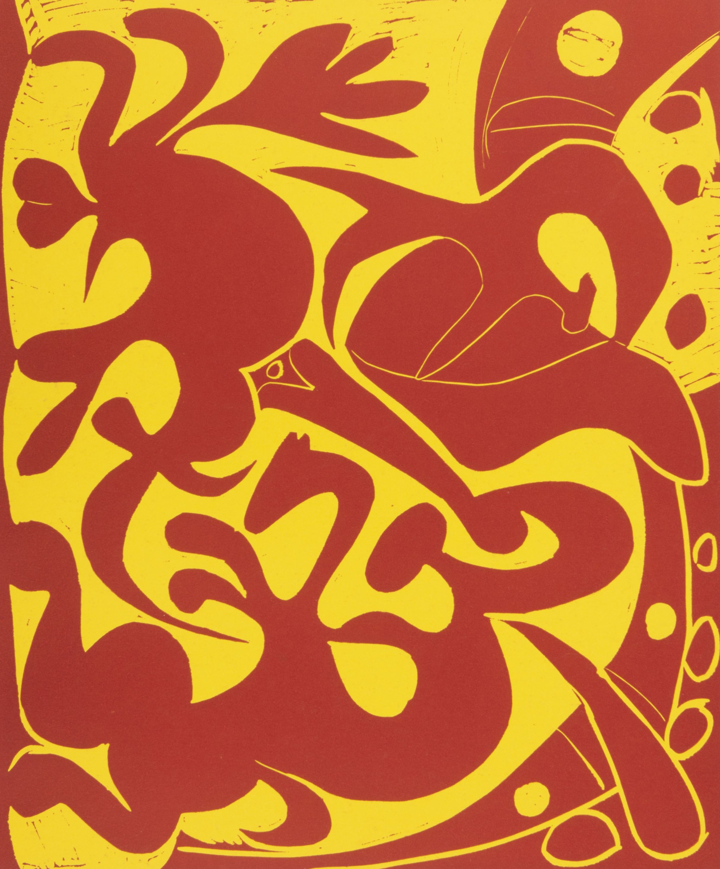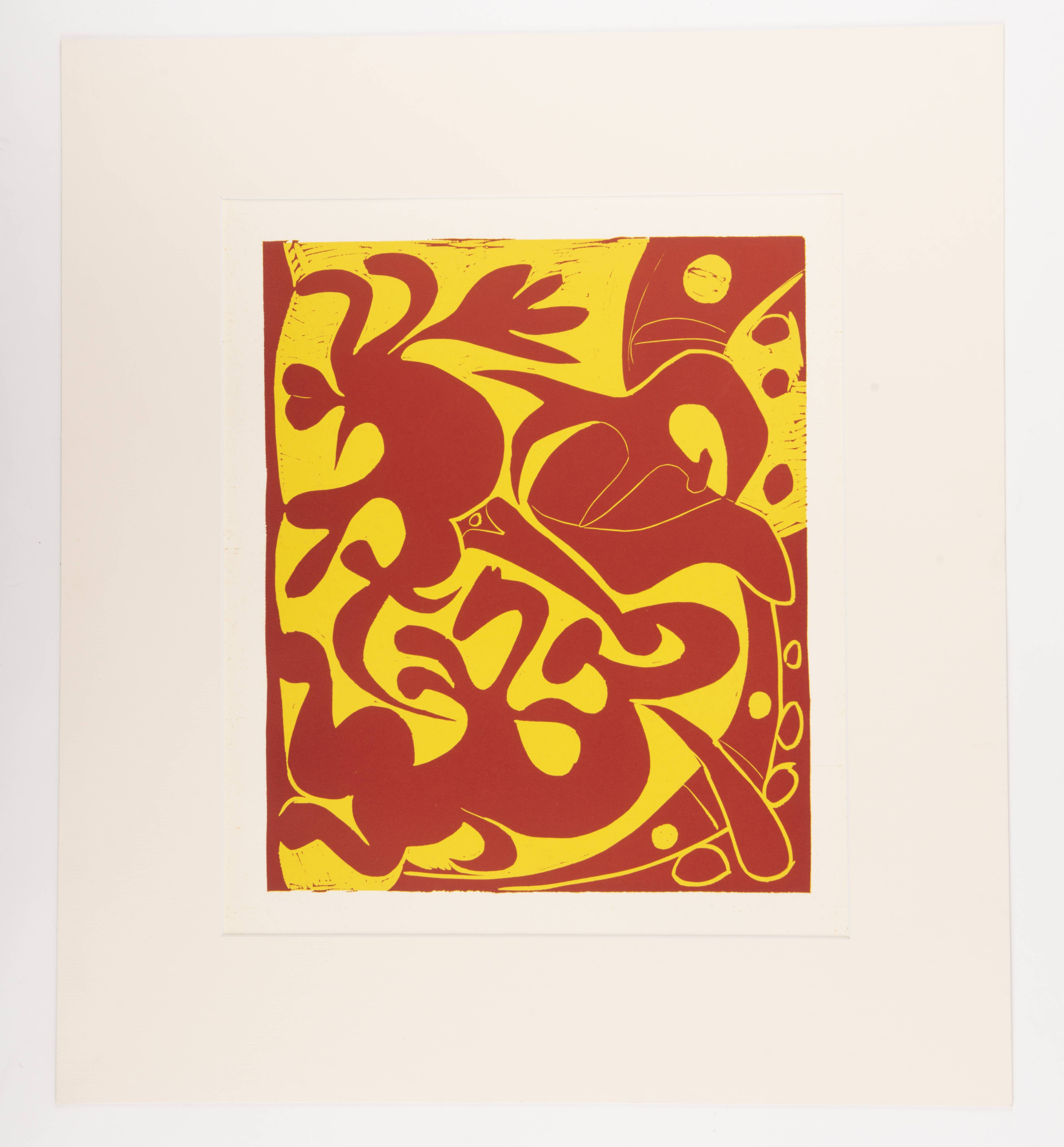 Pablo PICASSO (1881-1973, d'après) "Pique (rouge et jaune)", linogravure, édition le Cercle d'art, 1959.
