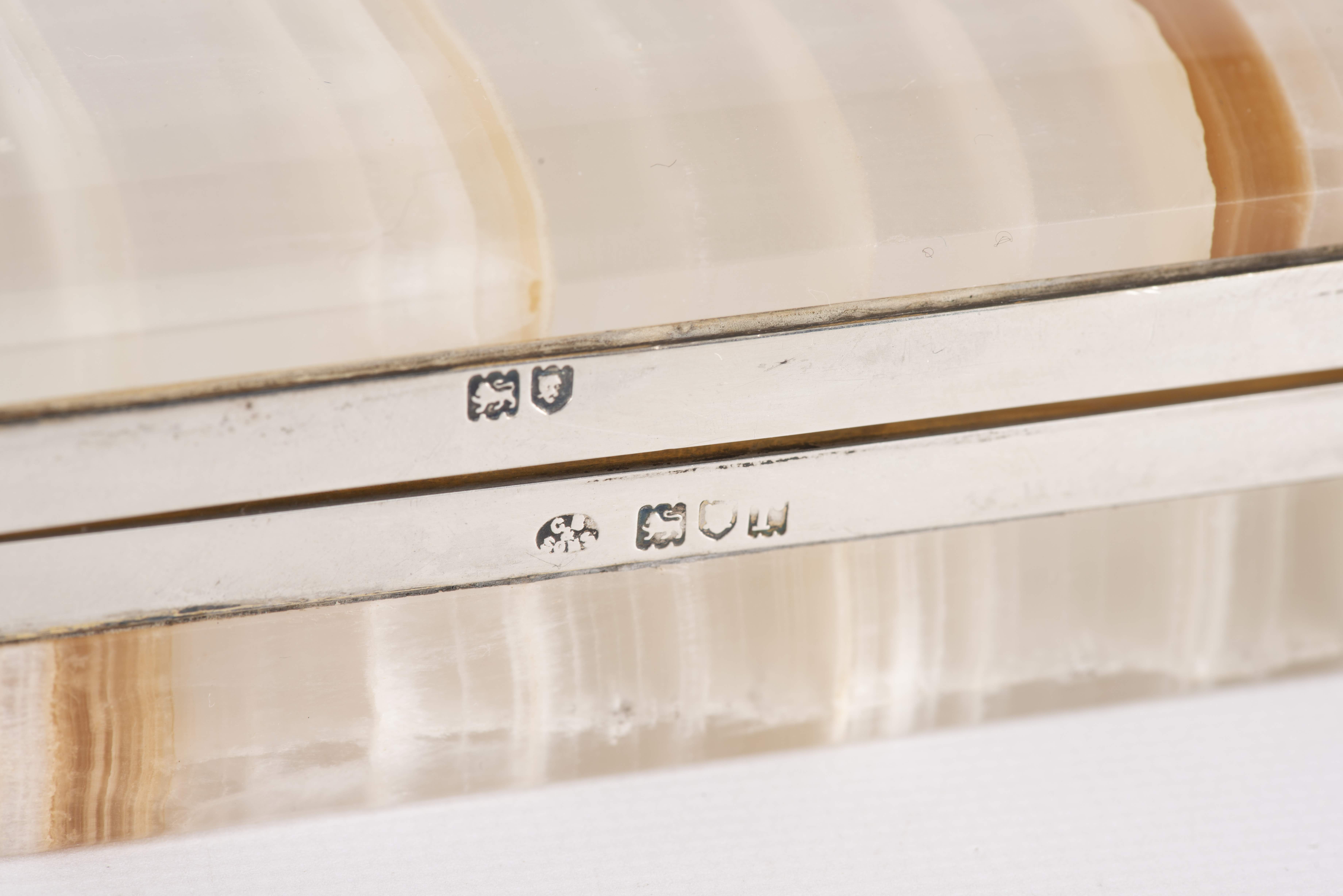 Boîte porte-plume en agate et argent anglais .925 sterling de Londres de 1912 par GB & Sons. Trois compartiments intérieurs partiellement en vermeil.