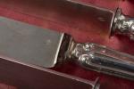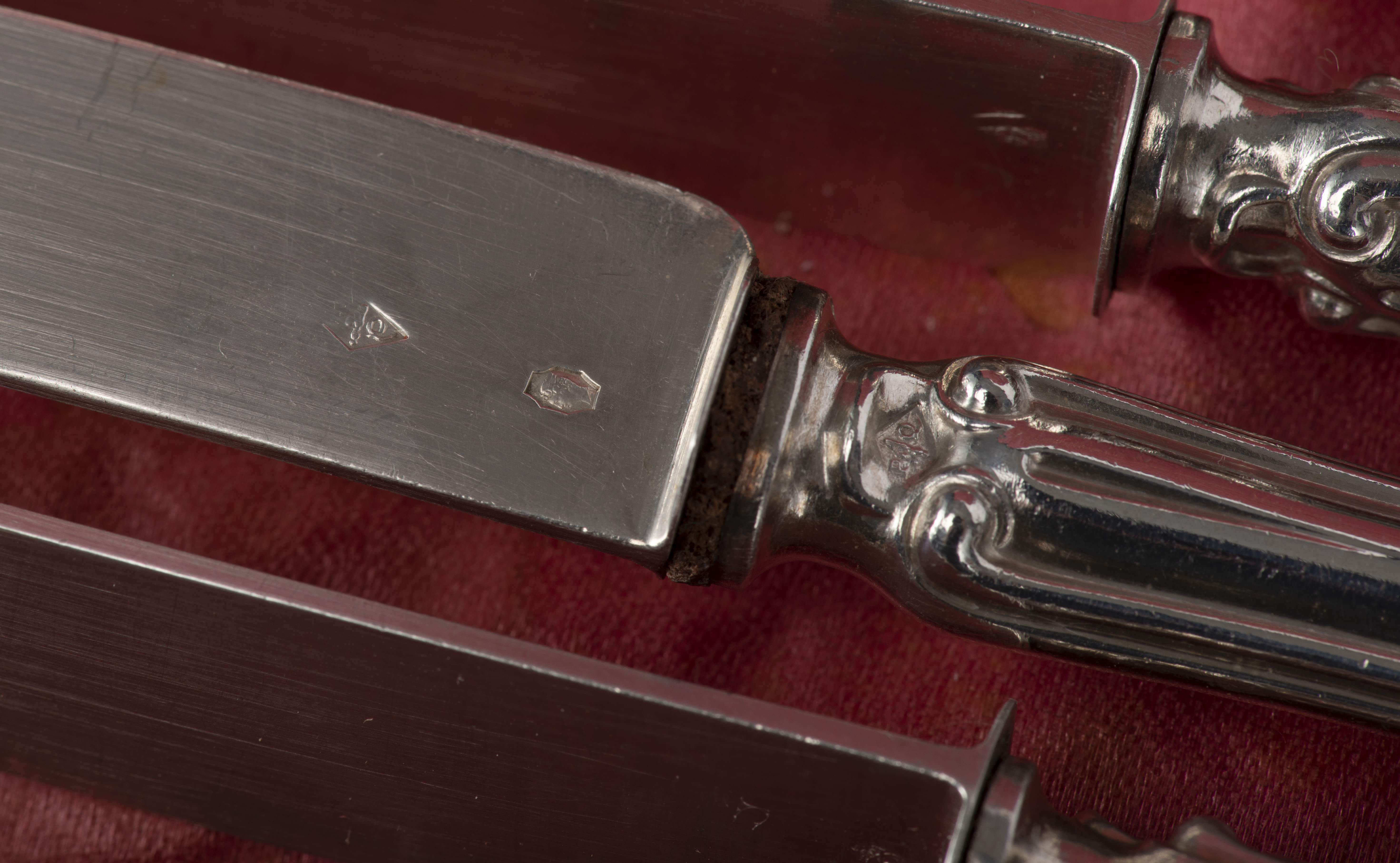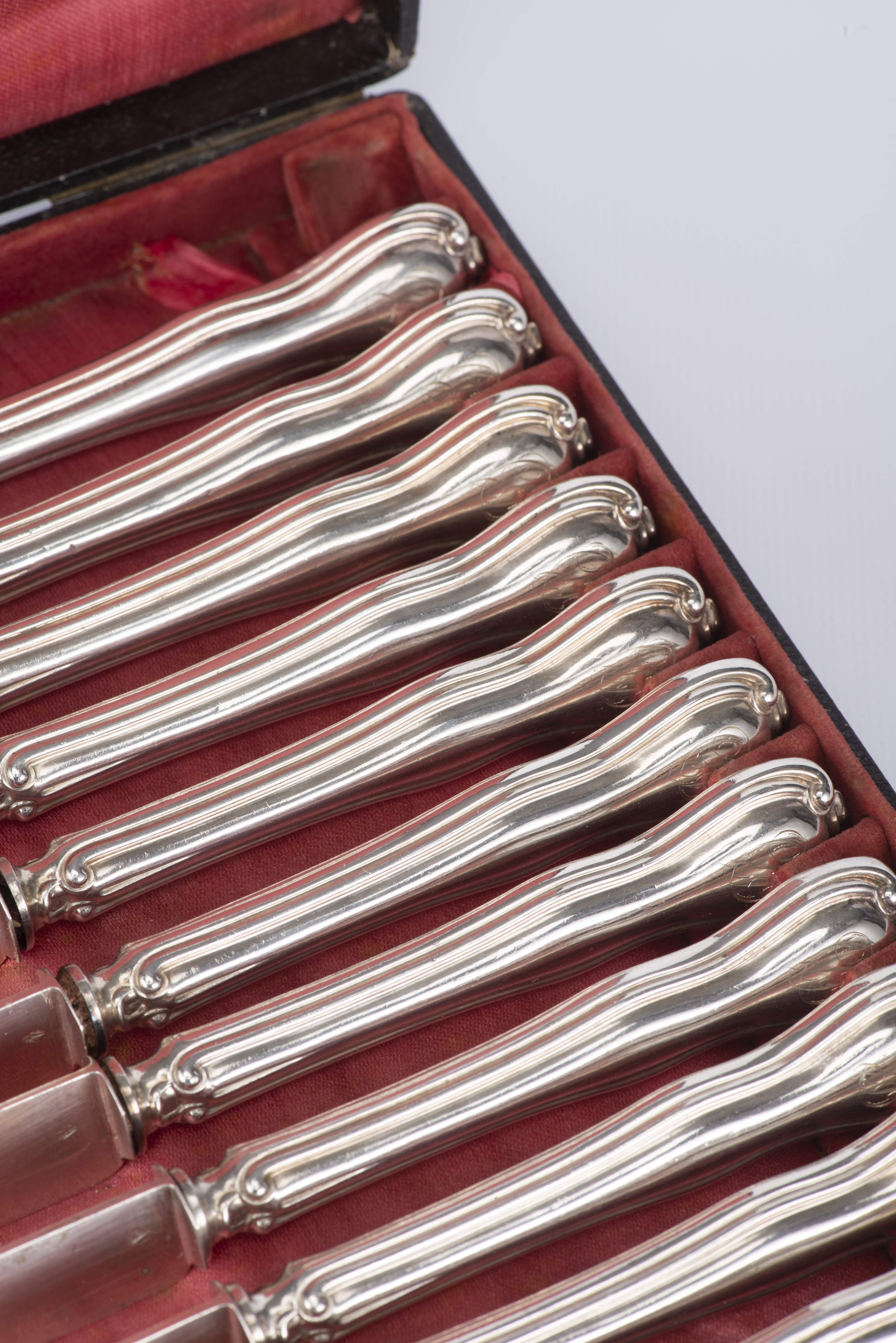 Onze couteaux à dessert, manche en argent français 2e titre fourré avec lame en argent 2ème titre Monogrammés sur le manche :"DL".