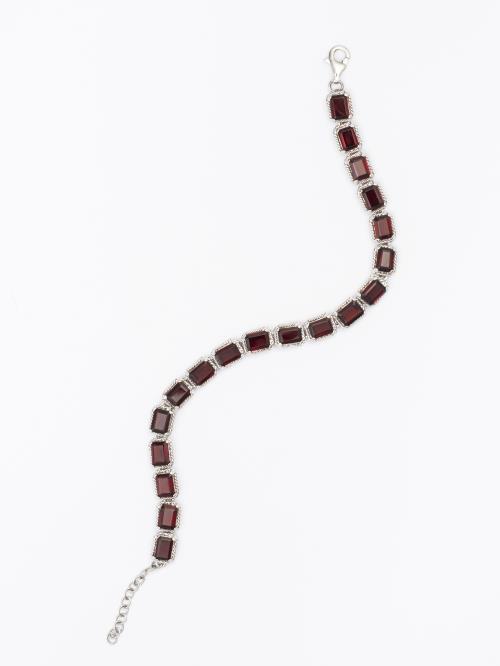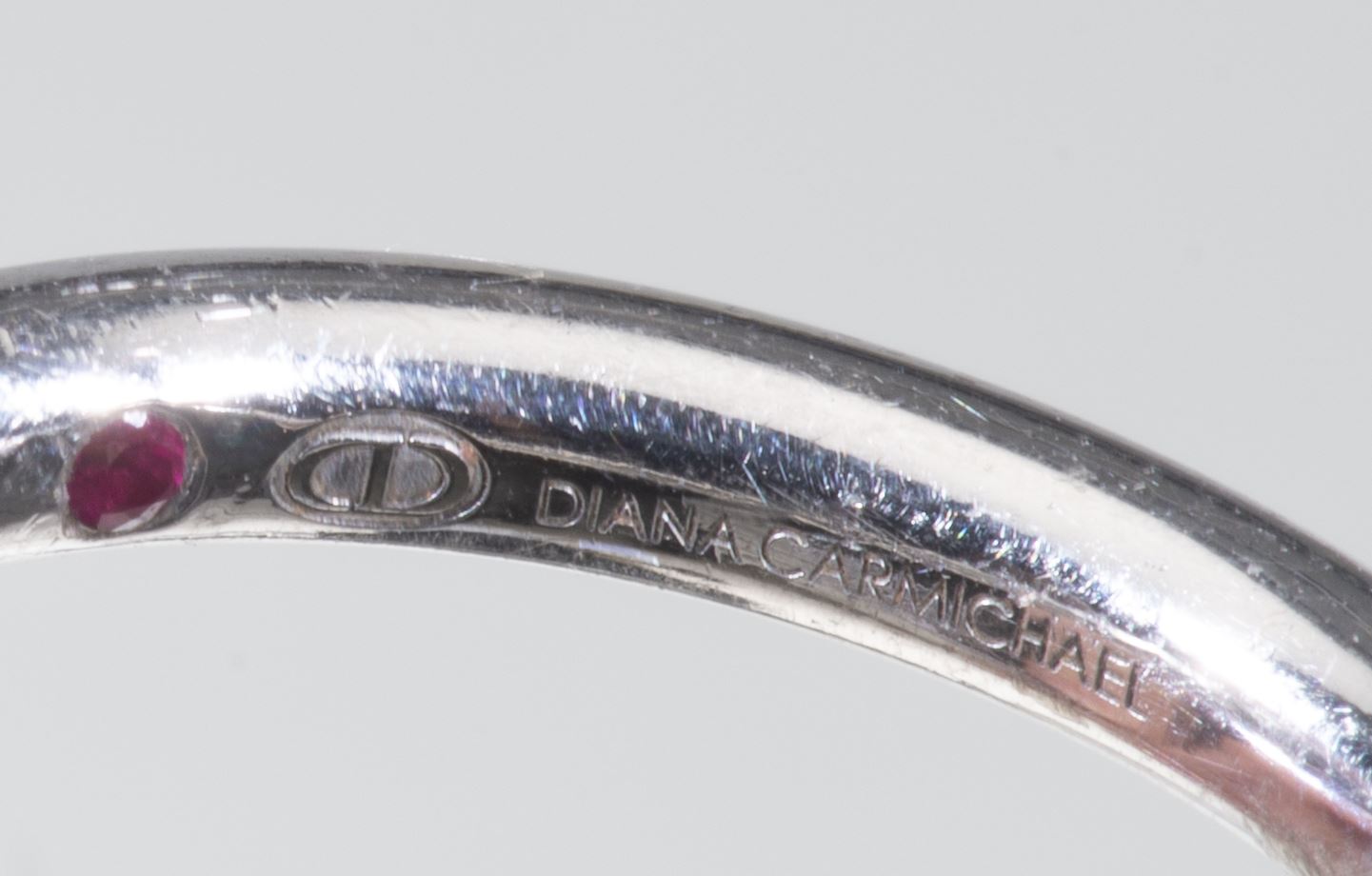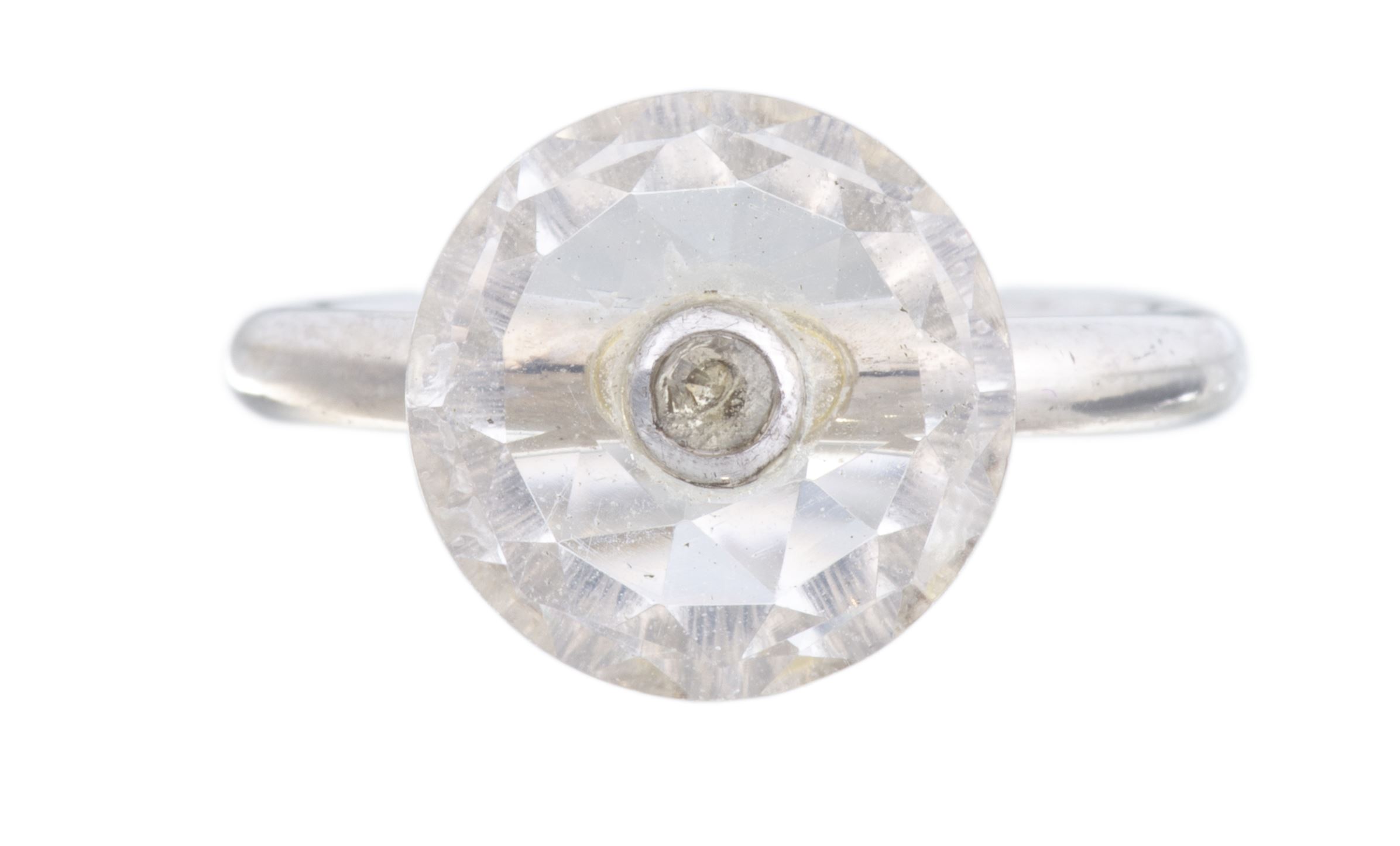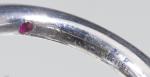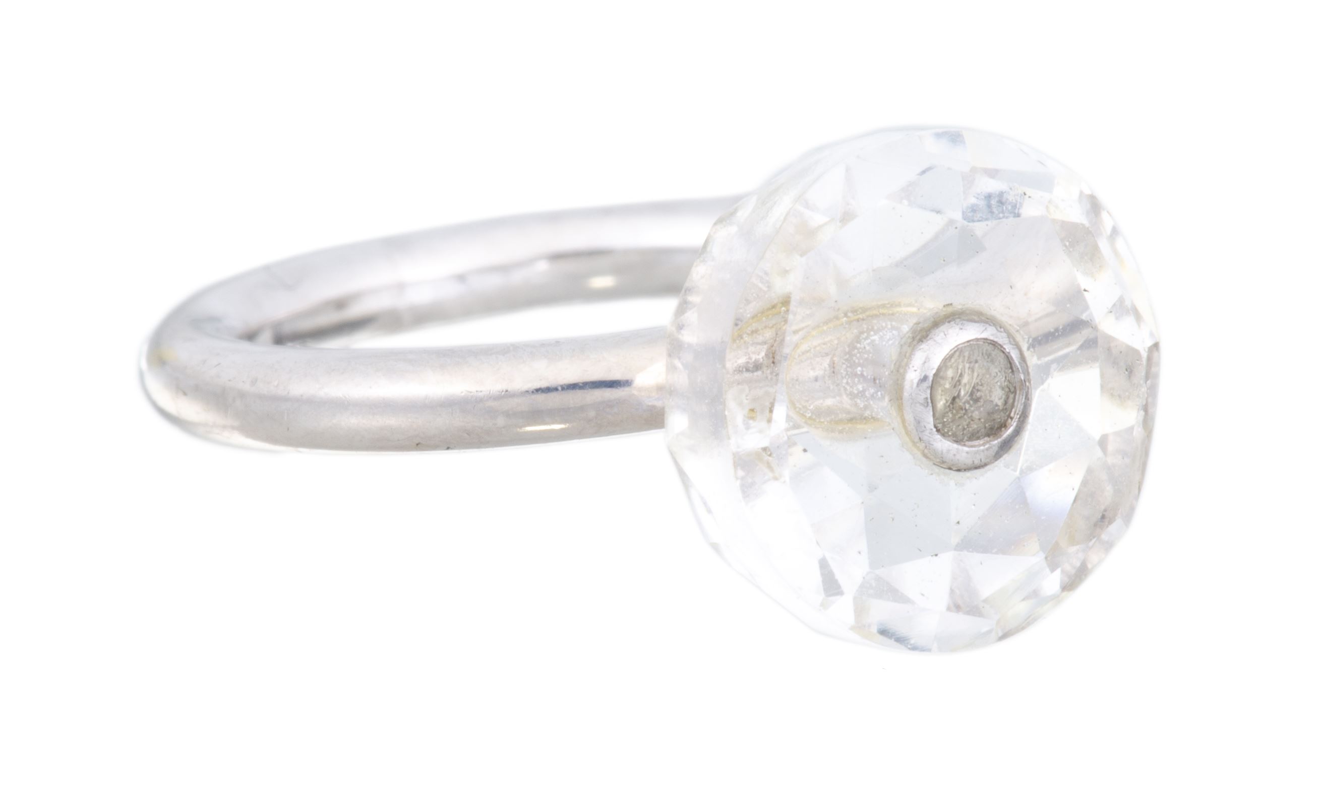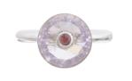 Diana Carmichael, deux bagues en argent avec, pour l'une, un cristal de roche facettée avec un saphir blanc au centre, et, pour l'autre, une améthyste facettée avec un rubis en son centre.