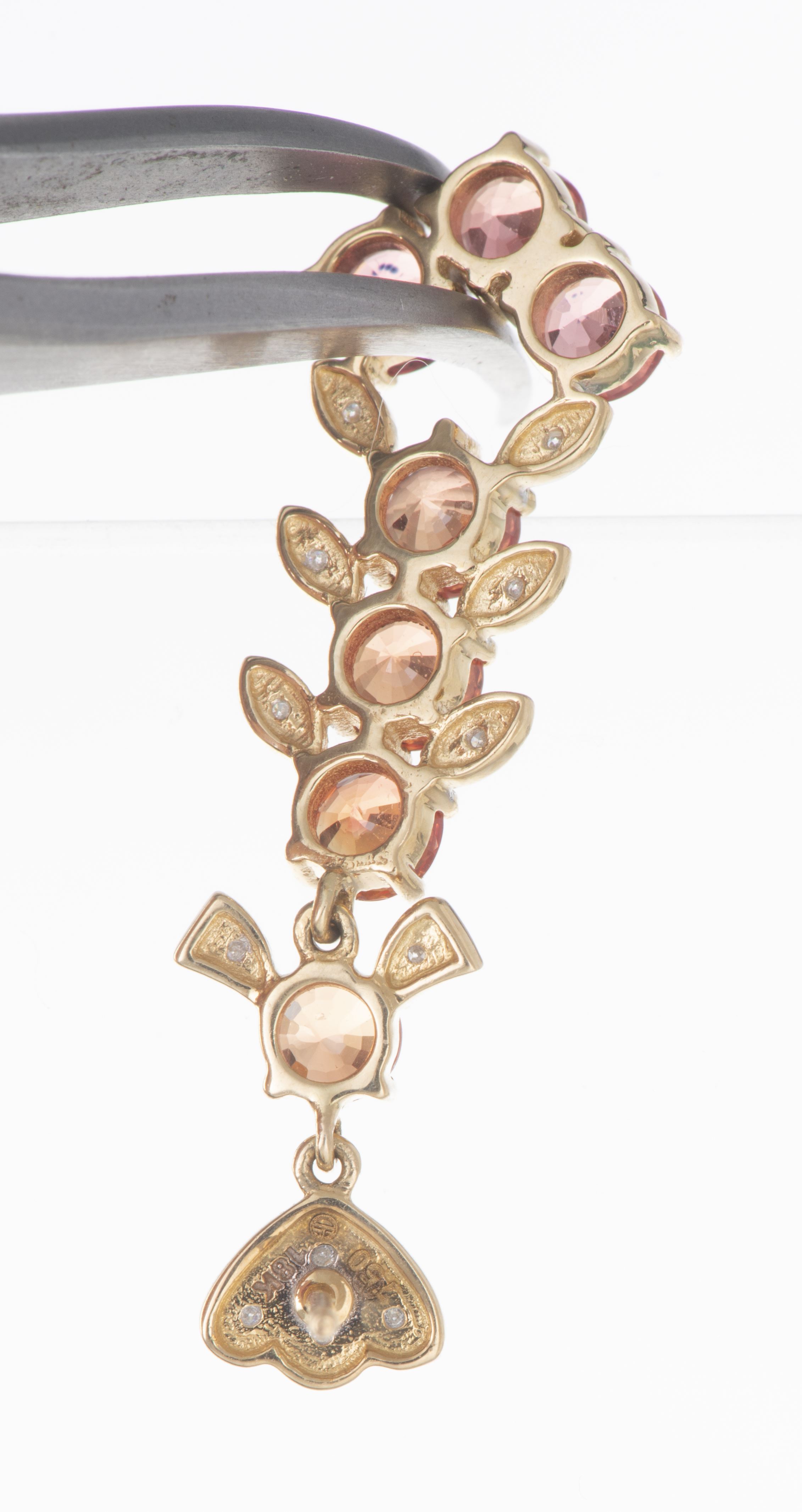 Paire de pendants d'oreilles en or blanc et or jaune .750 avec 24 diamants pour un total de 0.25 ct et 14 saphirs oranges pour un total de 4 cts.
