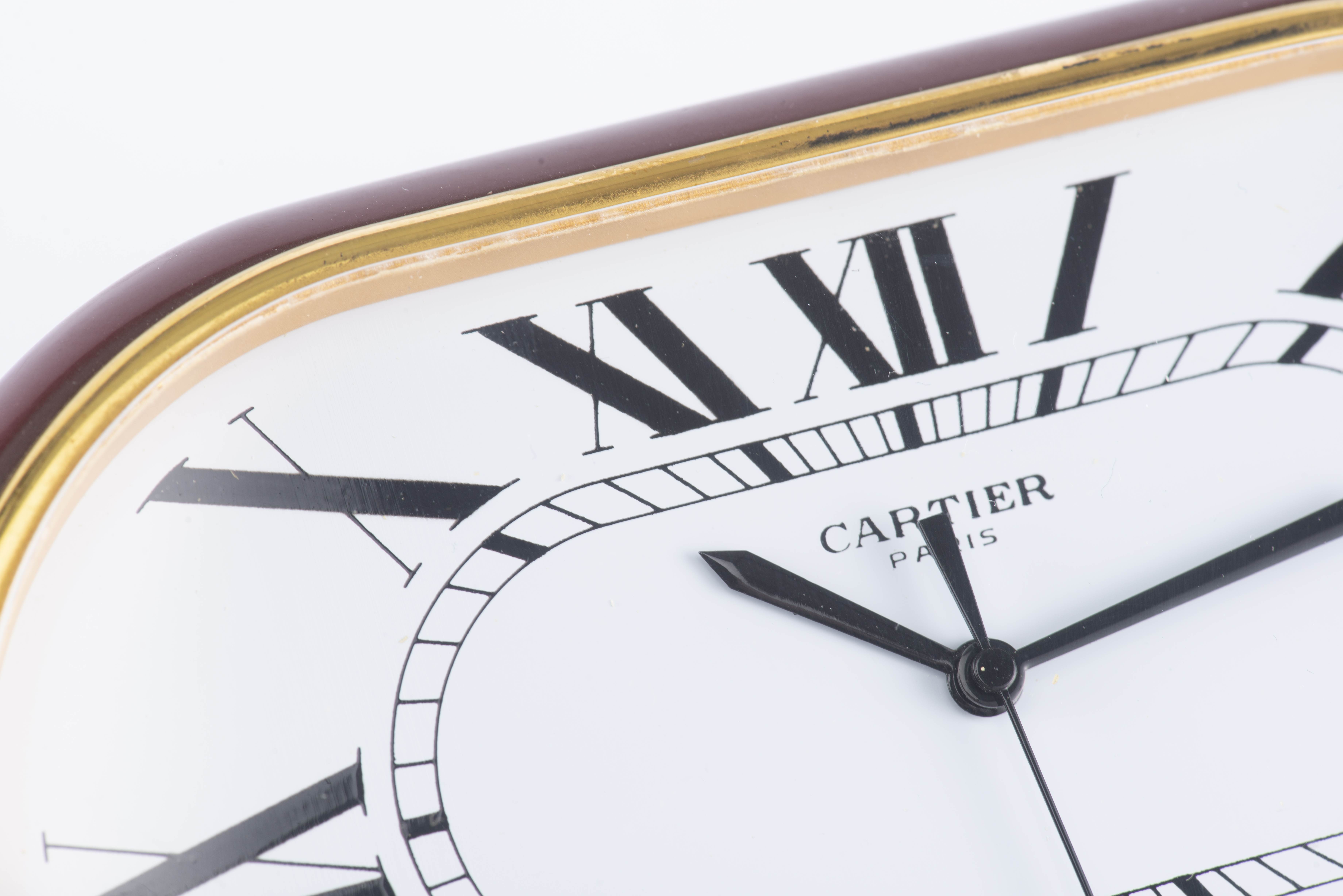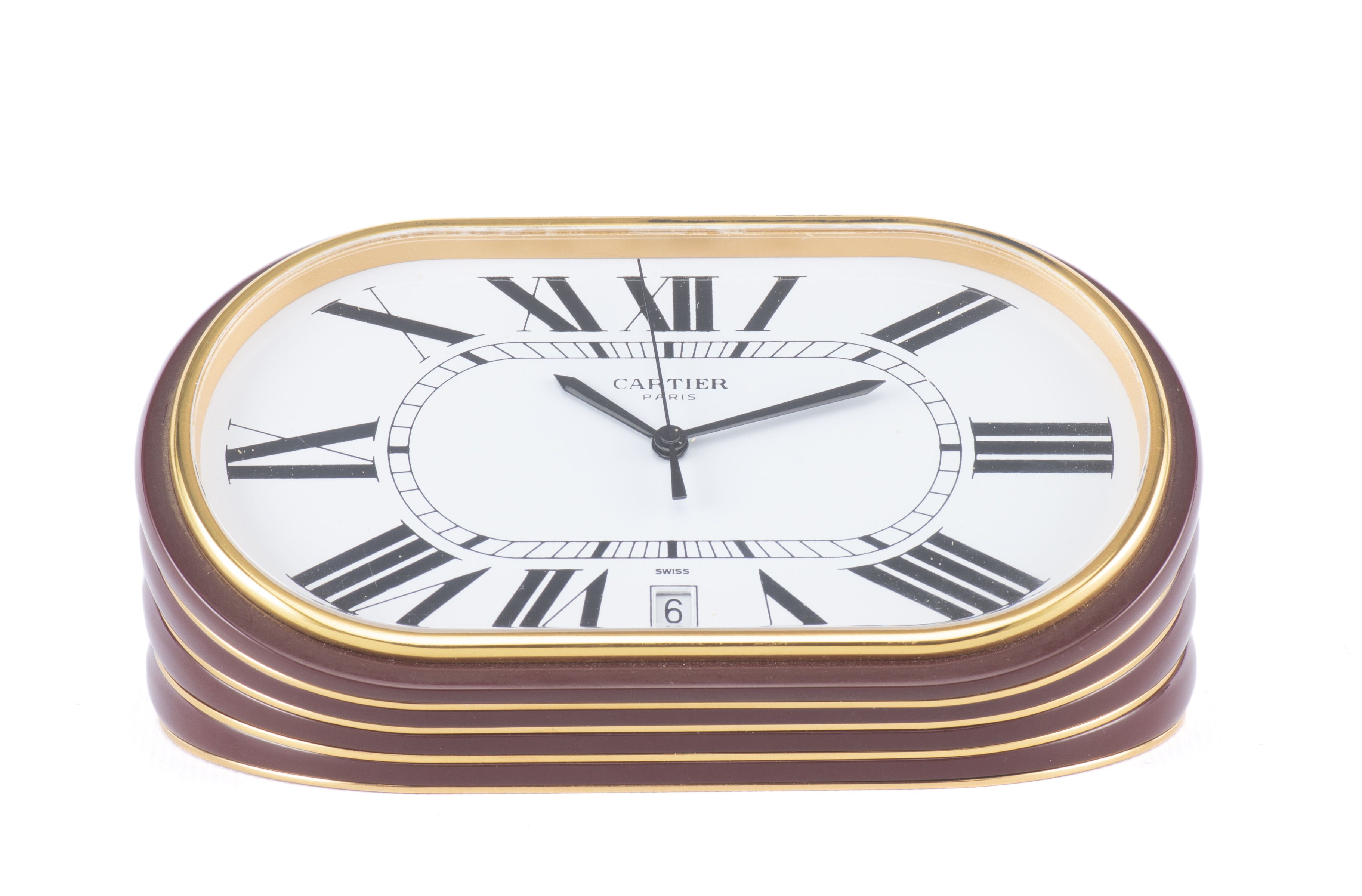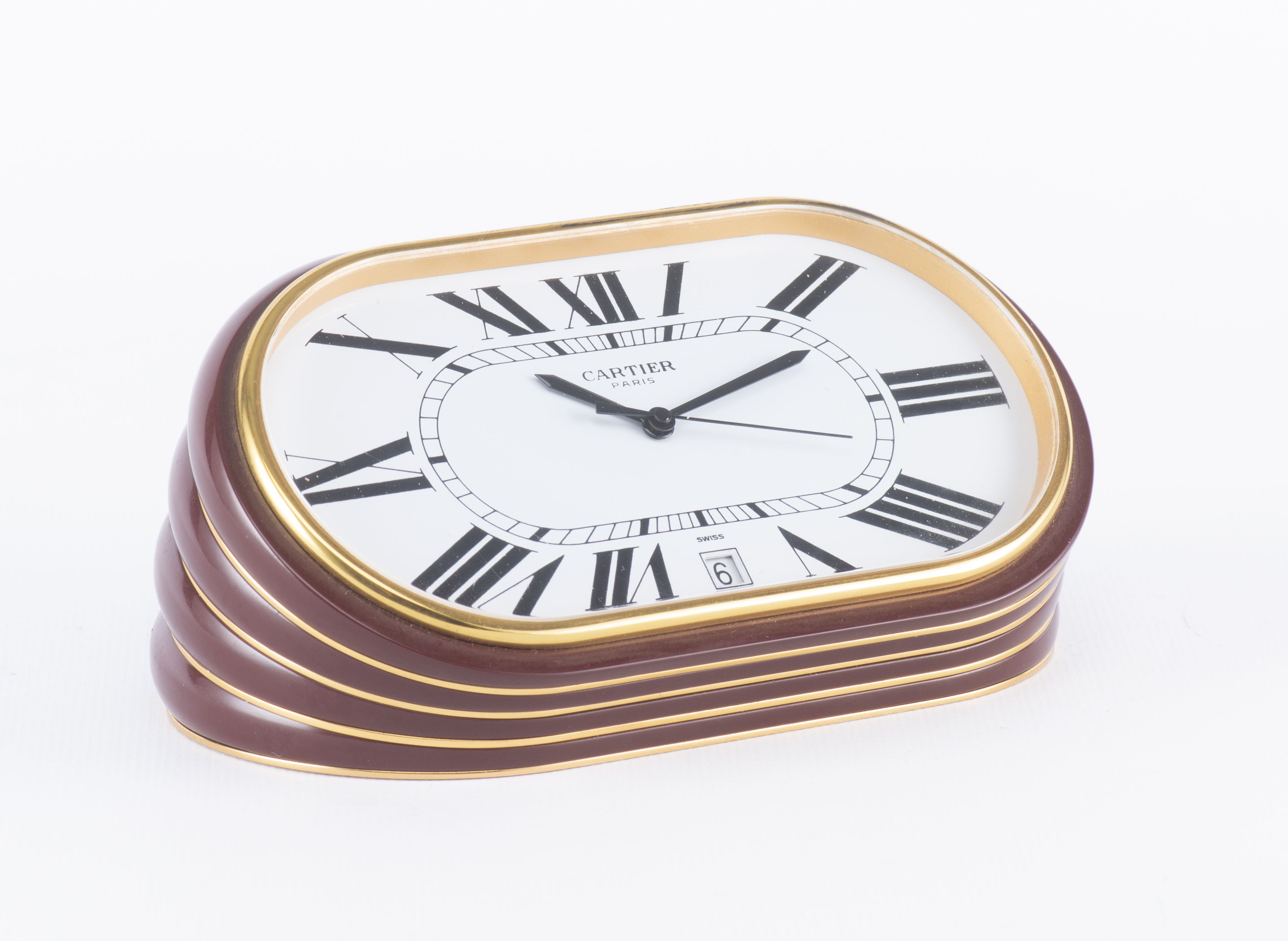 Cartier, pendulette de table oblongue "stadium shaped" godronnée en métal doré et laque marron, cadran blanc, seconde centrale, chiffres romains et graduation chemin de fer noir, aiguilles noires, date à guichet à 6h, mouvement à quartz, Boîte: n°7531 06405.