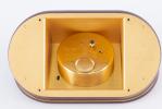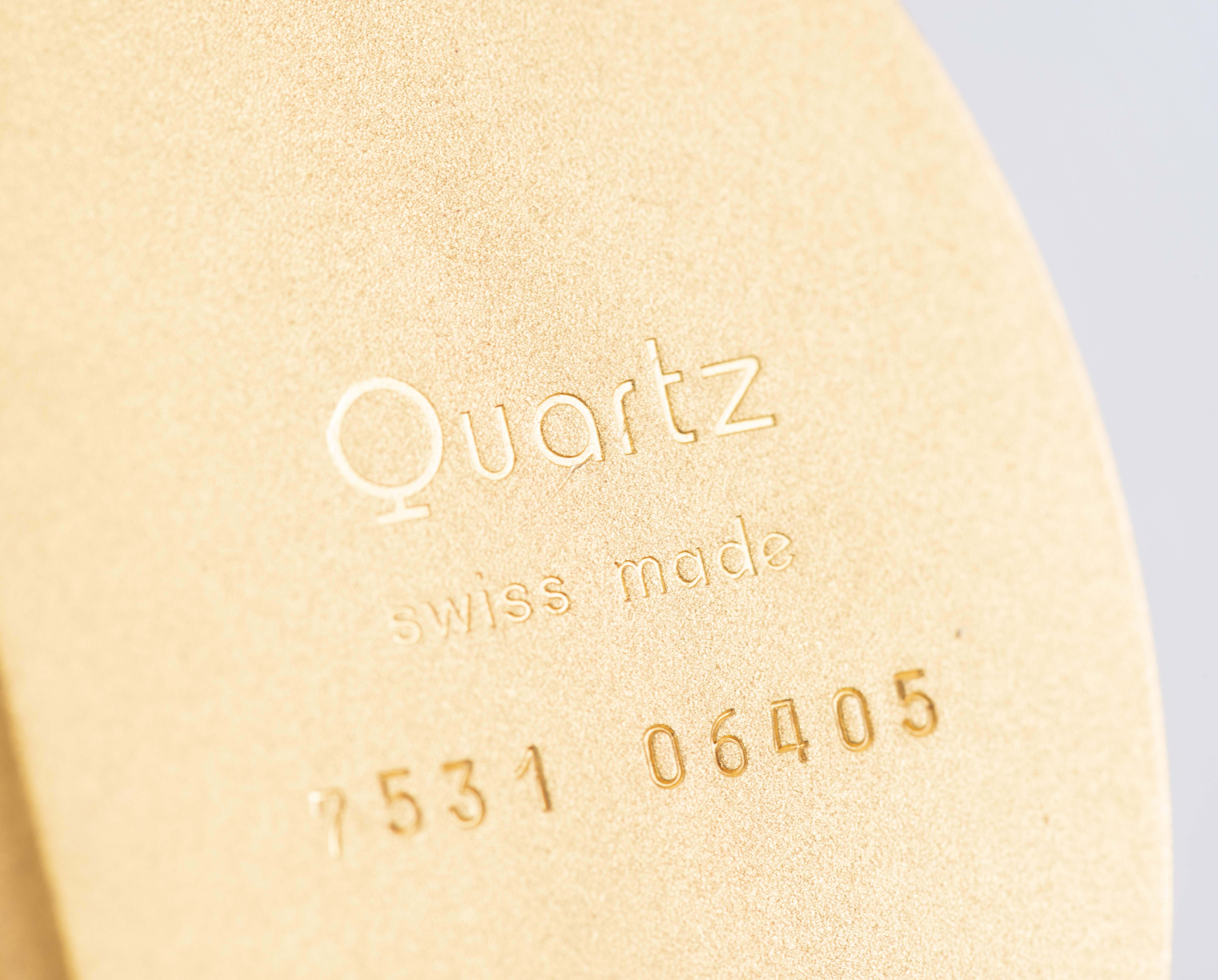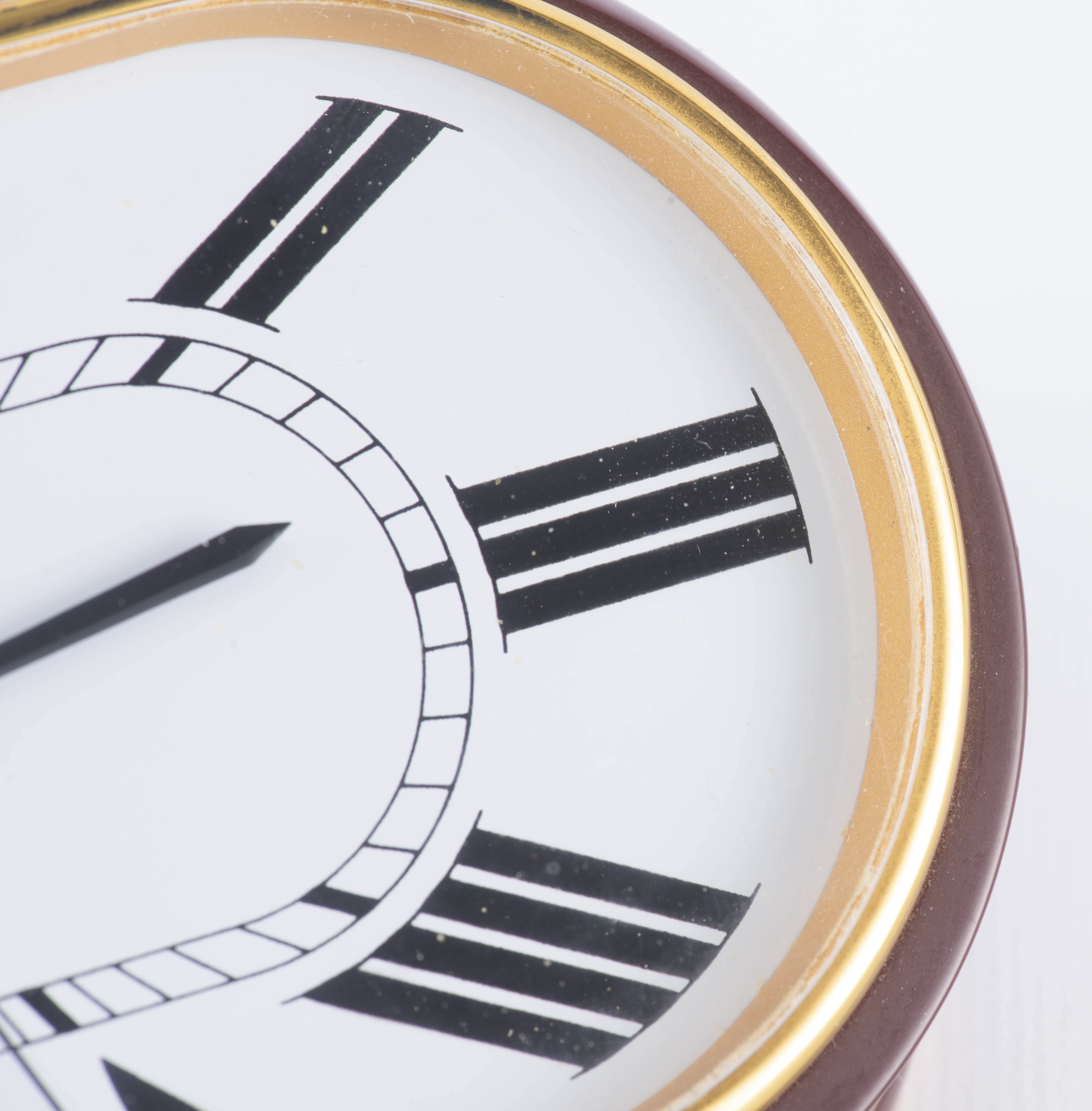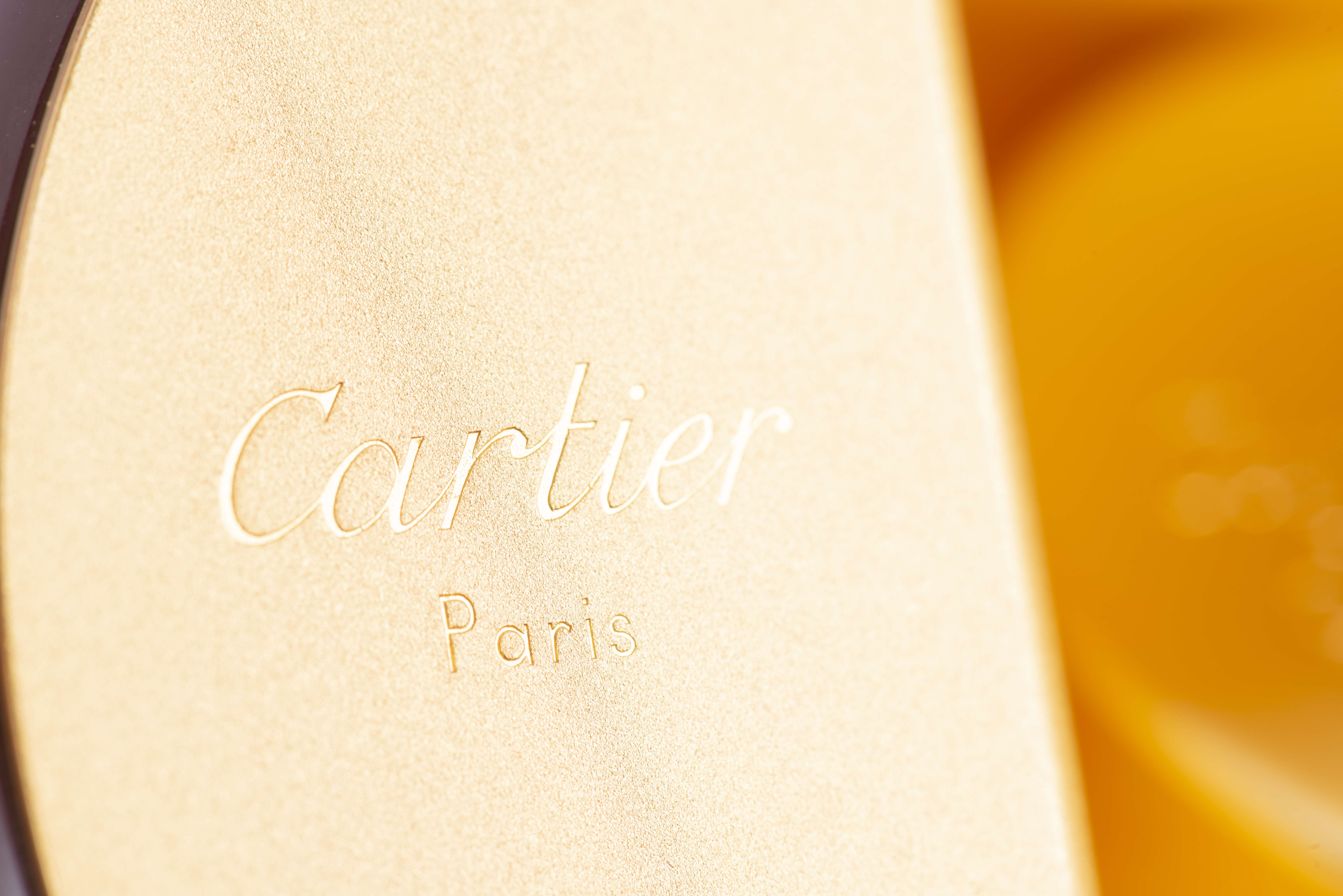 Cartier, pendulette de table oblongue "stadium shaped" godronnée en métal doré et laque marron, cadran blanc, seconde centrale, chiffres romains et graduation chemin de fer noir, aiguilles noires, date à guichet à 6h, mouvement à quartz, Boîte: n°7531 06405.