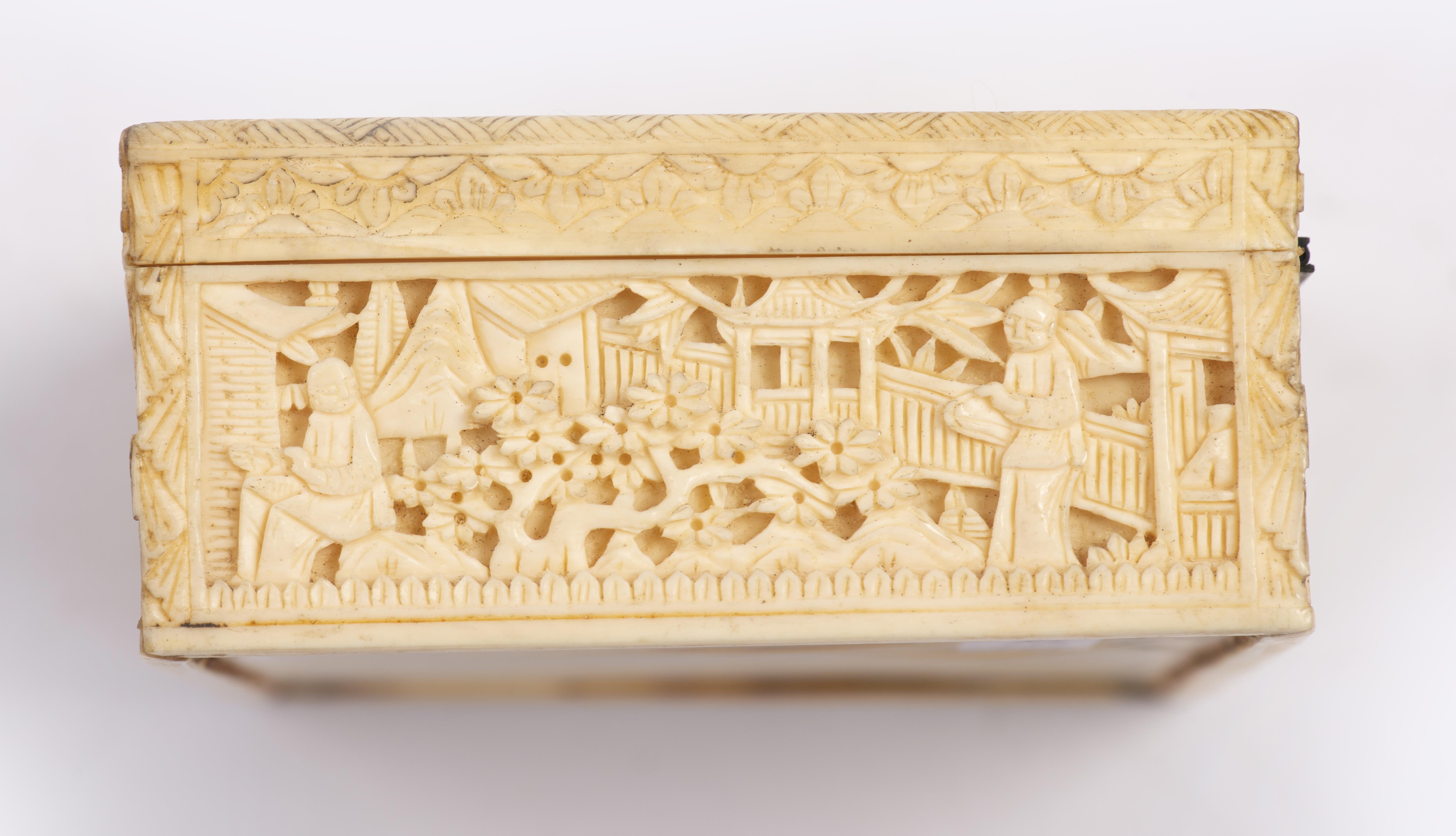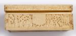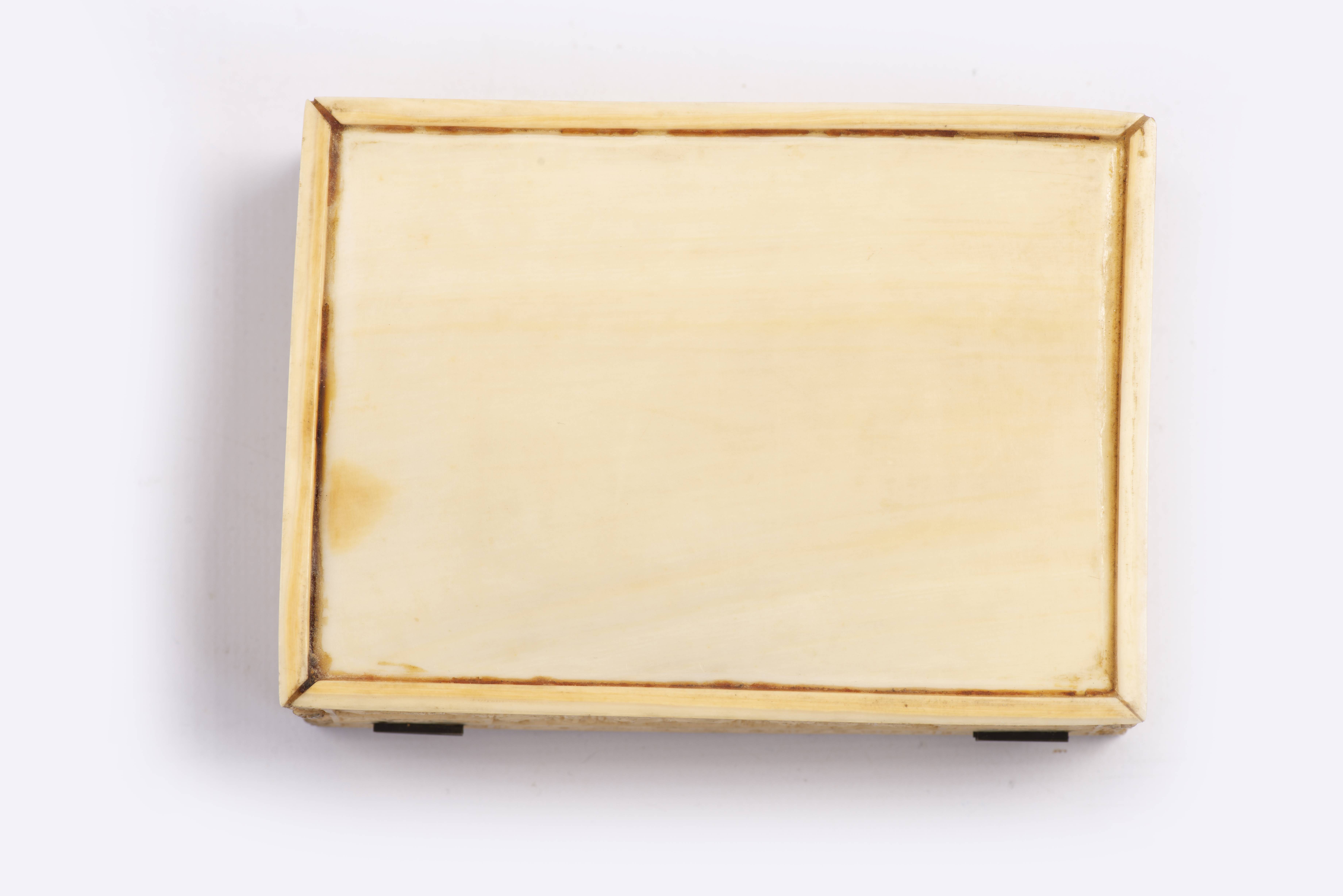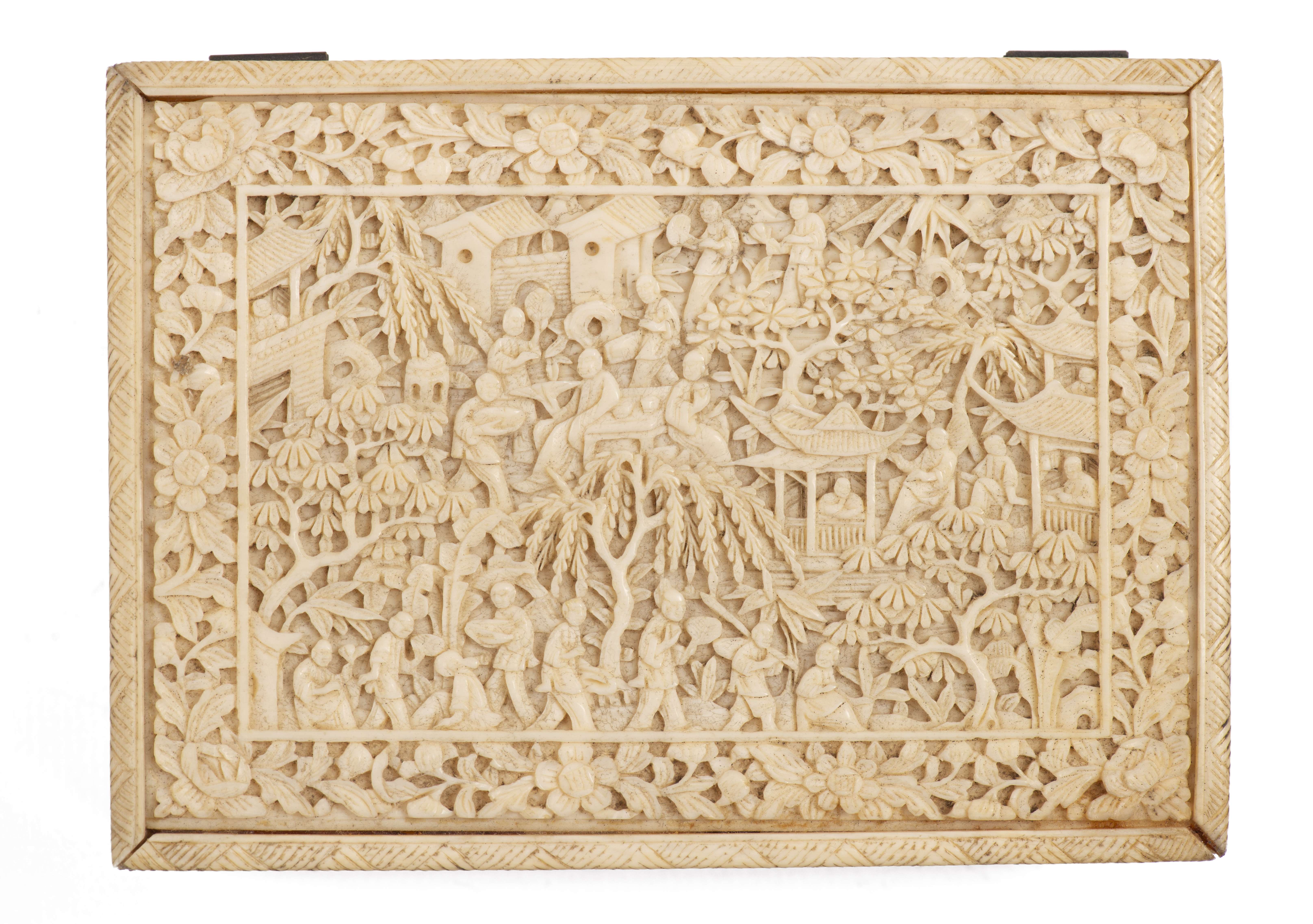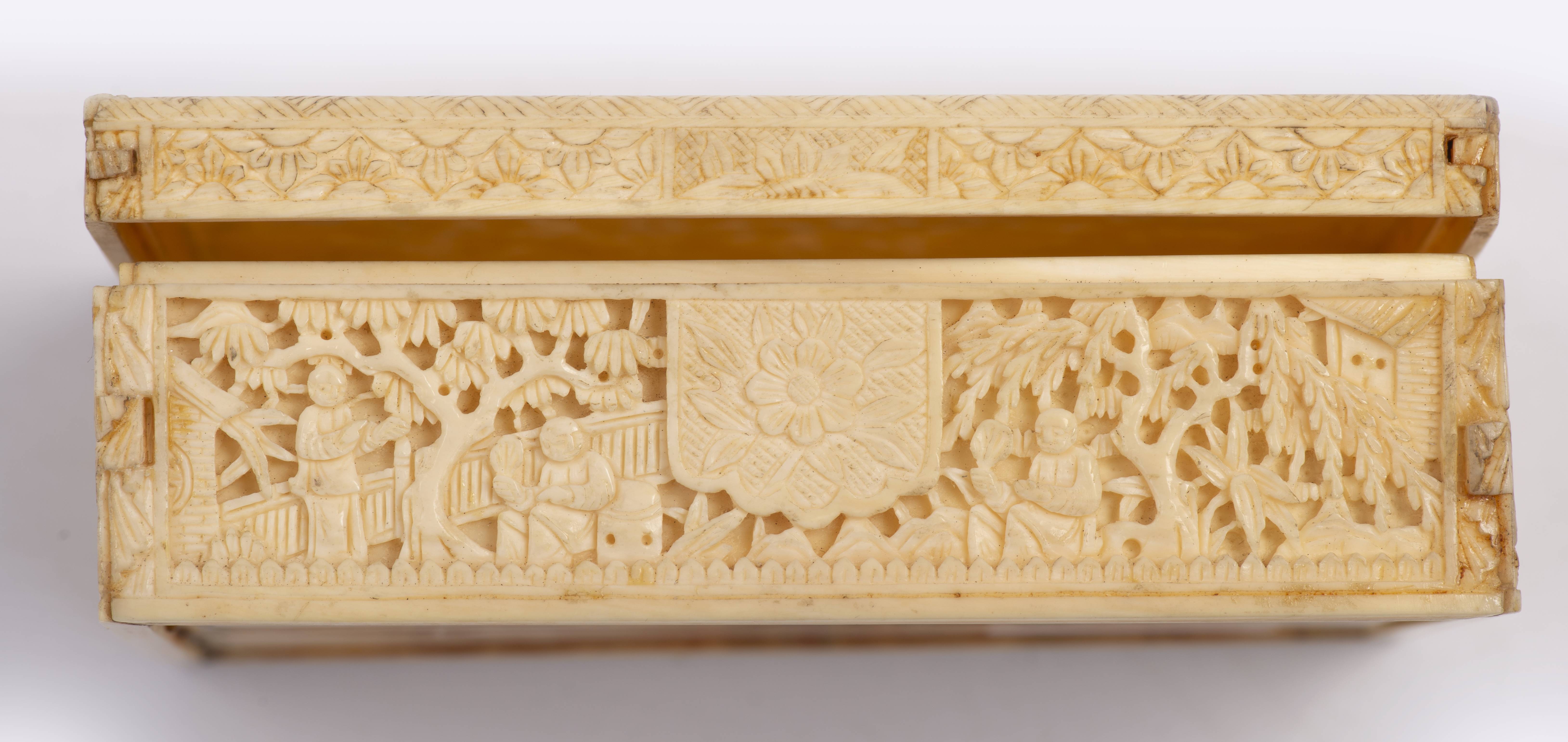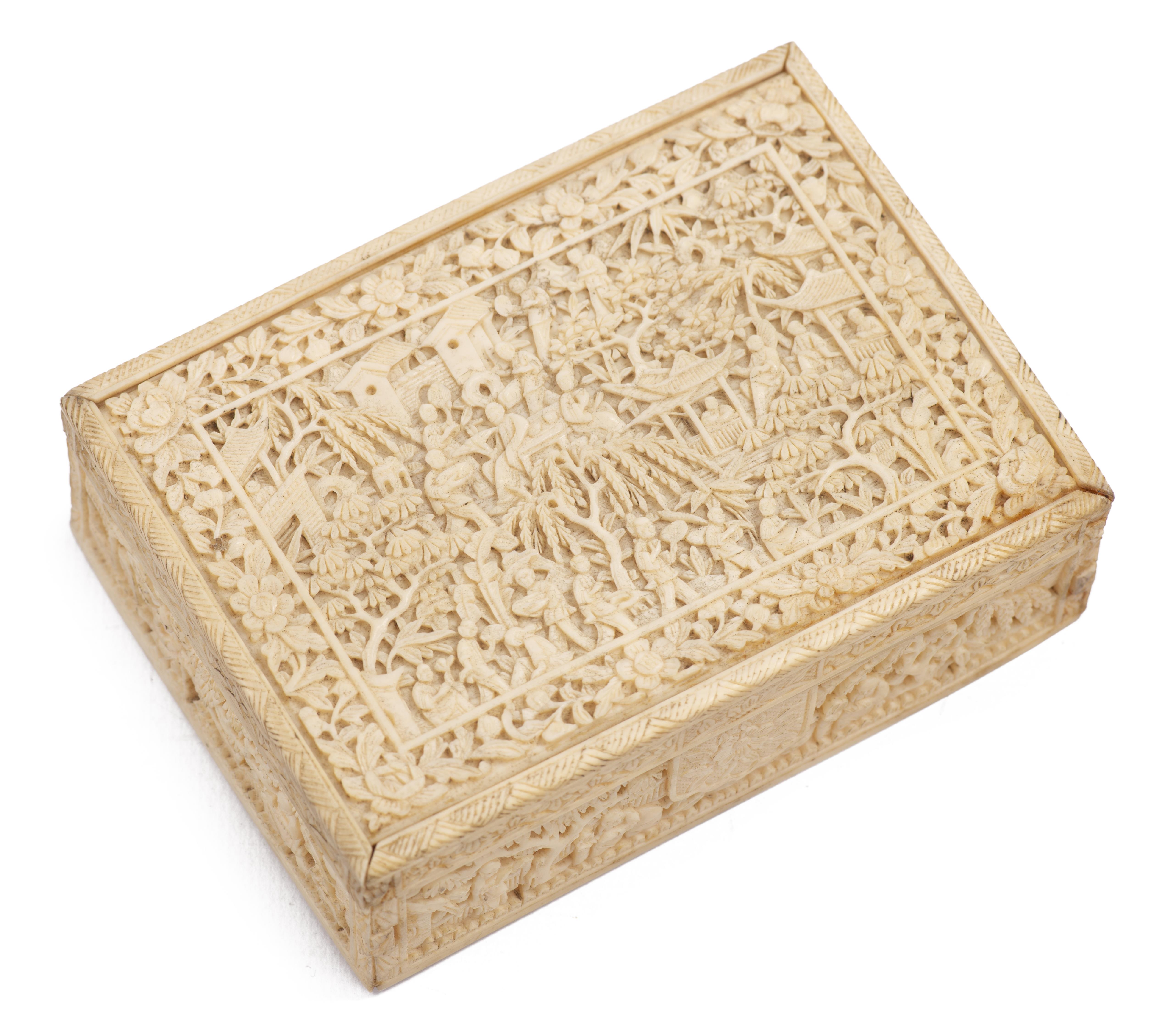 Boîte en ivoire de Canton à décor sur le dessus et les côtés de scènes de personnages en léger relief, circa 1800.