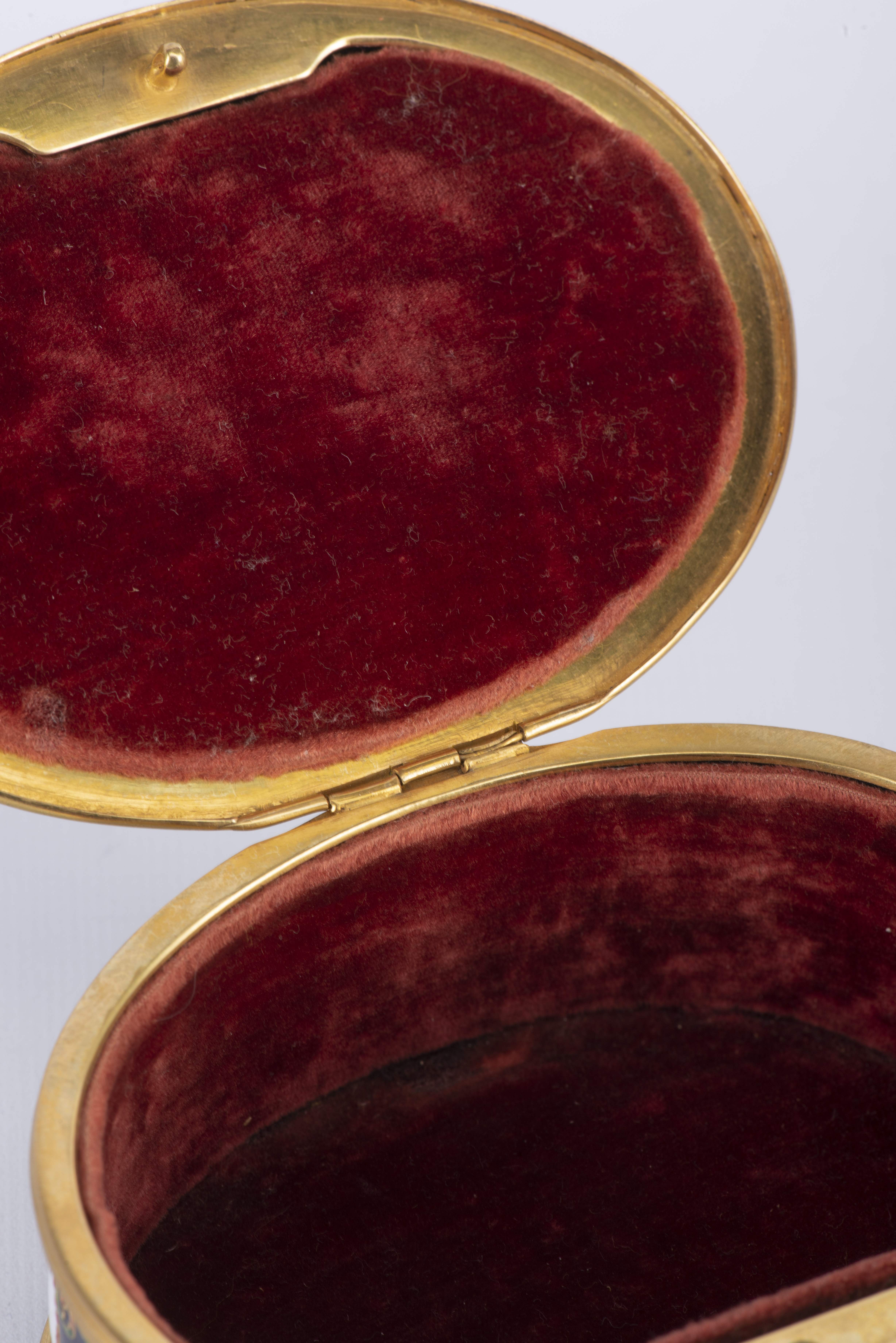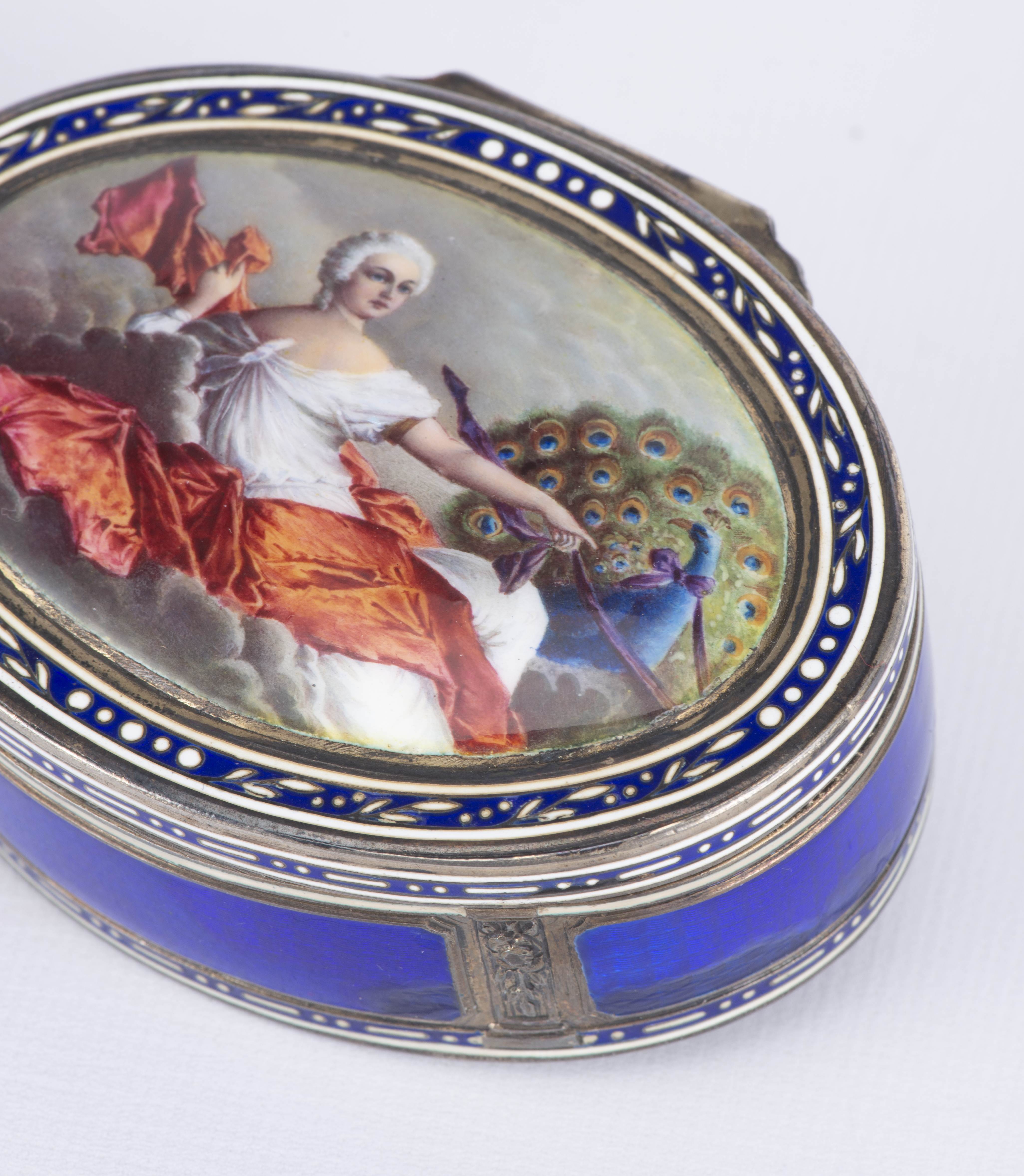 - une tabatière ovale en argent avec miniature émail représentant une scène galante entouré de motif décoratif à feuilles.