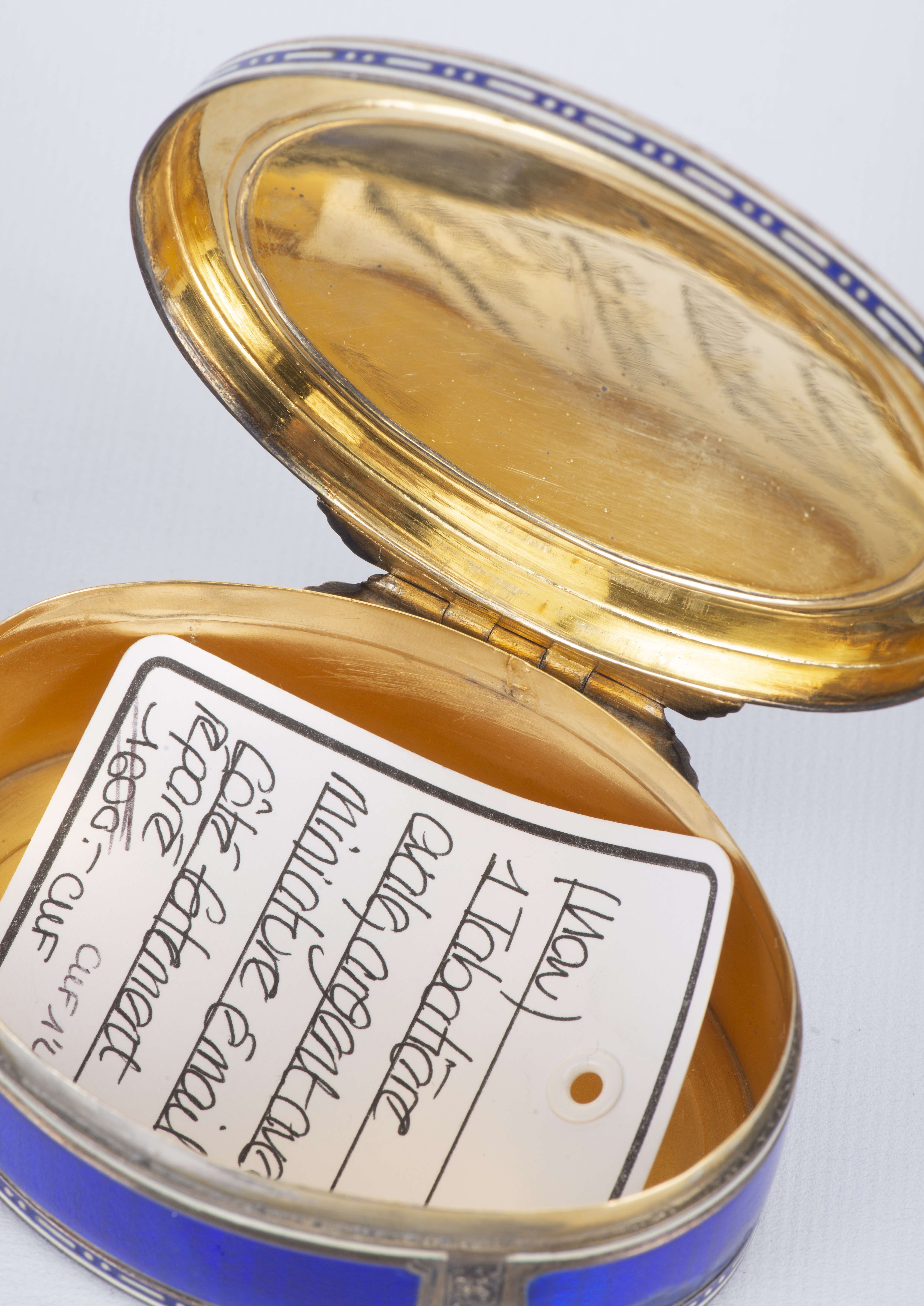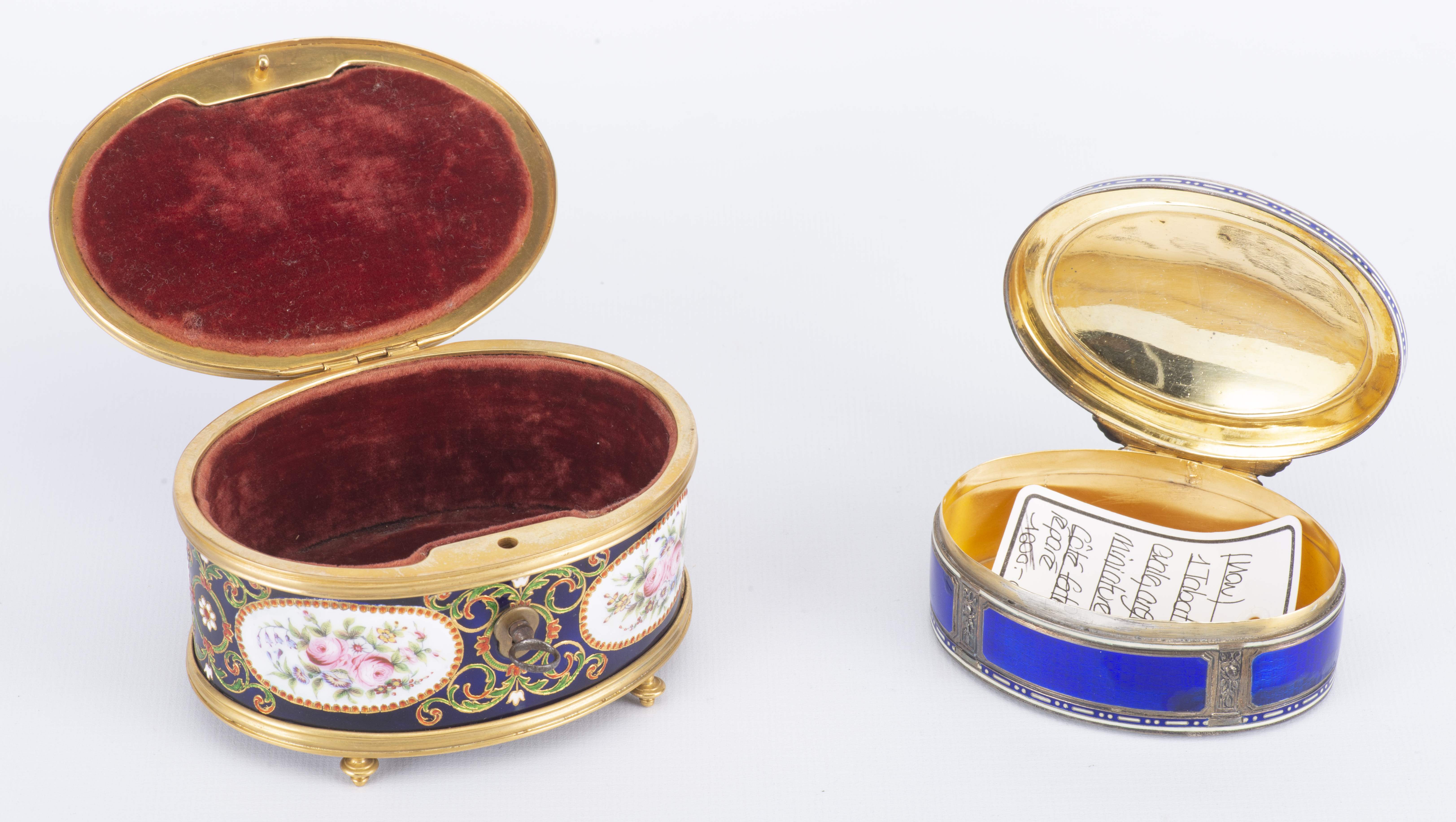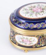 - une boîte ovale avec une petite serrure sur 4 pieds, en cuivre émaillé bleu avec des médaillons à décor floral sur les côtés et le couvercle.