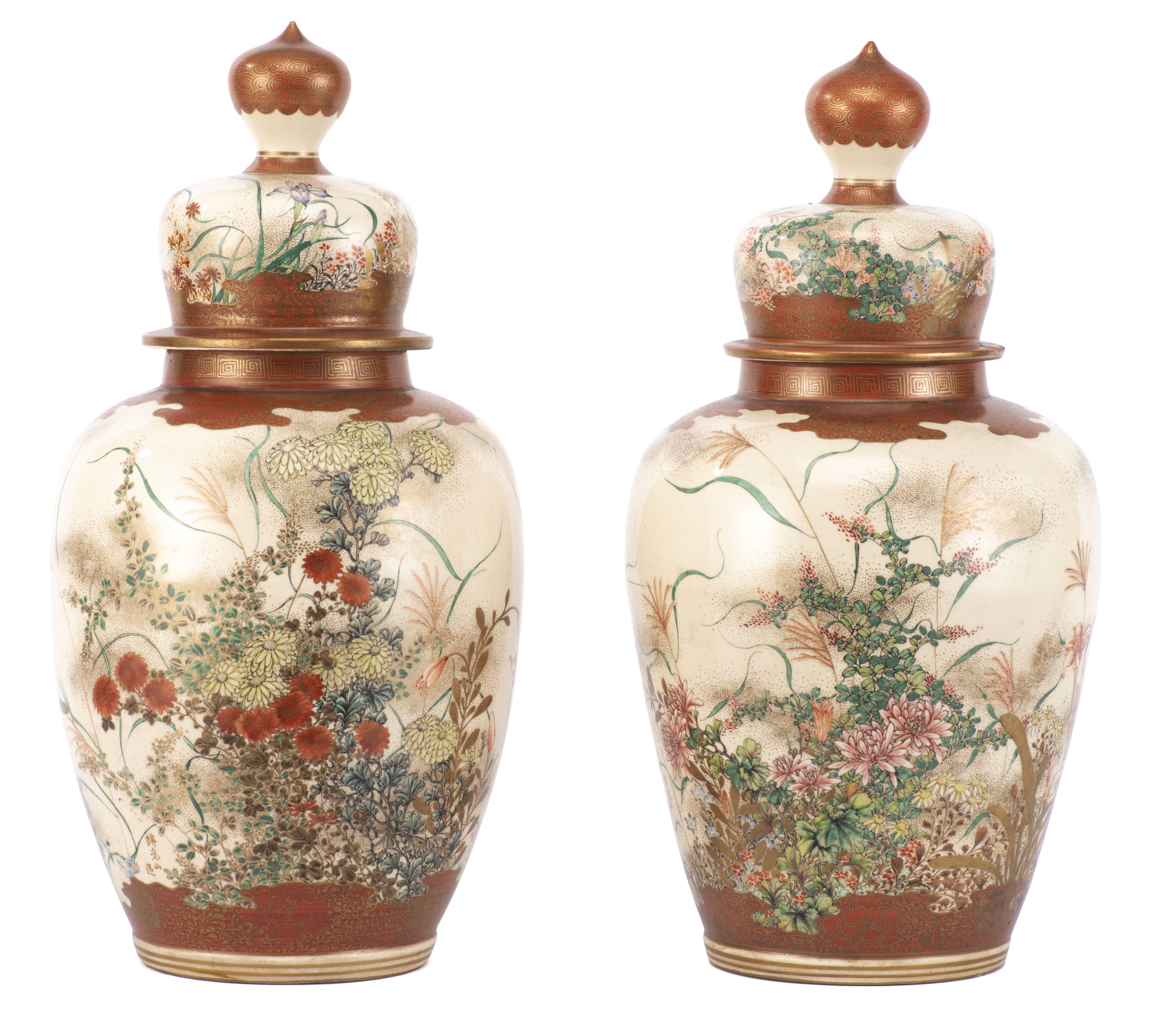 Paire de potiches ou vases à couvecle en porcelaine du Japon à décor en Satsuma de fleurs sur champ beige. Bordures en rouge et or. Japon, ère Meiji.