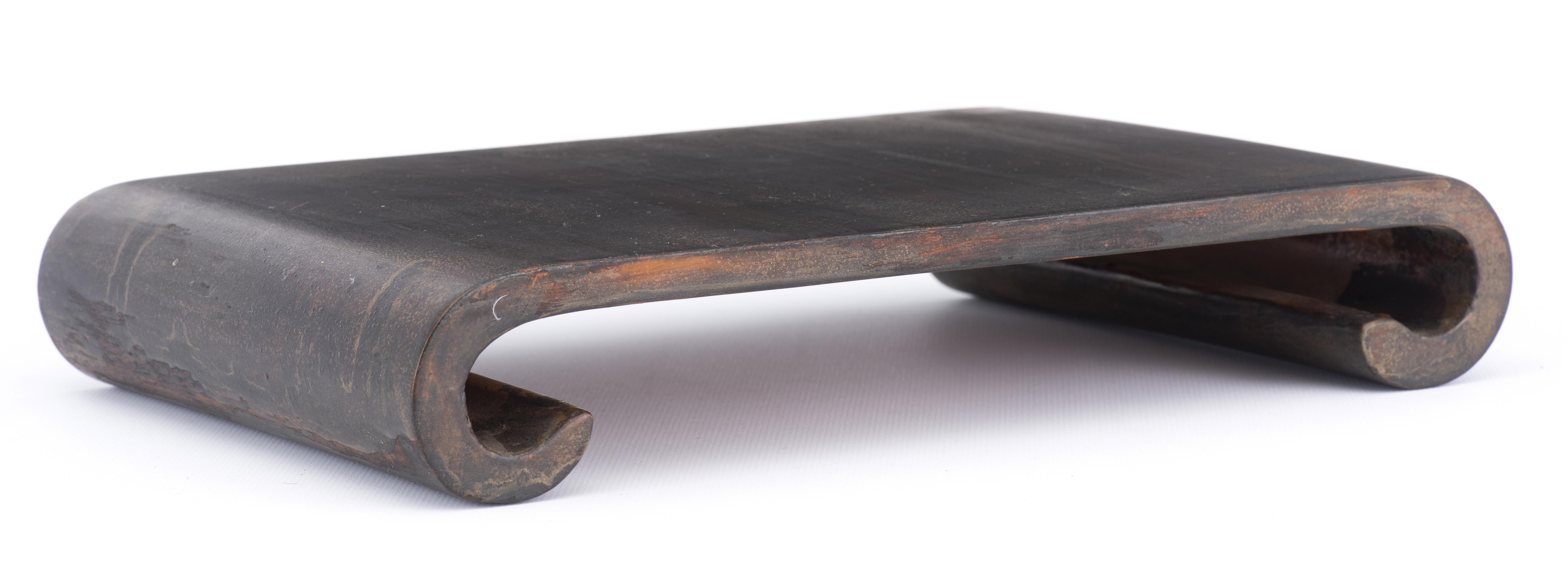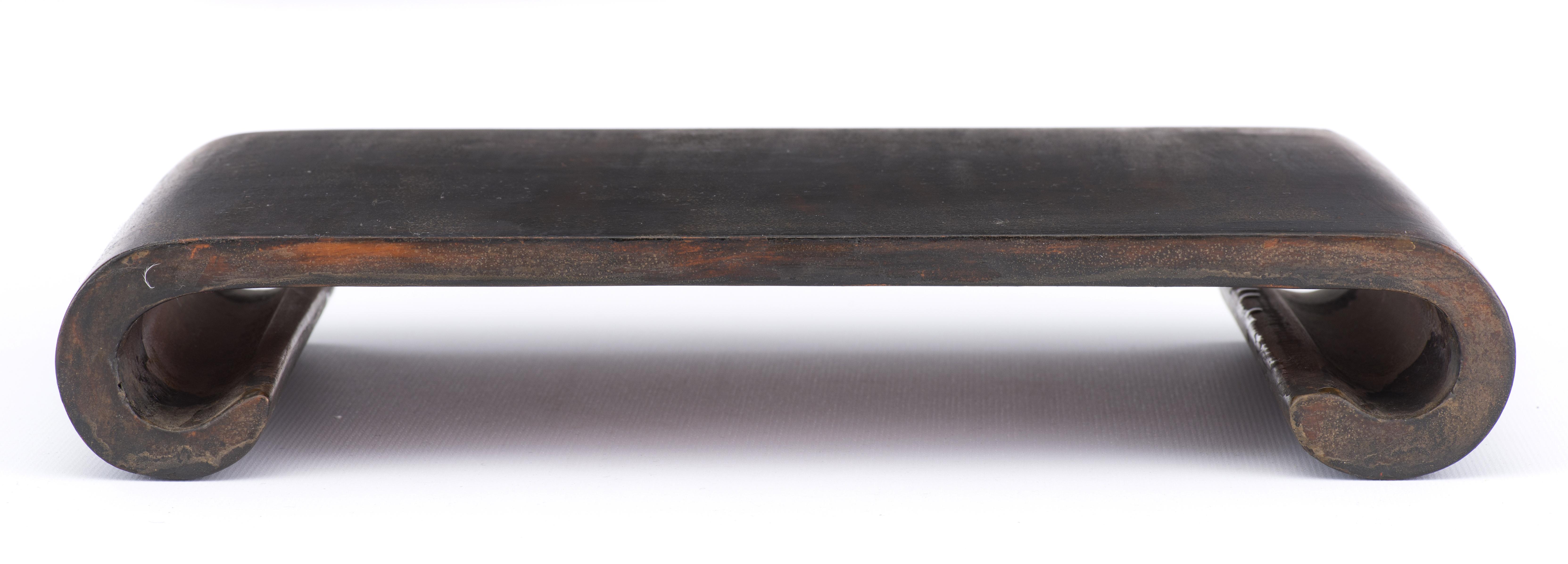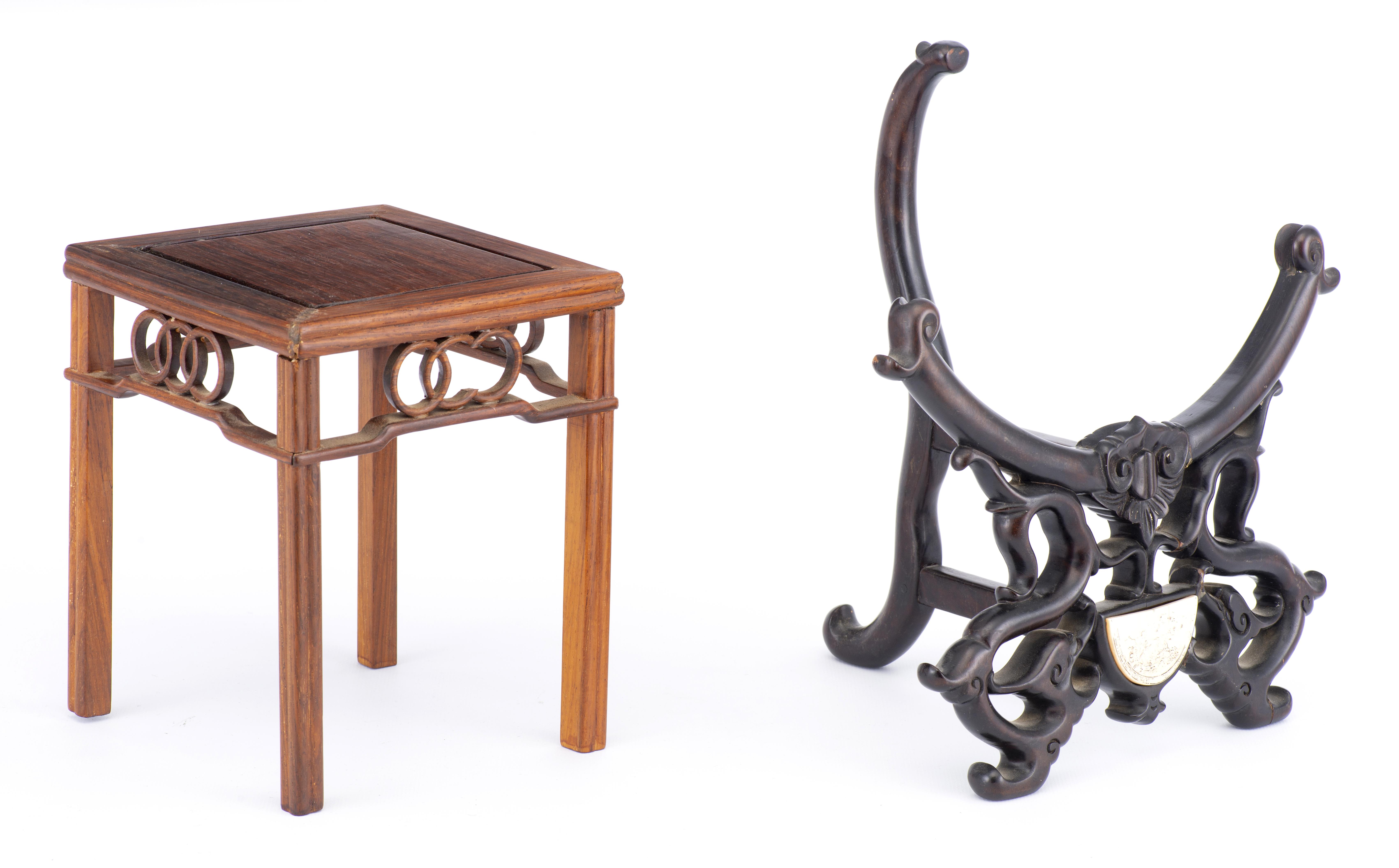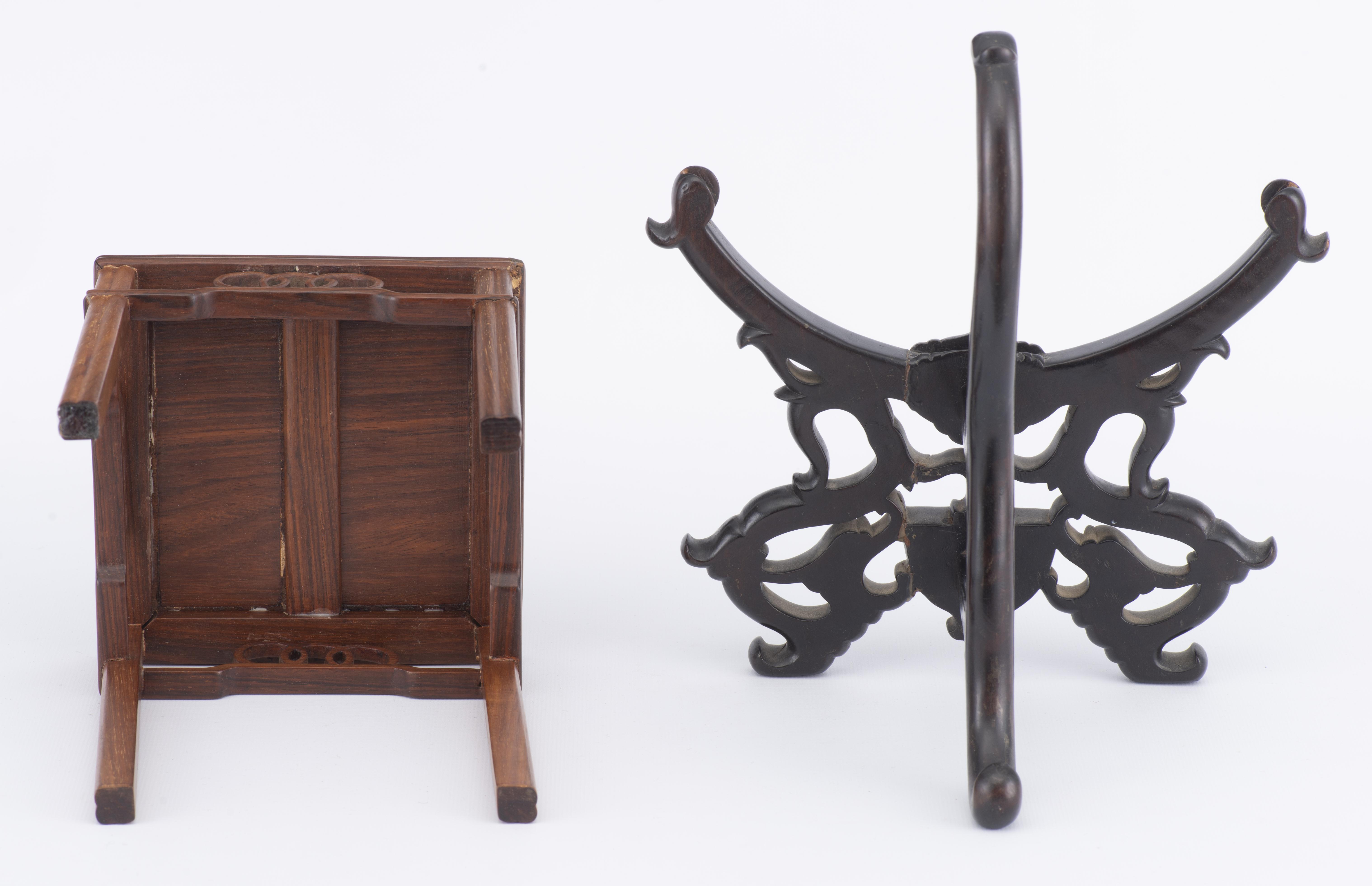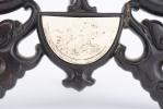 - 1 porte-plat en bois de fer noirci avec incrustations d'ivoire
