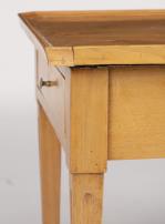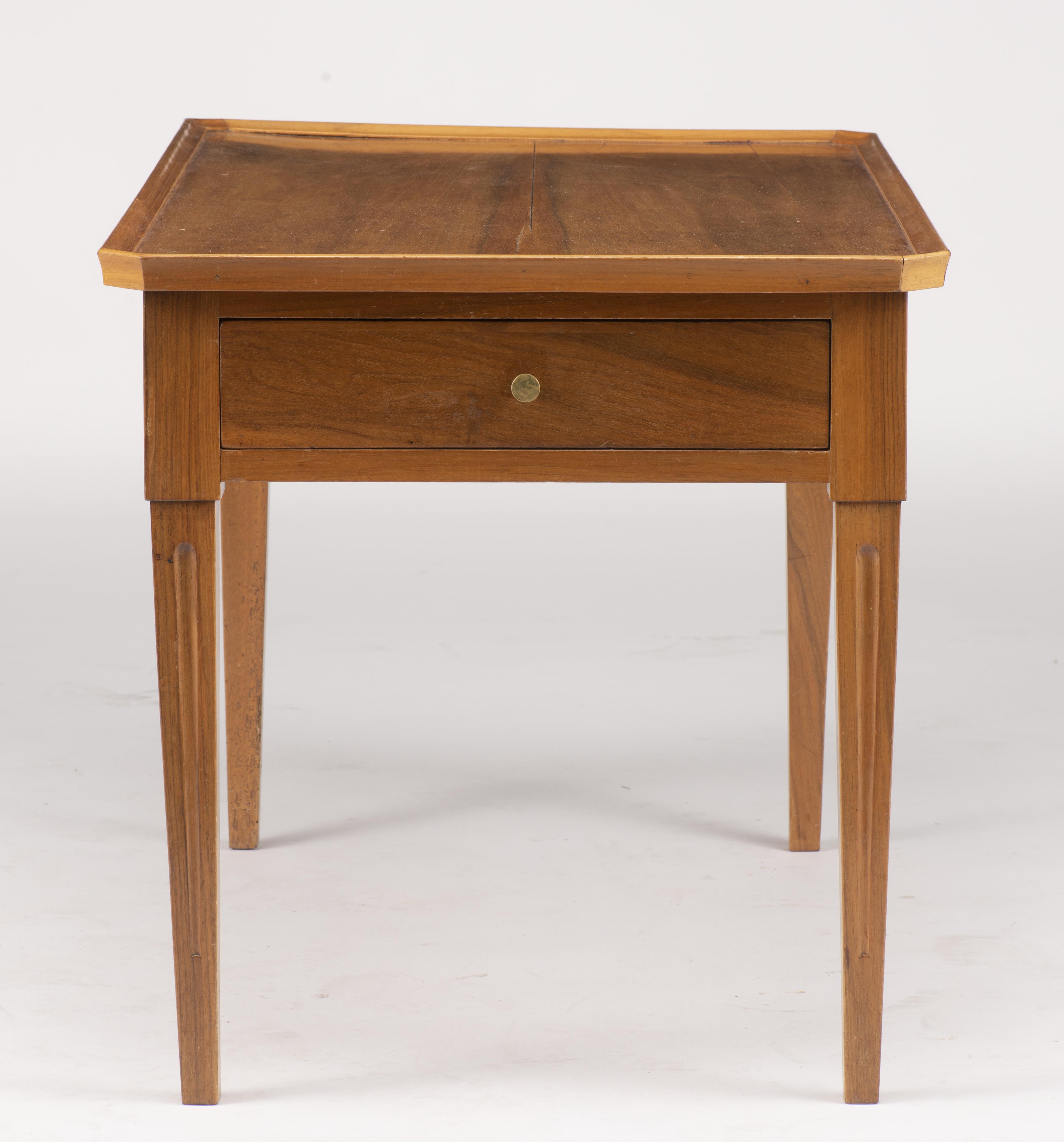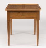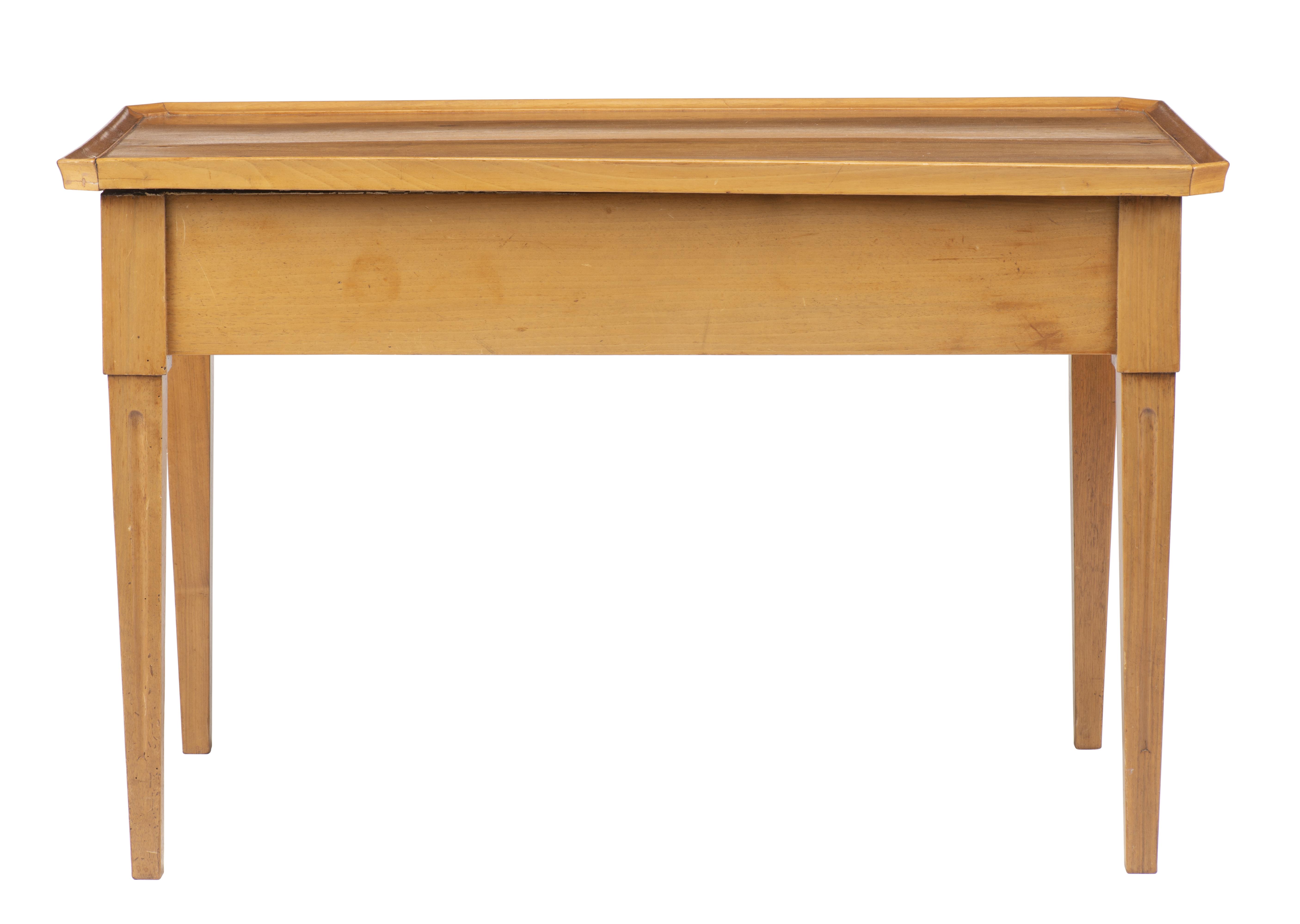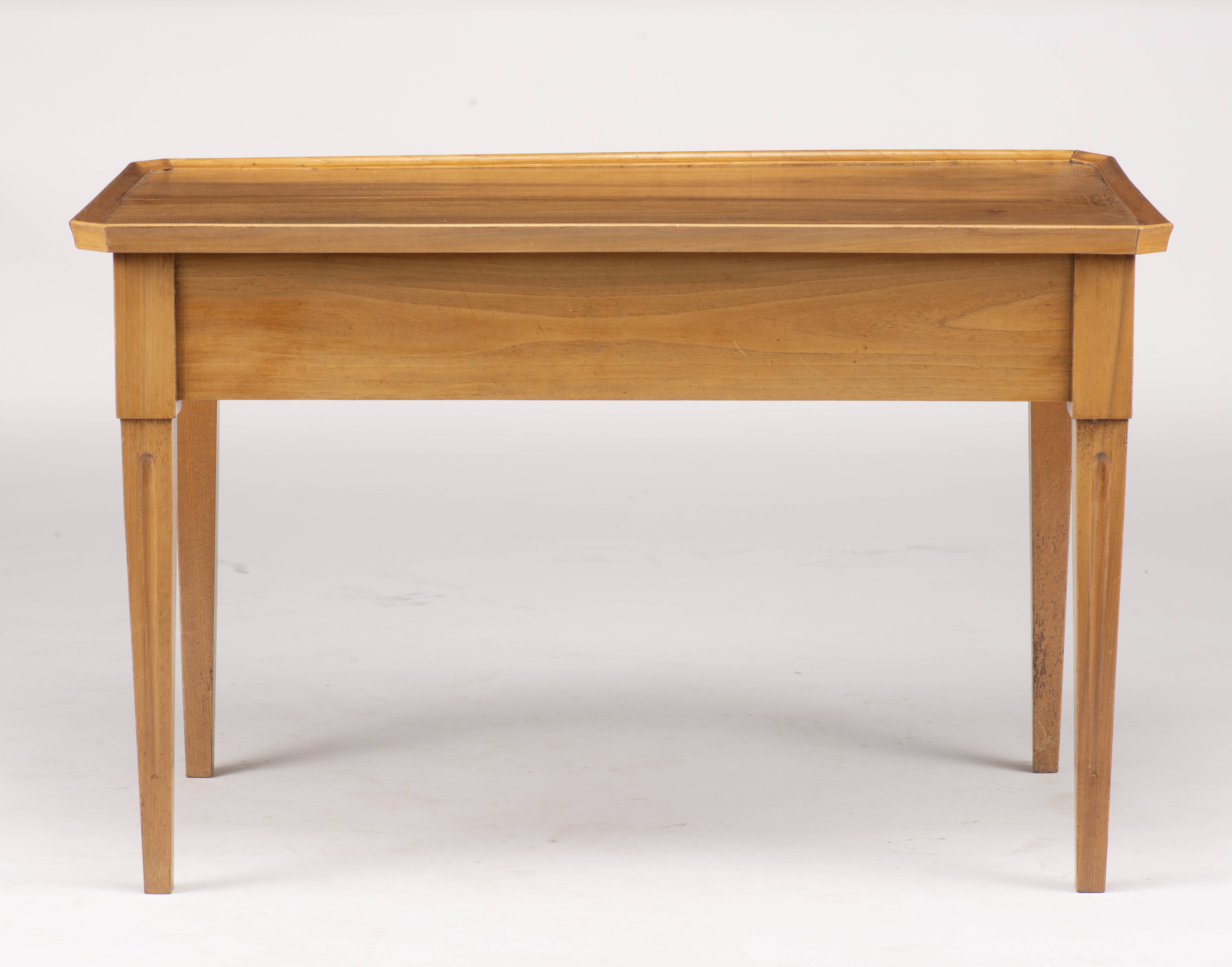 Table basse de style Directoire à 4 pieds fuseaux et 2 tiroirs sur les côtés, plateau à cuvette rapportée.