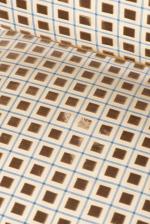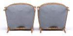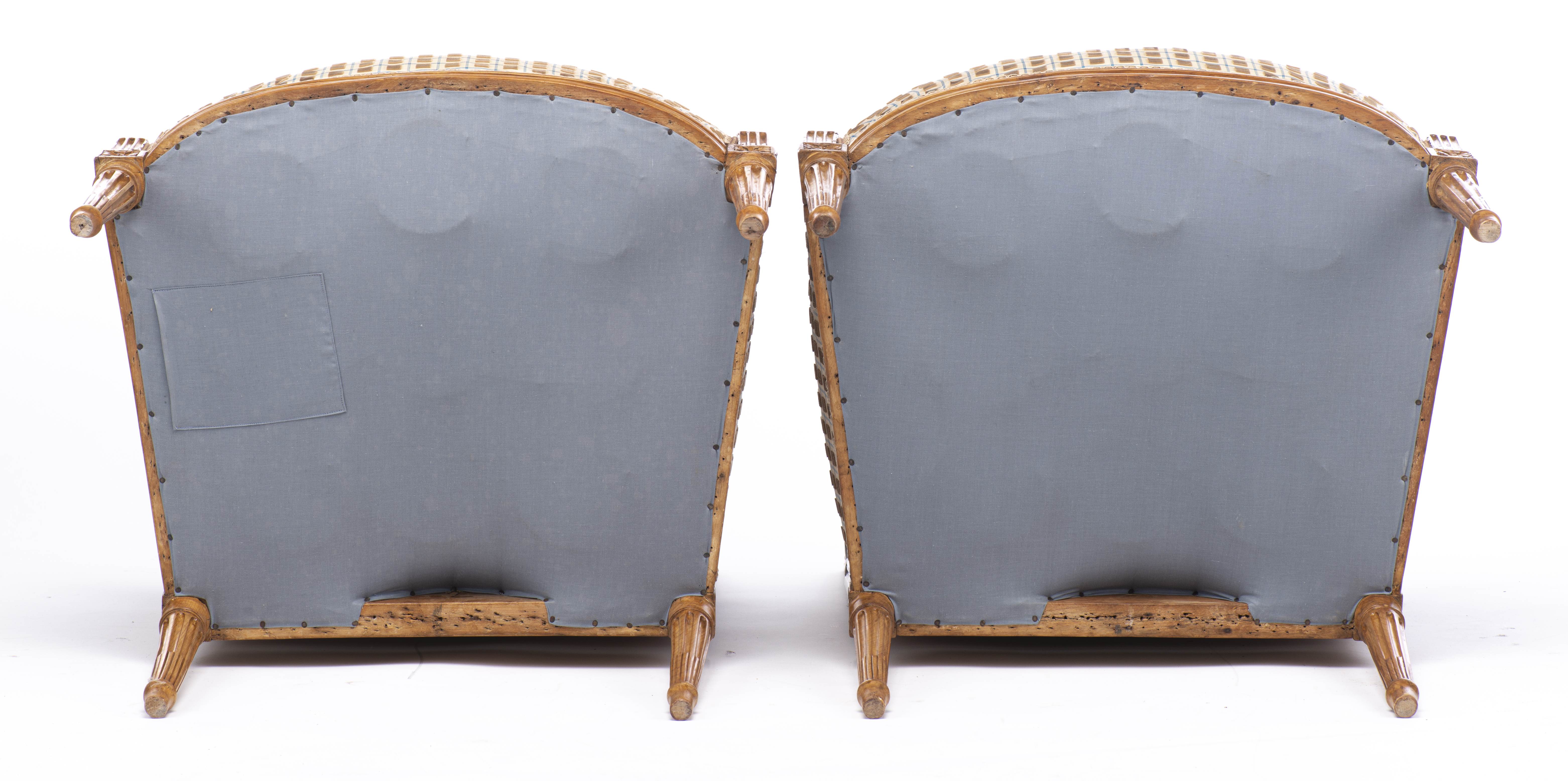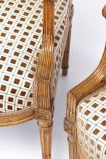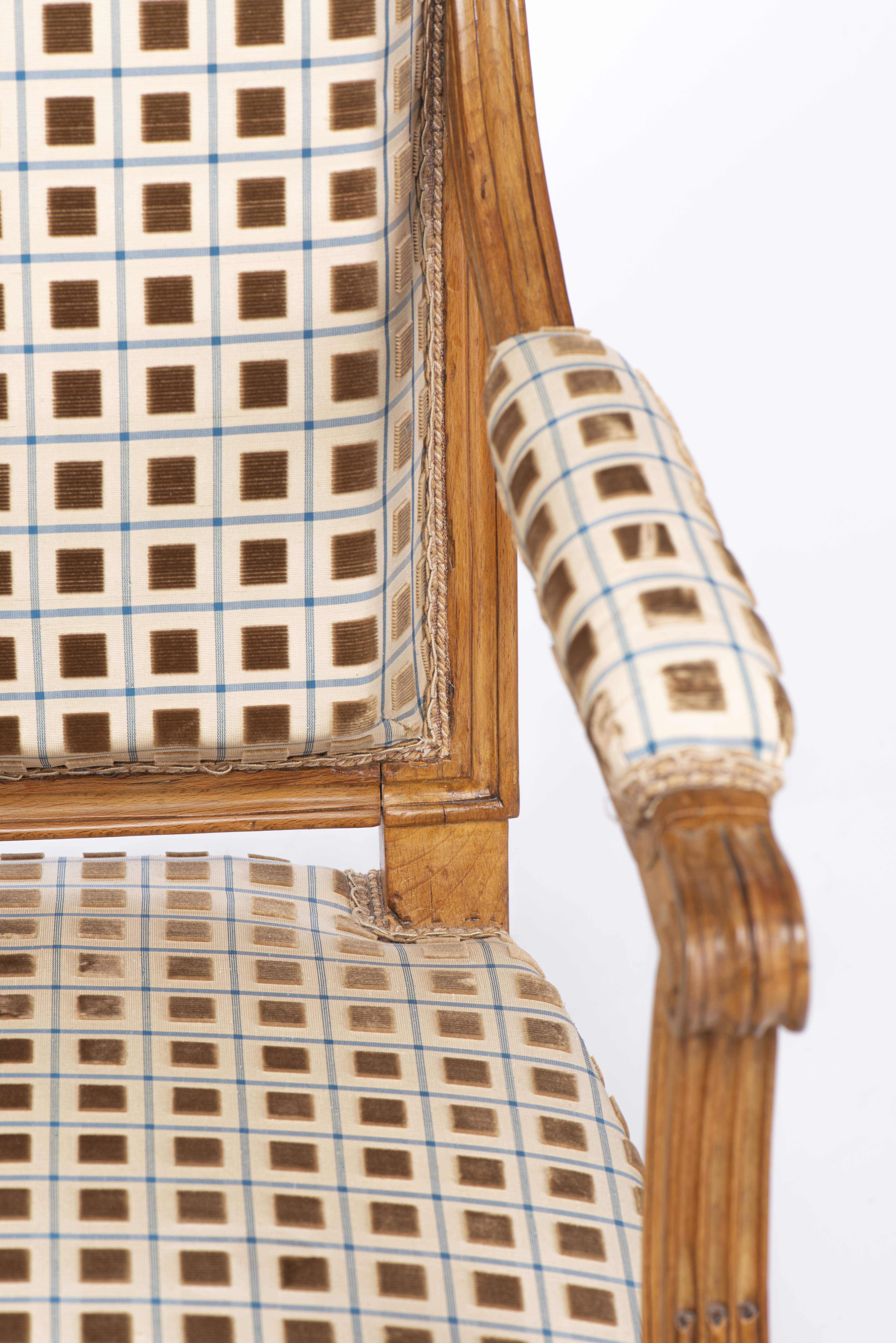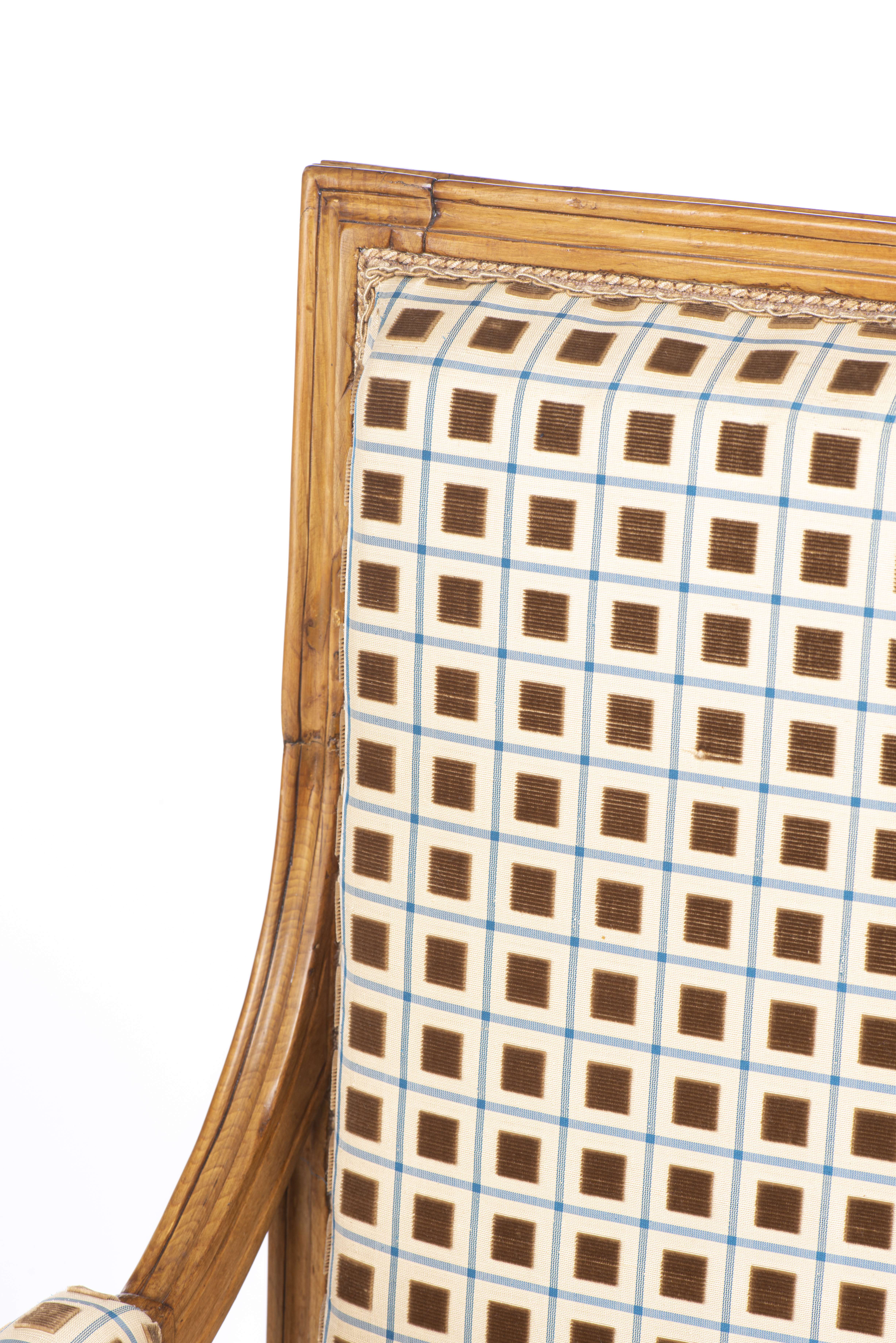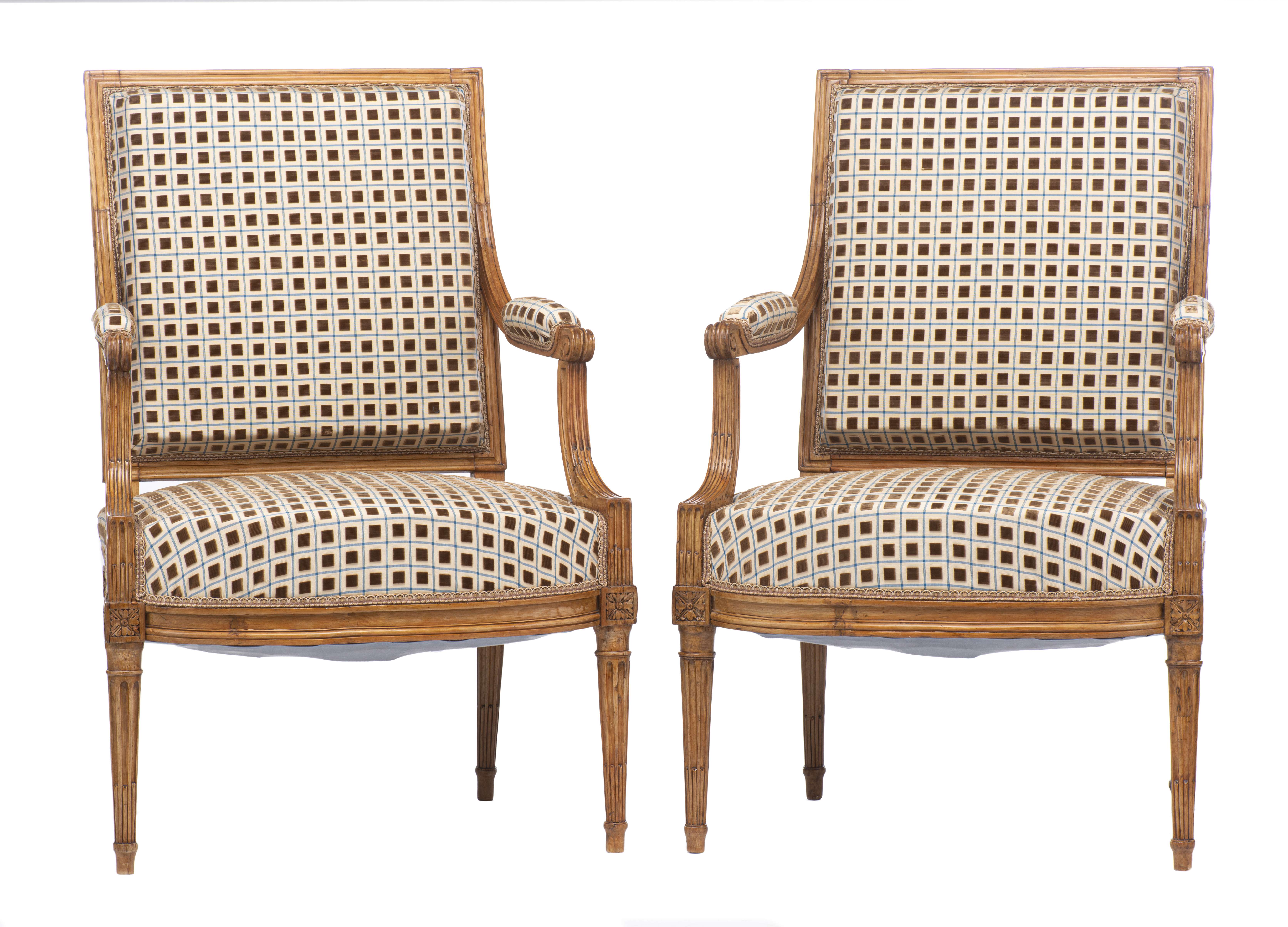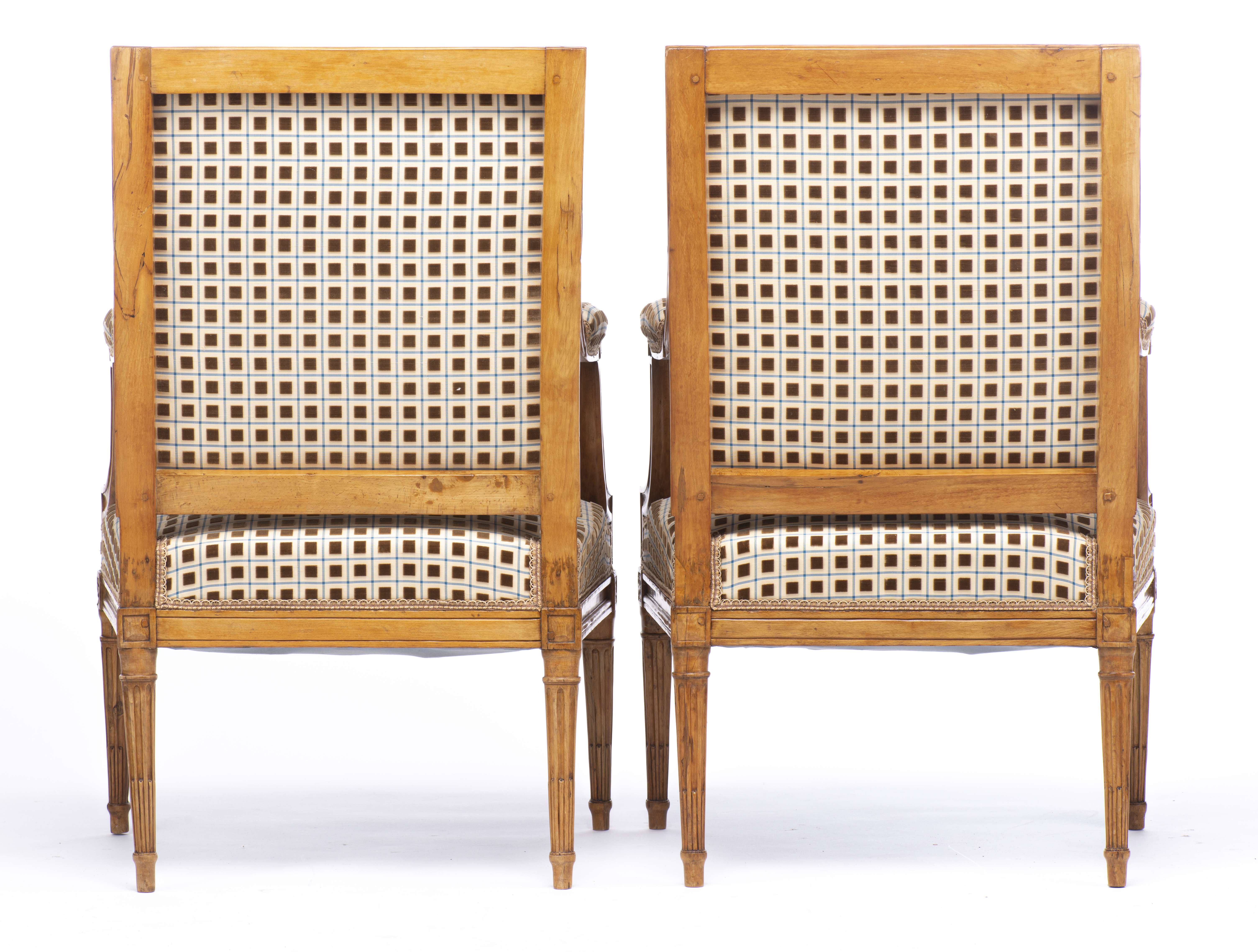 Paire de fauteuils à dossier plat de style Louis XVI recouverts de tissu jaune à motifs de carrés bruns en velours encadrés de d'une bande bleue. Paris XVIIIe.