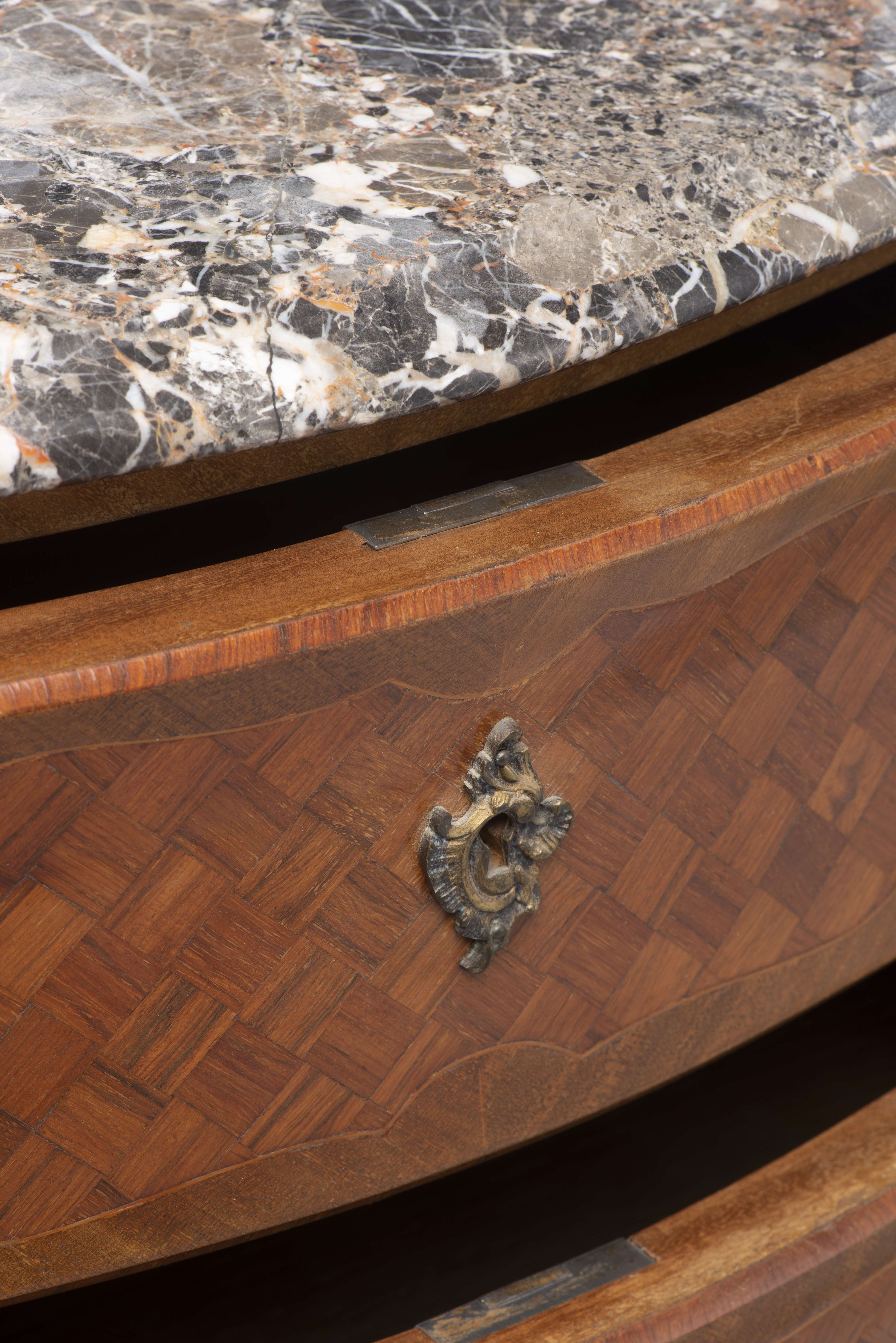 Commode de style Louis XV à trois tiroirs, décor de marqueterie de losanges, poignées, chutes et sabots en bronze, dessus de marbre brèche de Medous.