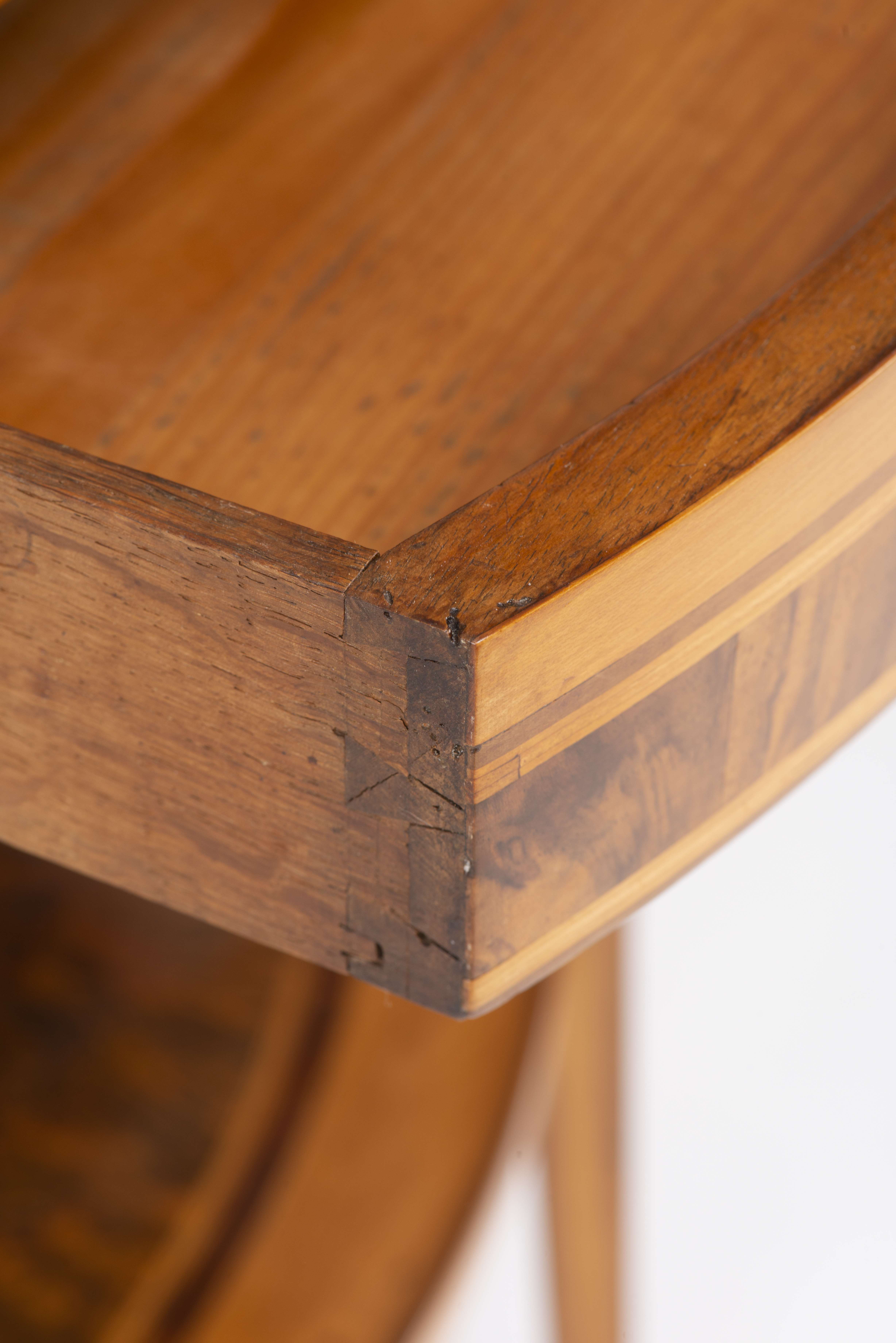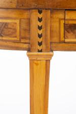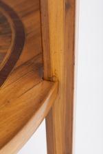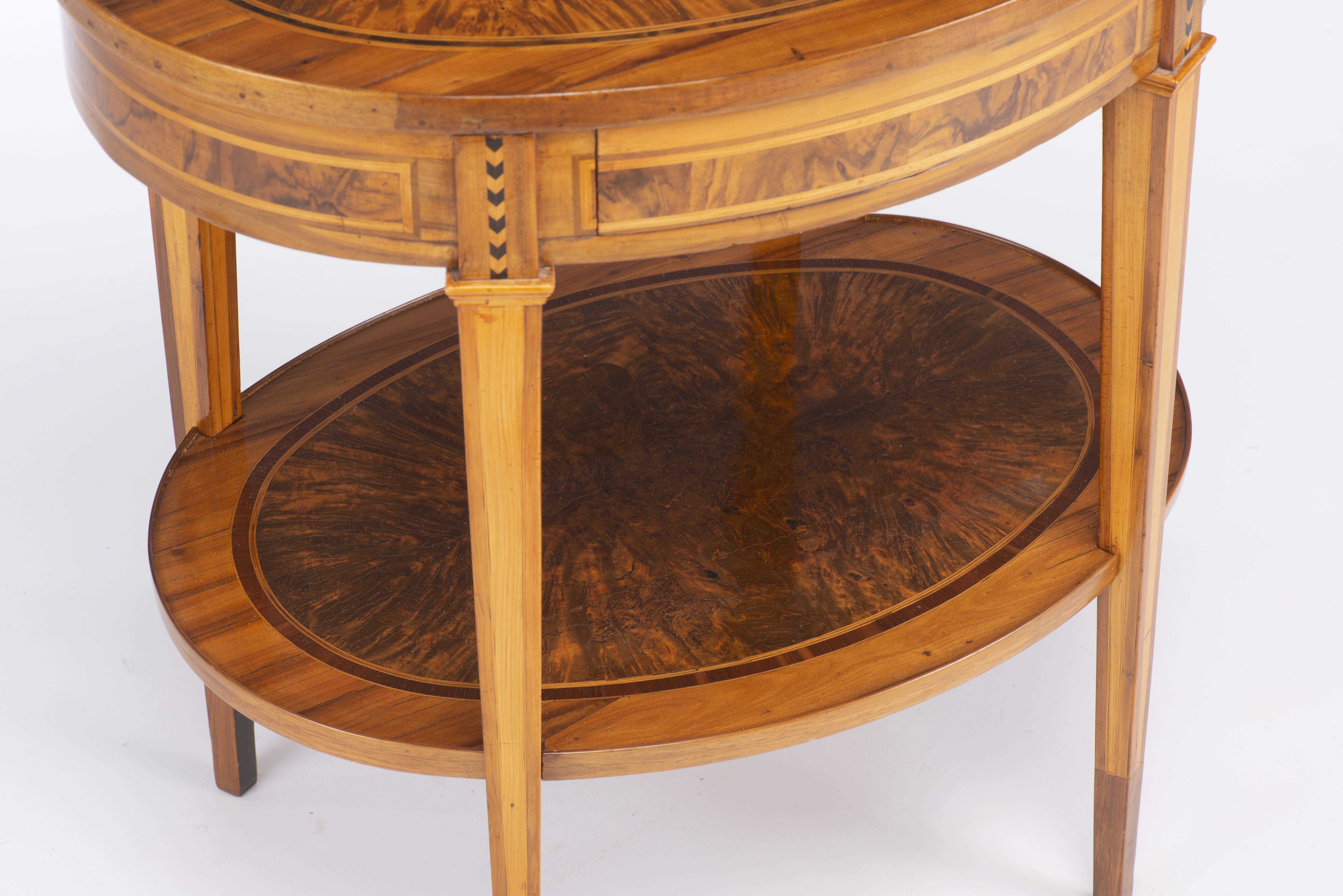 Guéridon ovale en placage de loupe, de bois de fruitier, de citronnier, à quatre pieds fuseaux et tablette inférieure répétant le décor du plateau, un tiroir dans le bandeau supérieur, plateau supérieur à rebord.