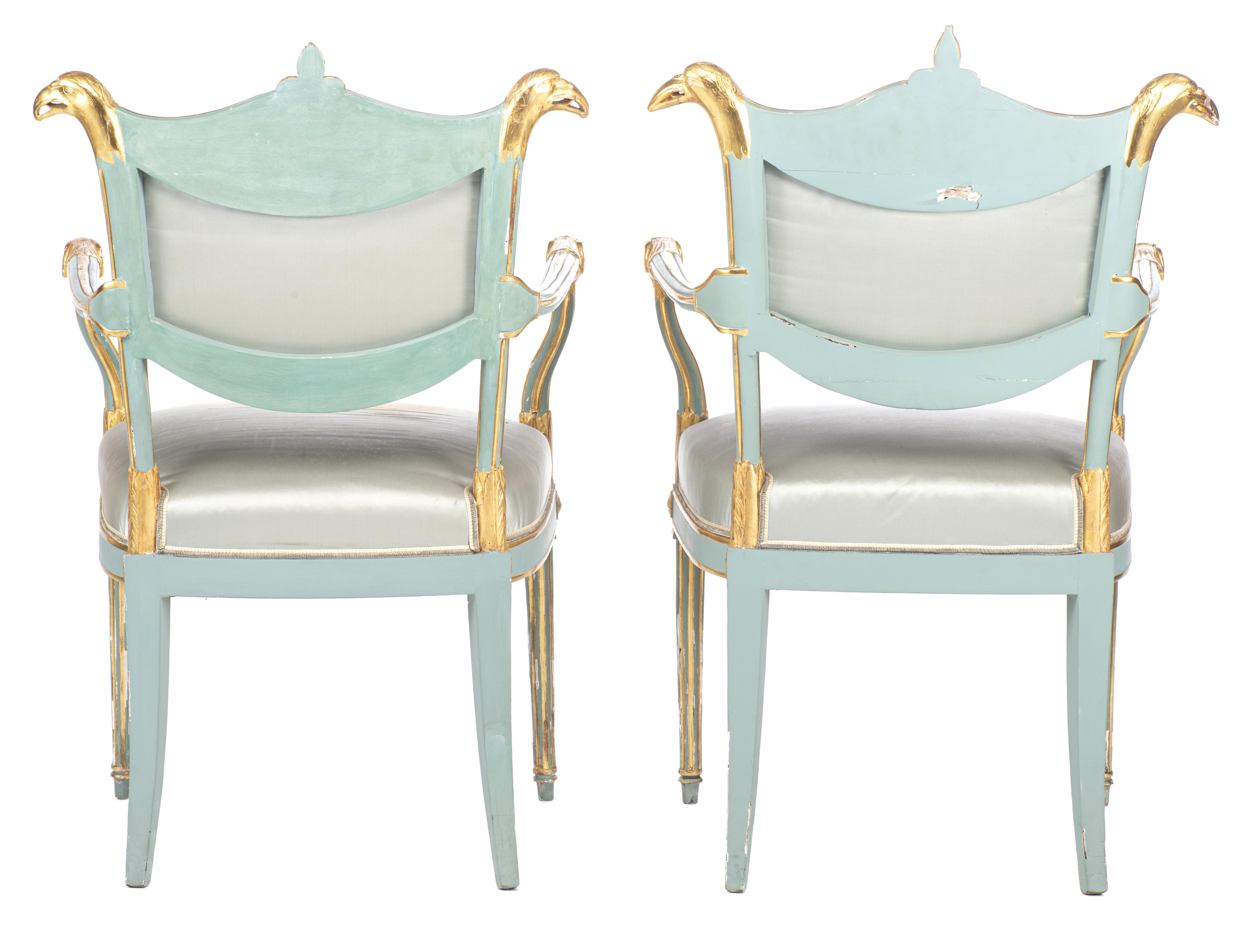 Paire de fauteuils d'époque Empire en bois rechampi en vert et or à dossiers à tête d'aigles, recouverts de soie turquoise.