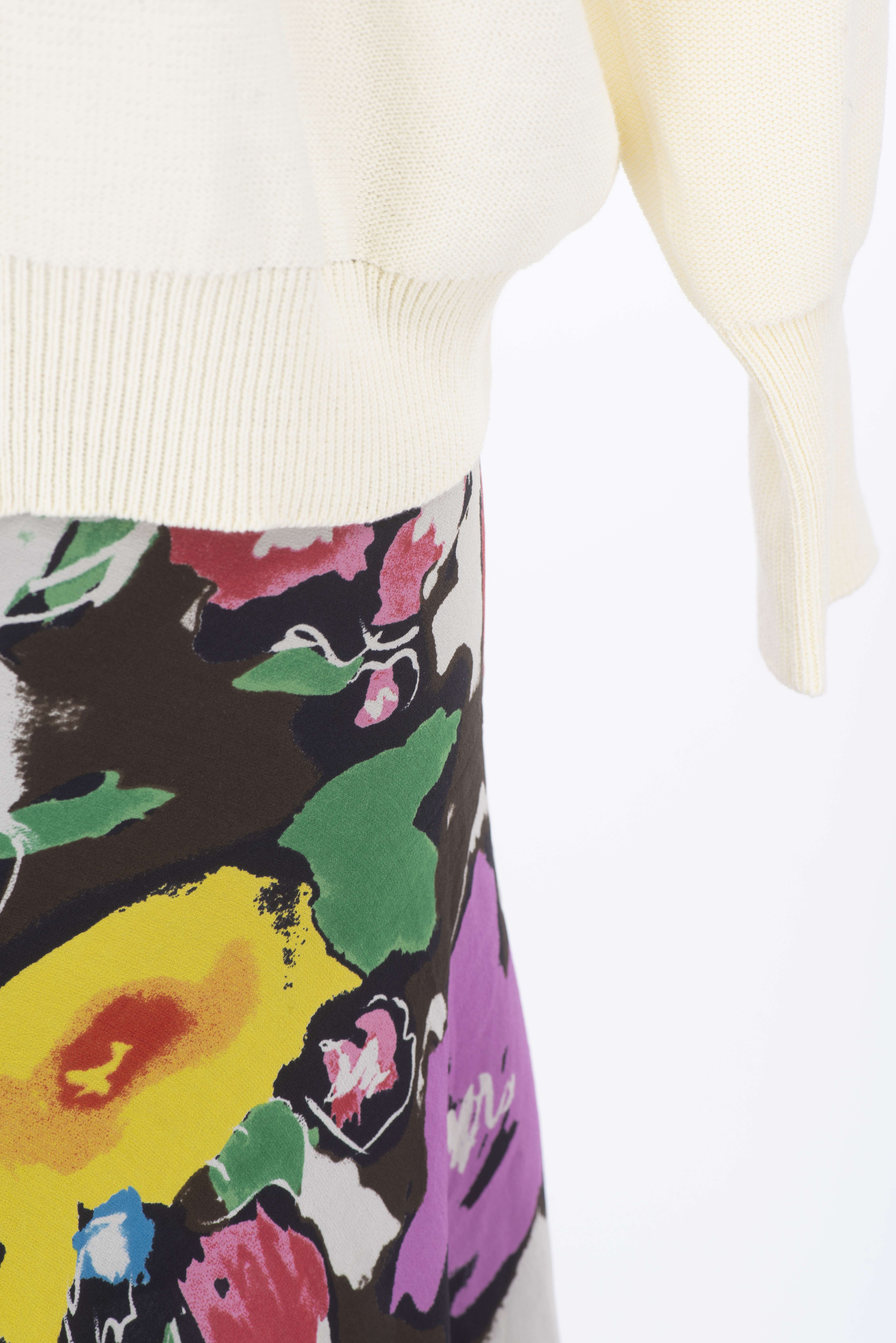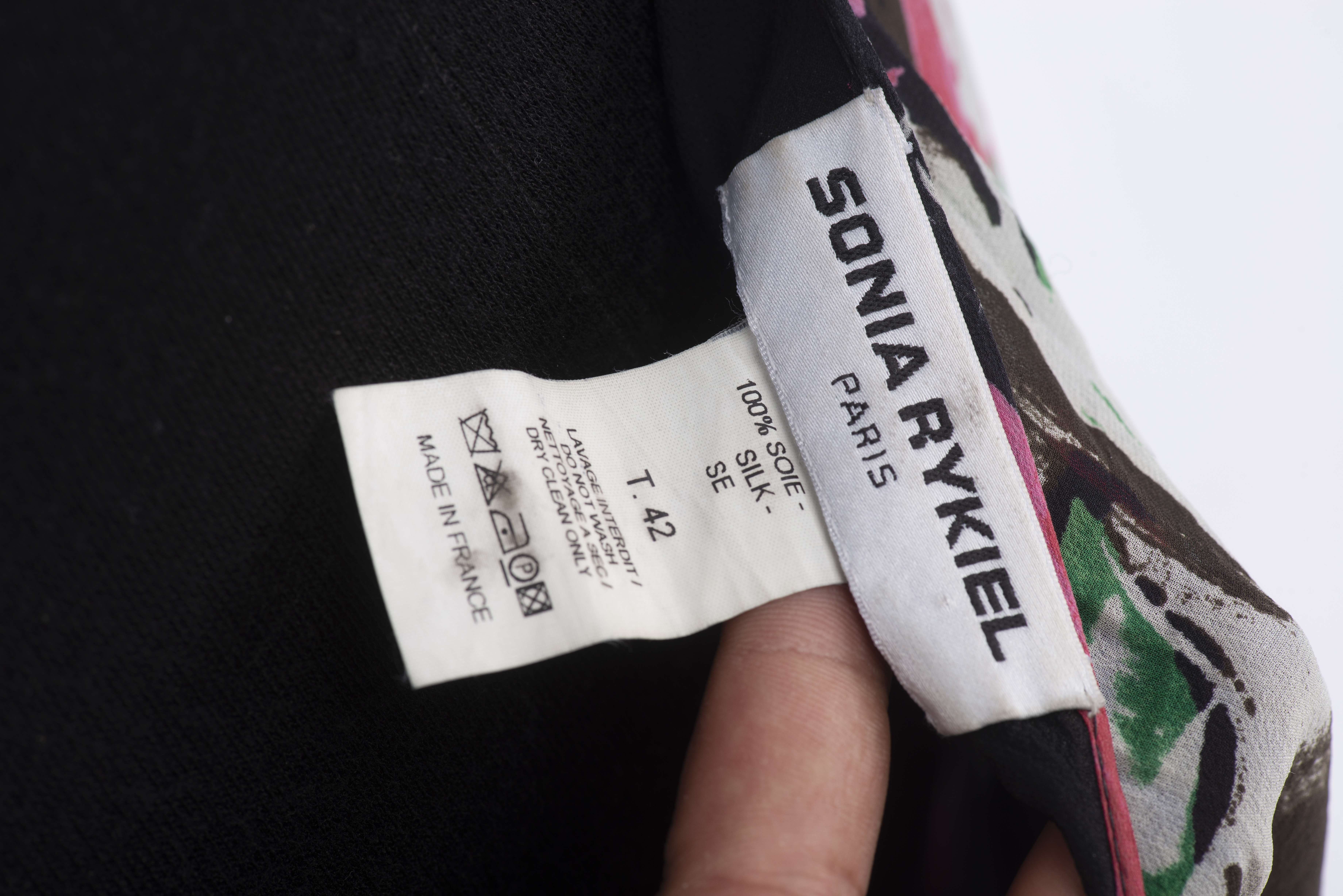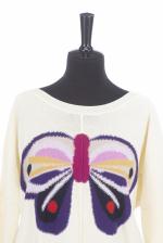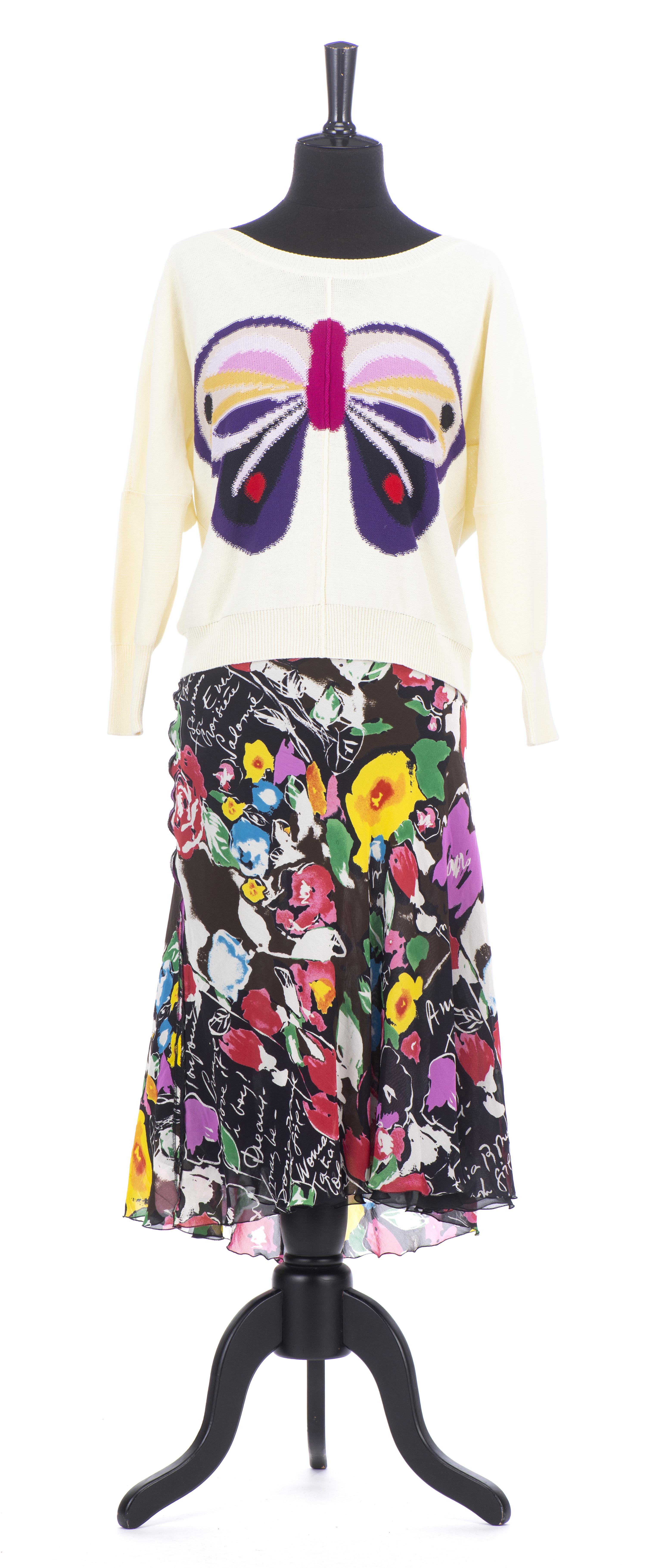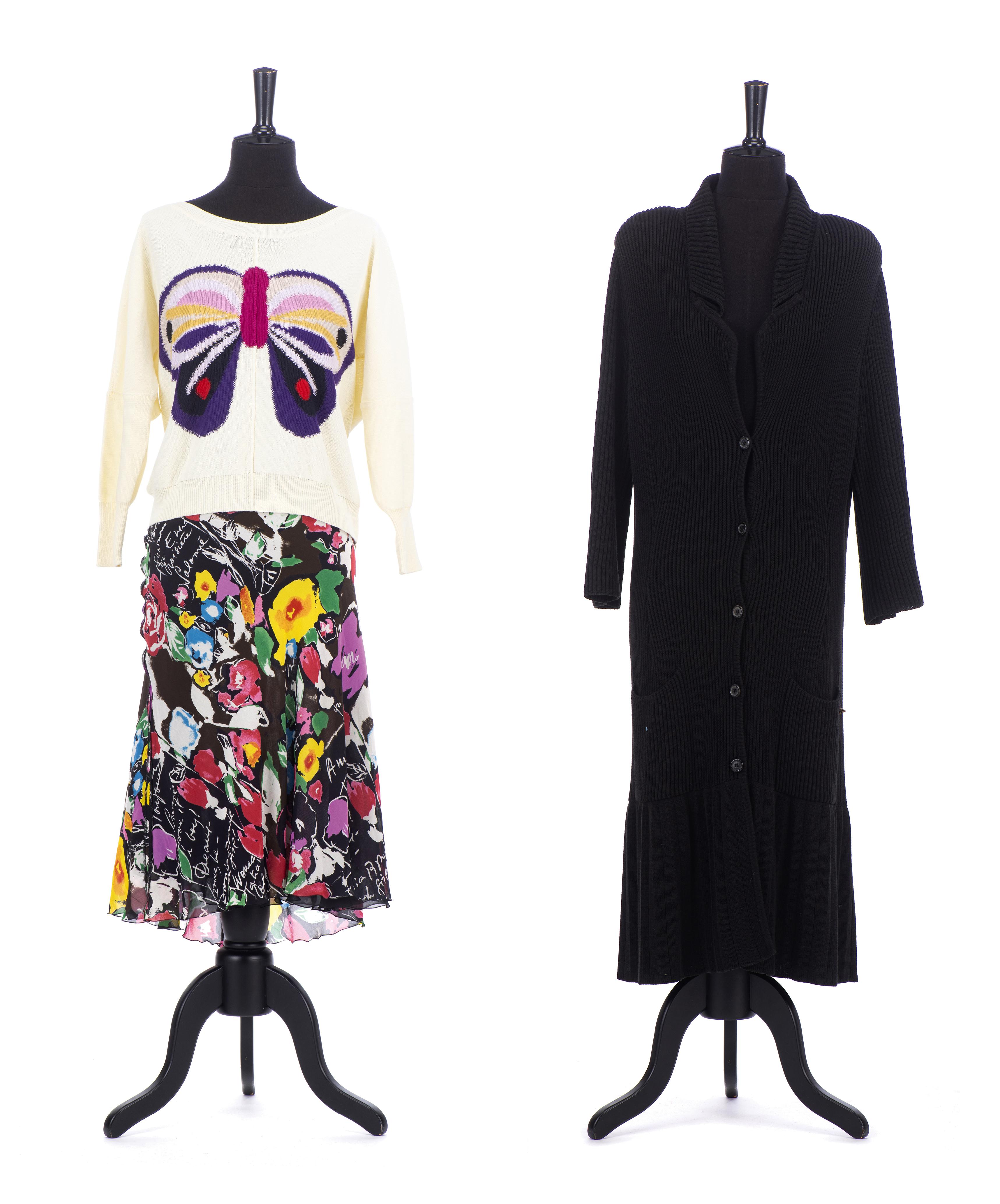 Sonia Rykiel Paris, veste longue maille noire à boutons on y joint une jupe en soie noire à fleurs multicolores T. 42 et un pull blanc L en coton à motif d'un grand papillon.