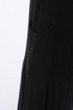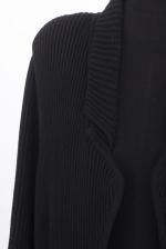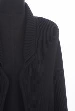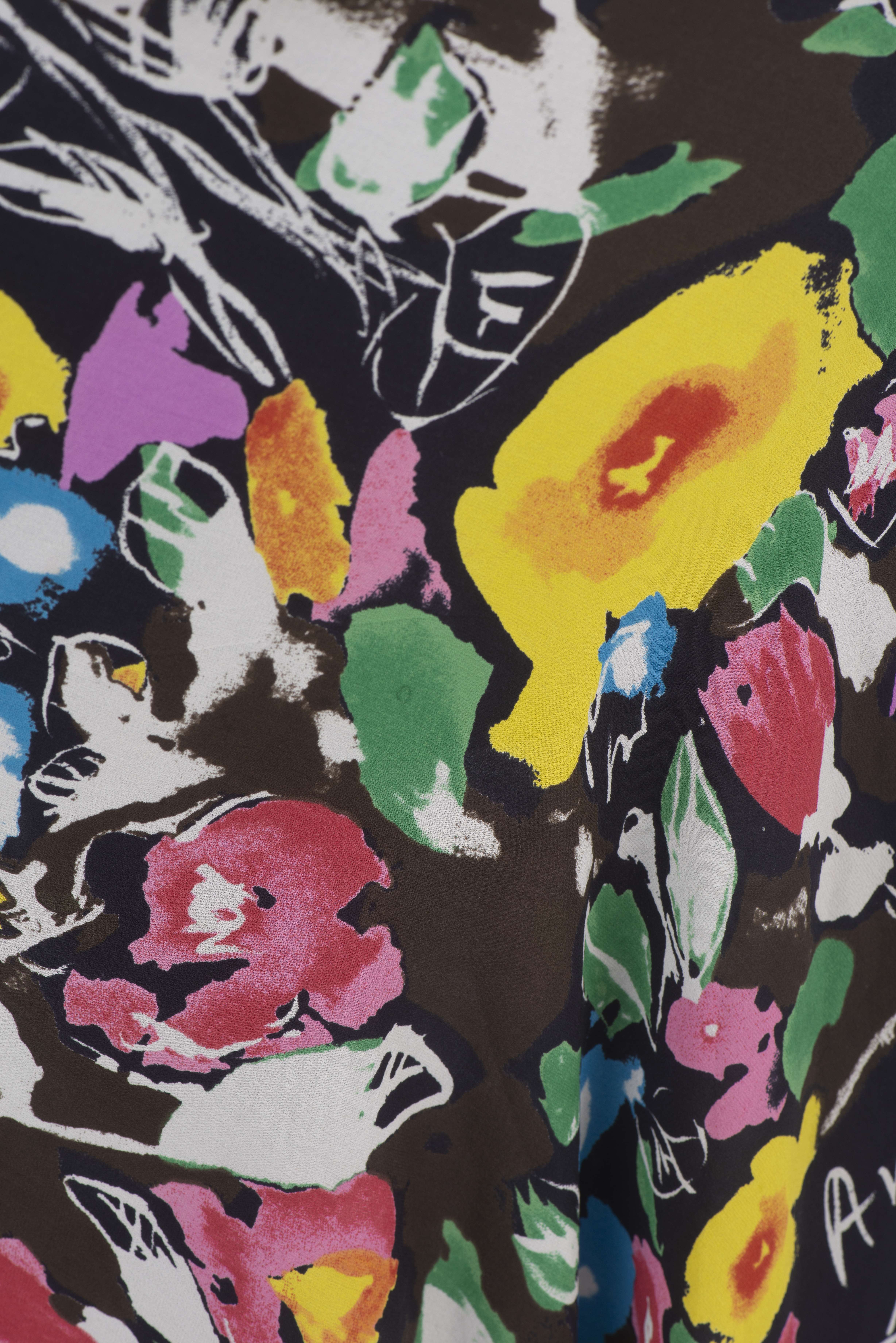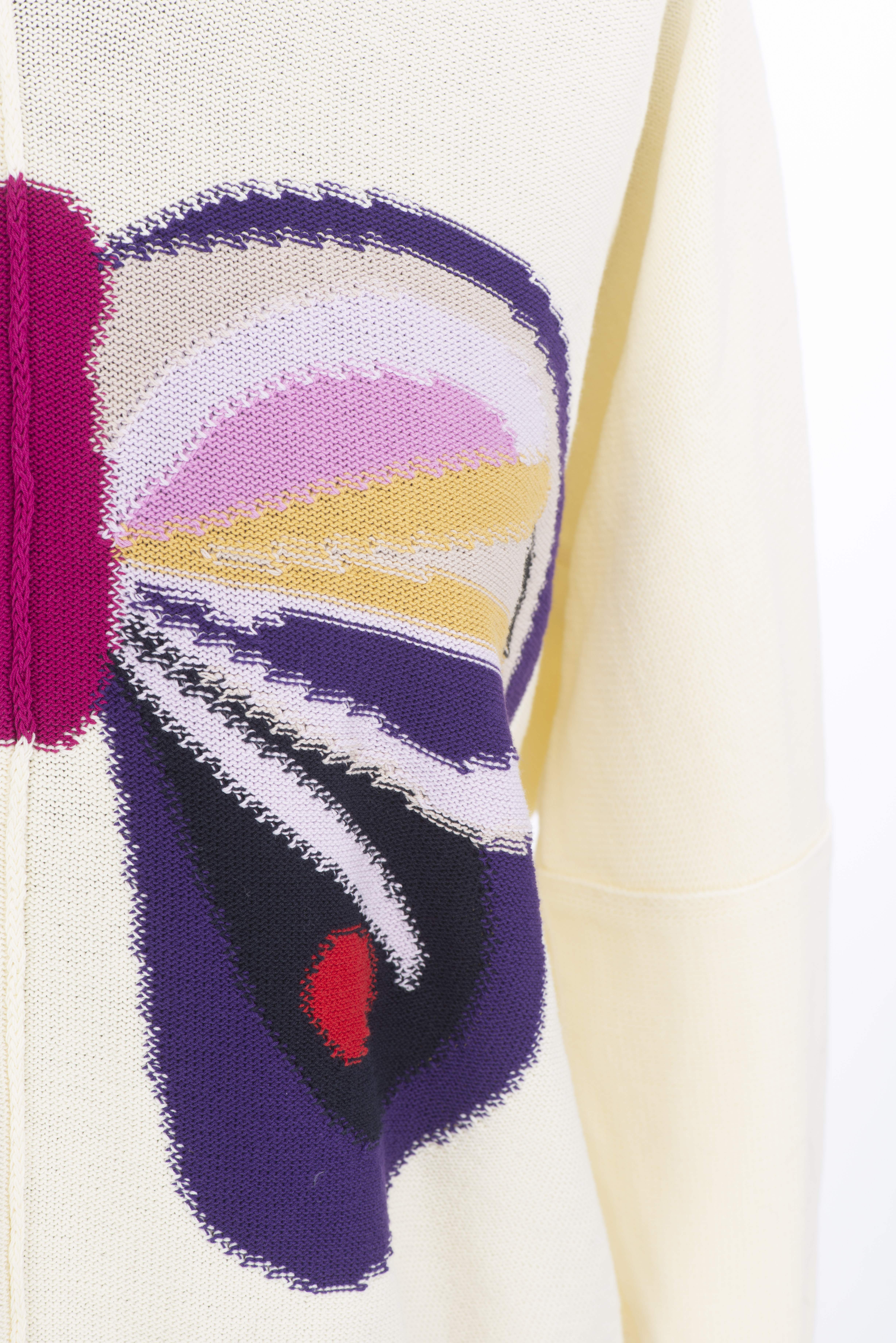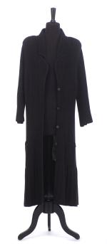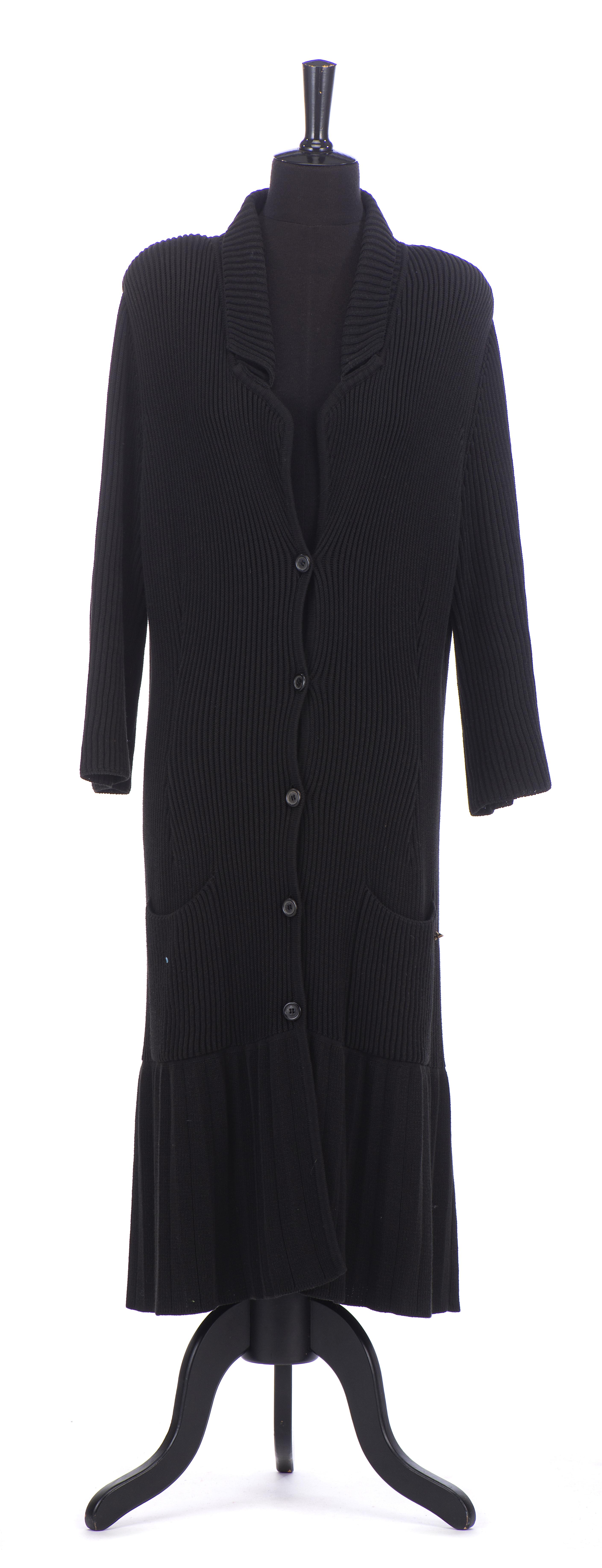 Sonia Rykiel Paris, veste longue maille noire à boutons on y joint une jupe en soie noire à fleurs multicolores T. 42 et un pull blanc L en coton à motif d'un grand papillon.