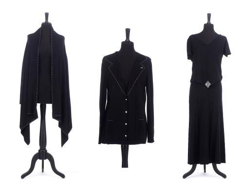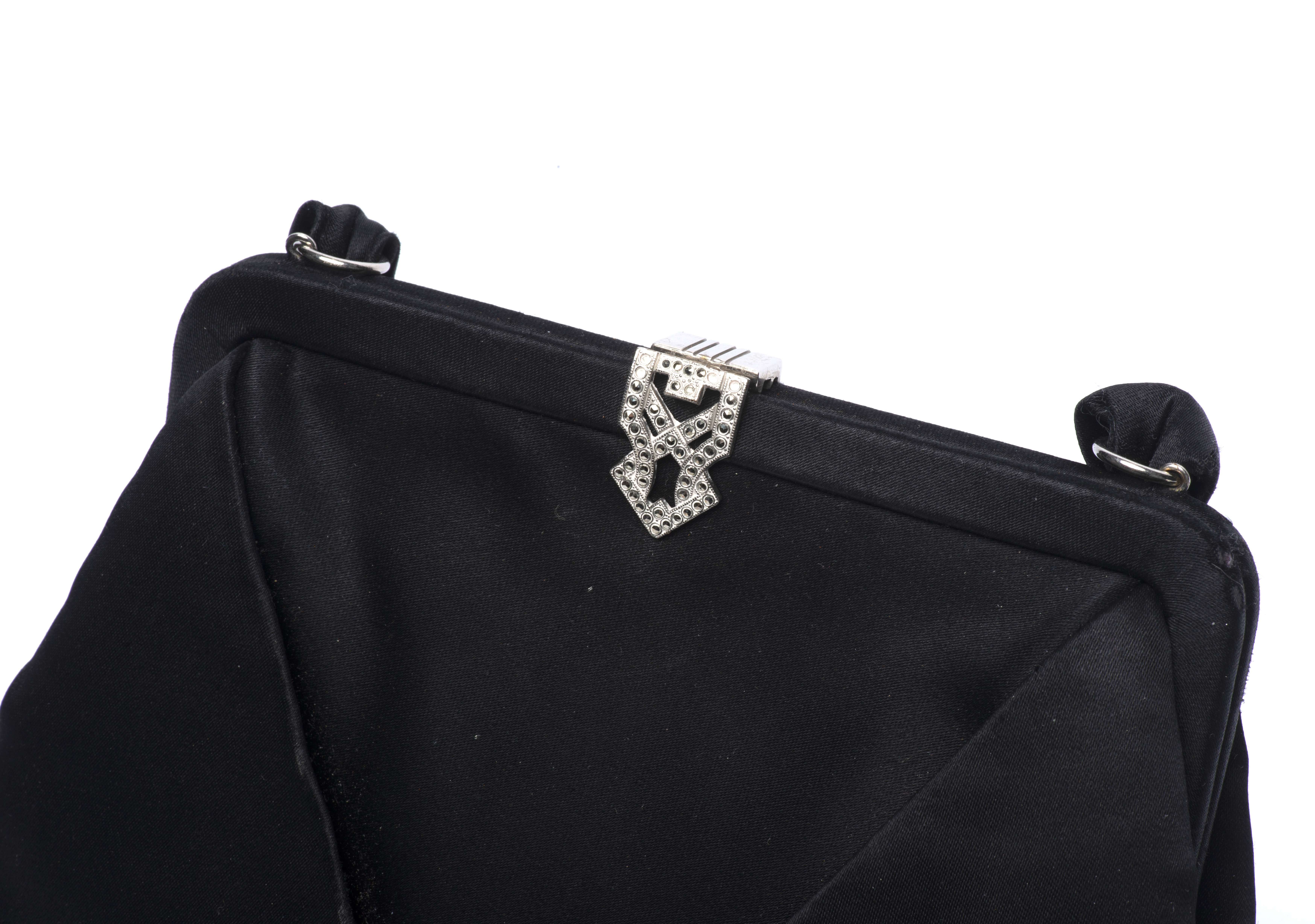 - pochette en satin noir sans marque, fermoir orné de strass en hématite, H. 21x22.5x4 cm