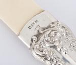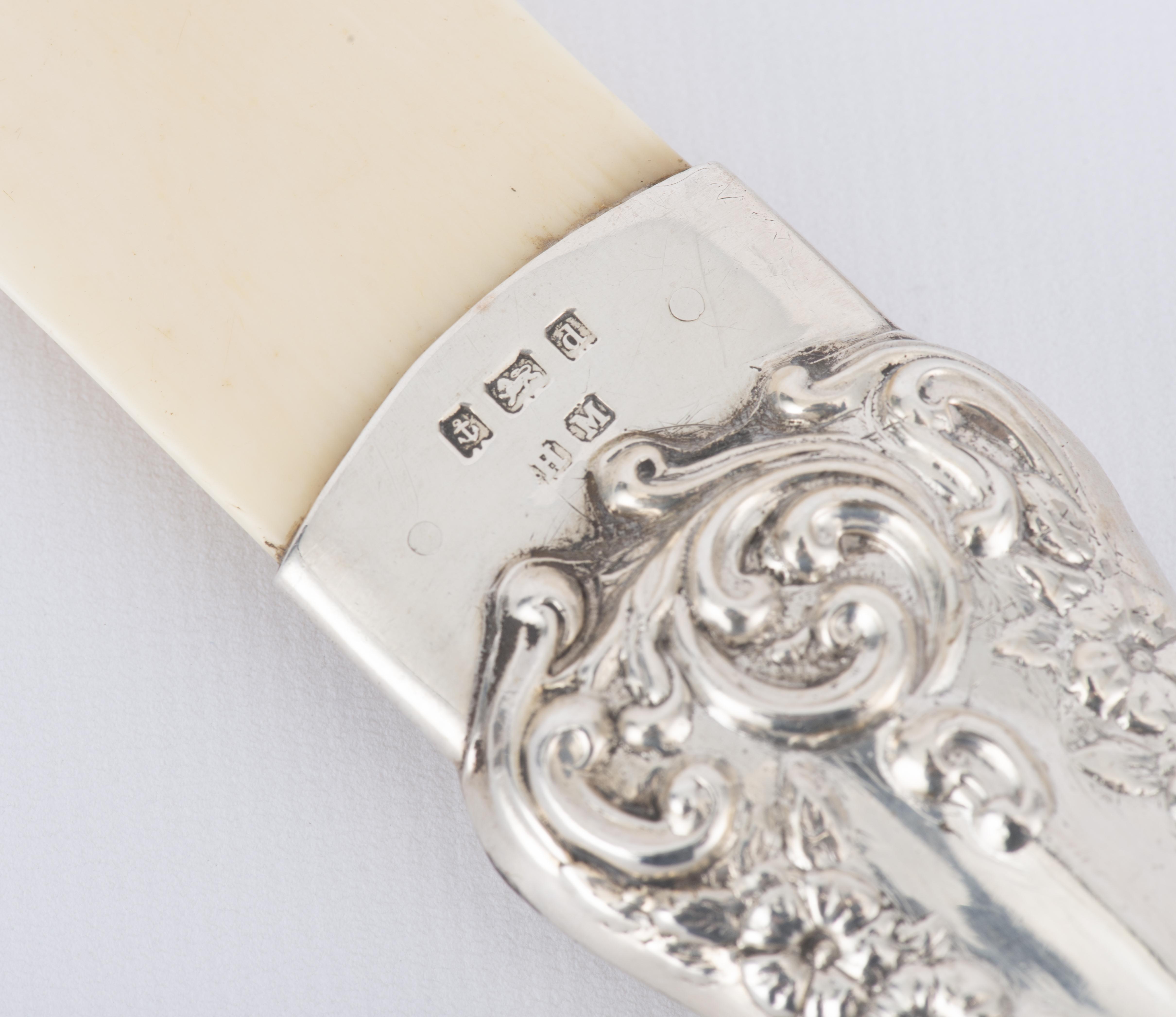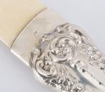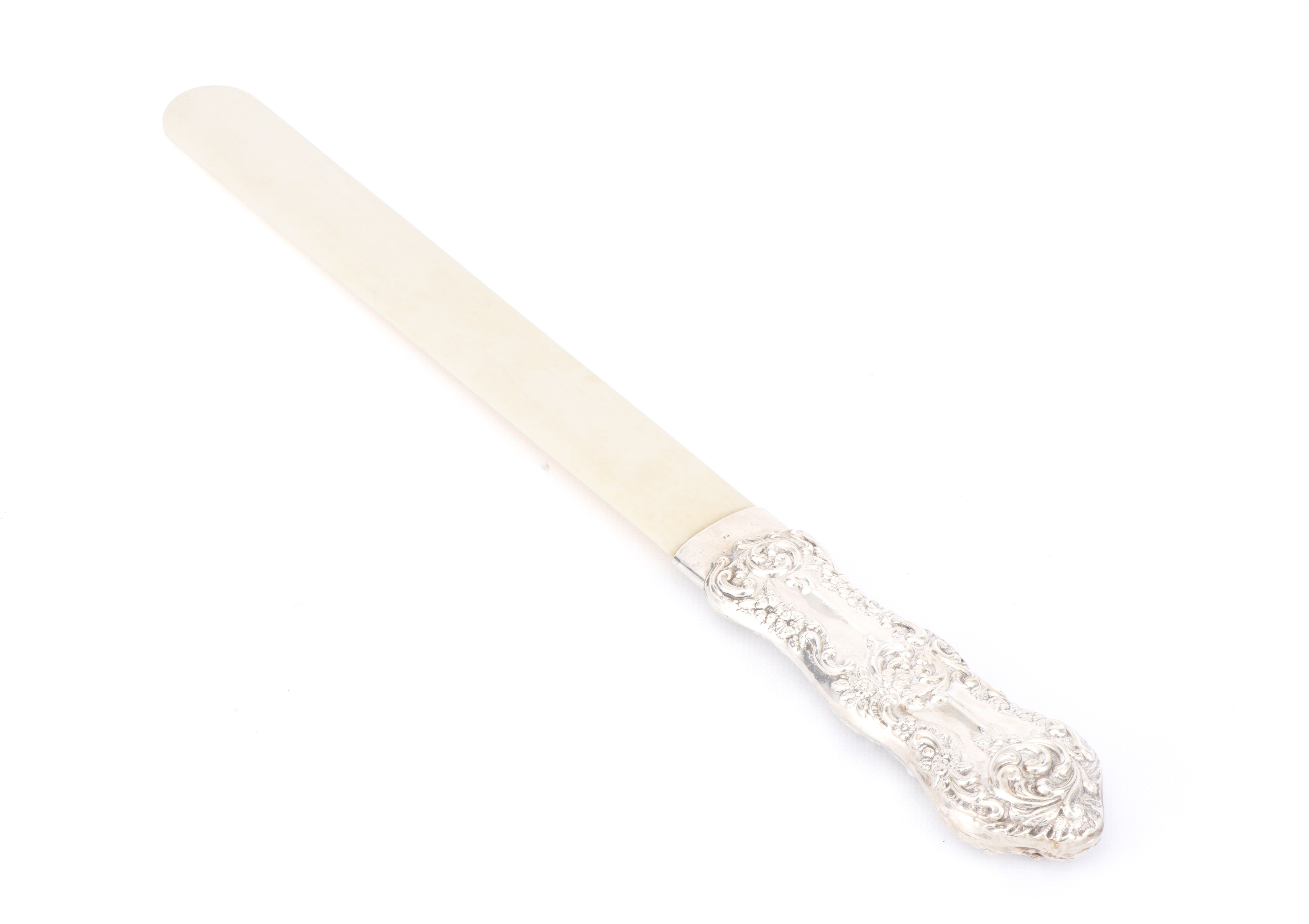 Ouvre-lettre en ivoire et manche en argent sterling .925 fourré de Birmingham de 1903 par HM, décor en repoussé de fleurs et arabesques de style baroque.
