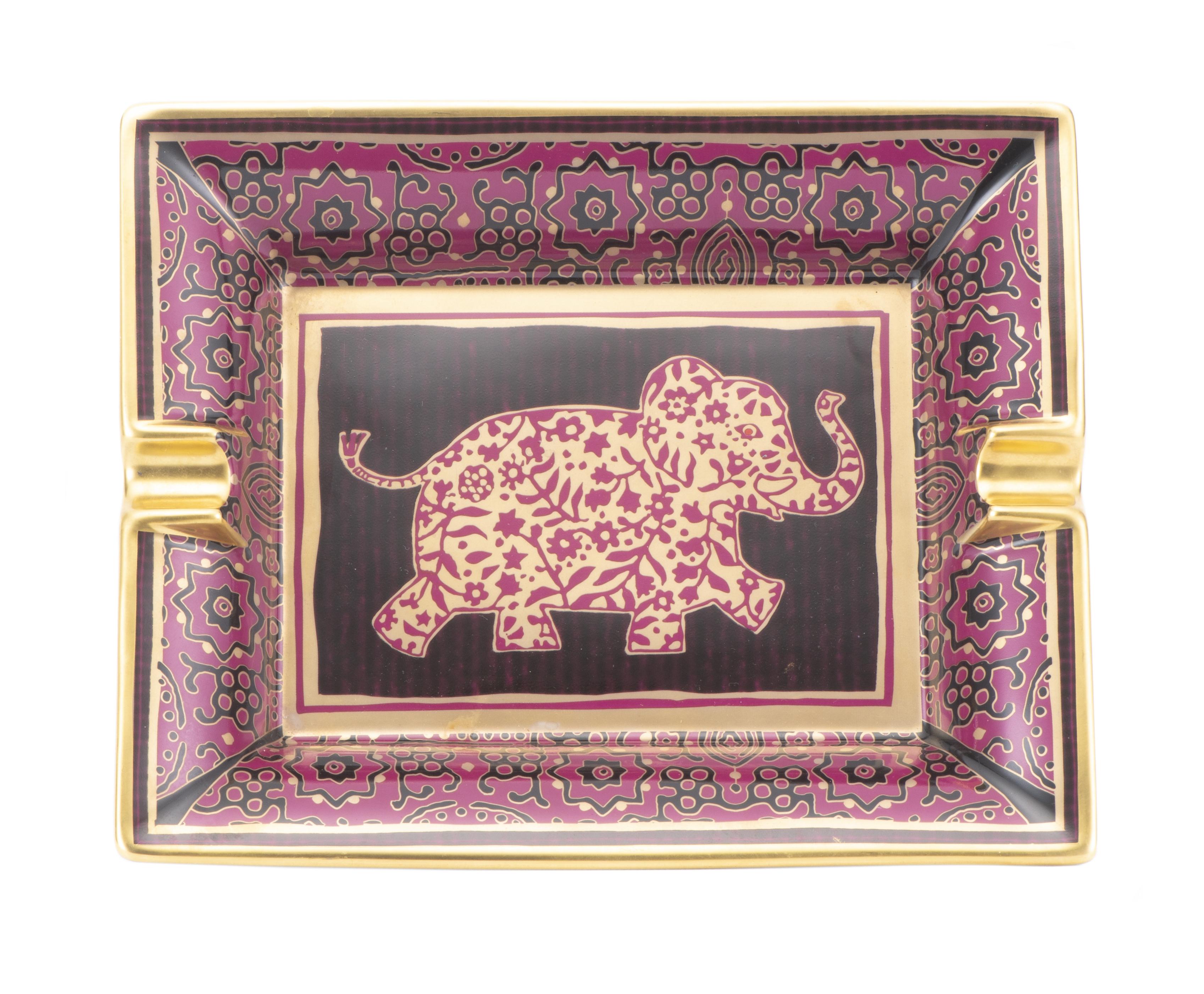 Hermès Paris, cendrier ou vide poche en porcelaine de Limoges à décor d'éléphant rehauts dorés.