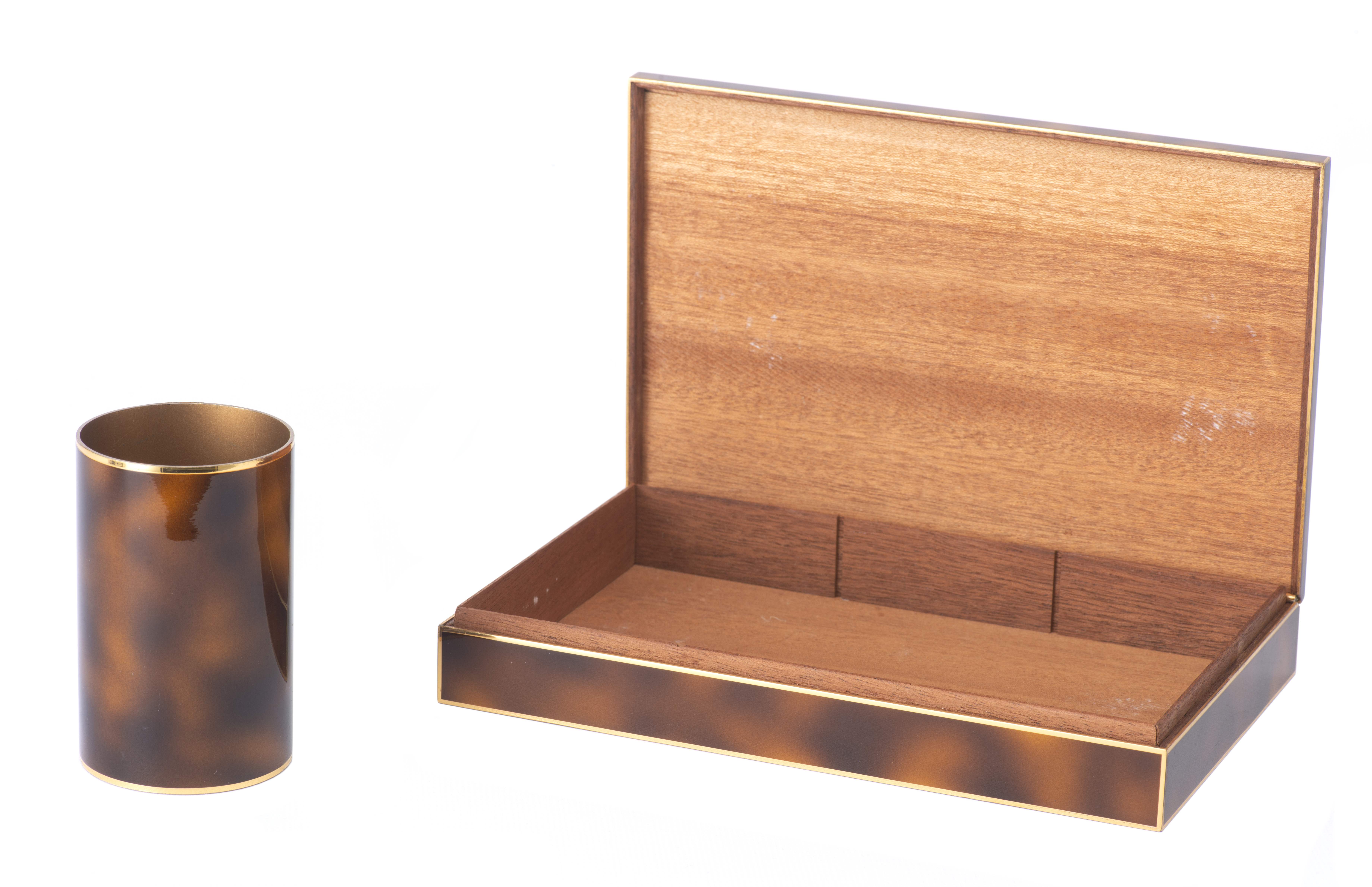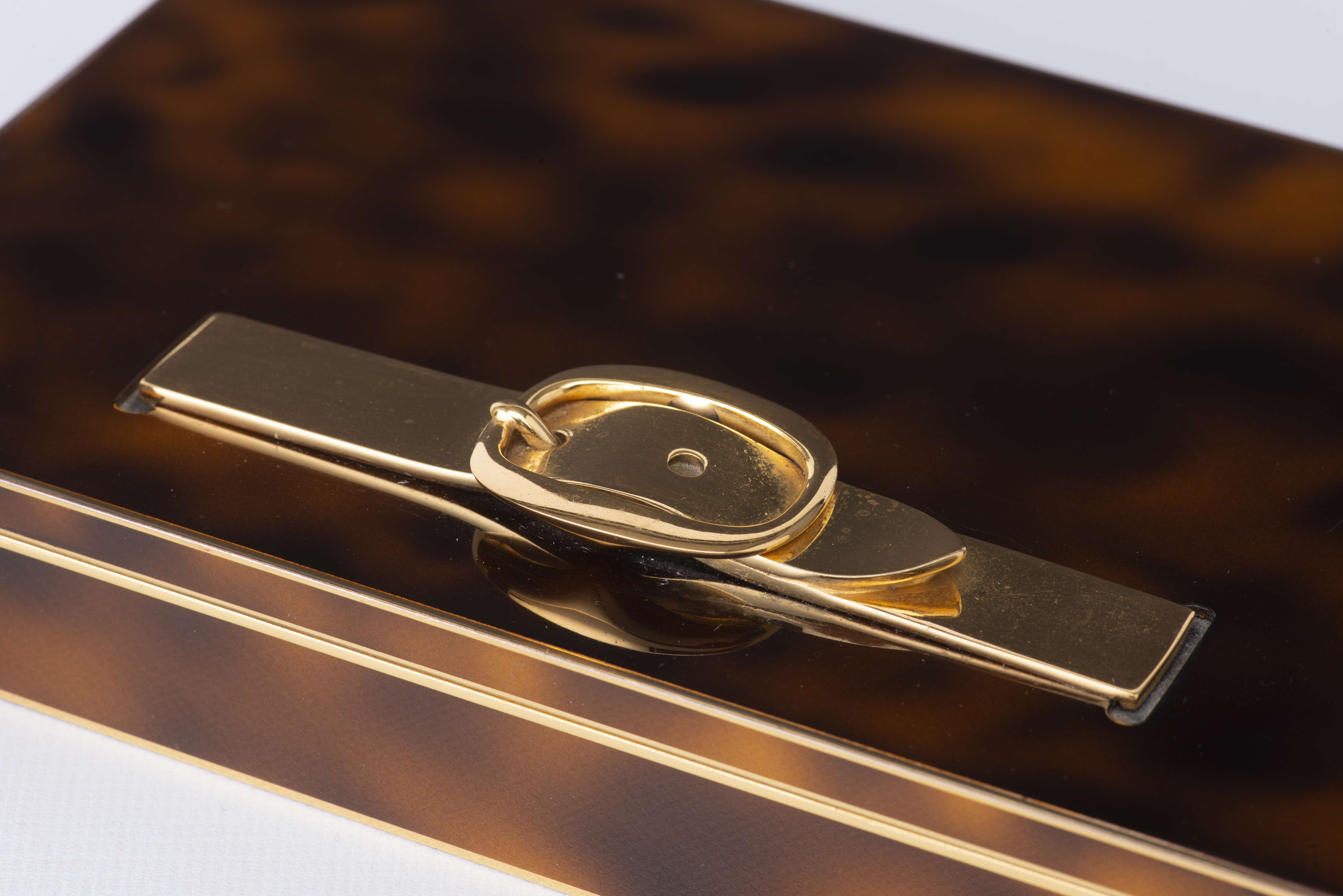 Boîte à cigarillos Hermès en métal plaqué or et décor en laque de Chine moirée havane, figurant une boucle de ceinture sur le dessus, intérieur en bois de cèdre à trois compartiments.