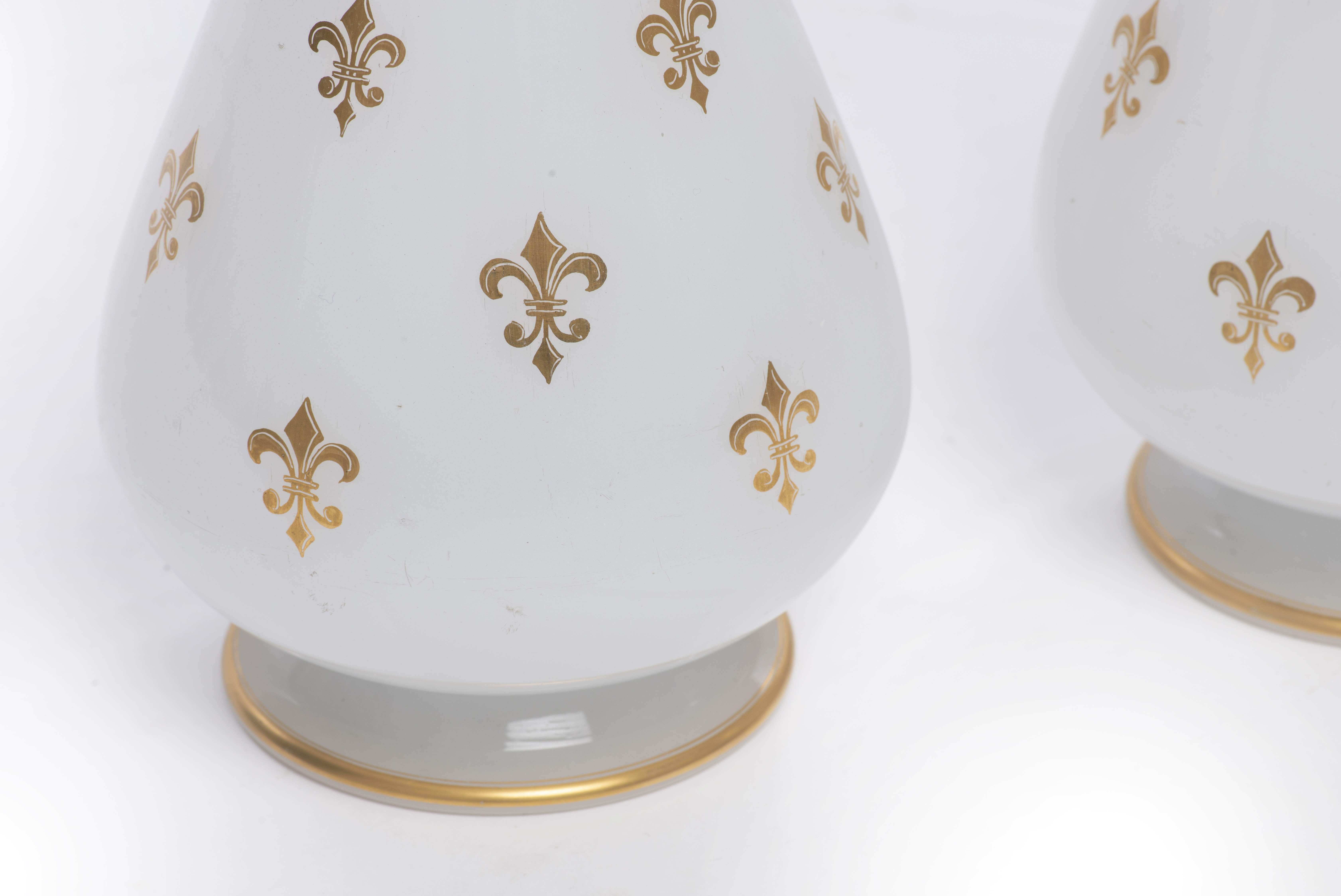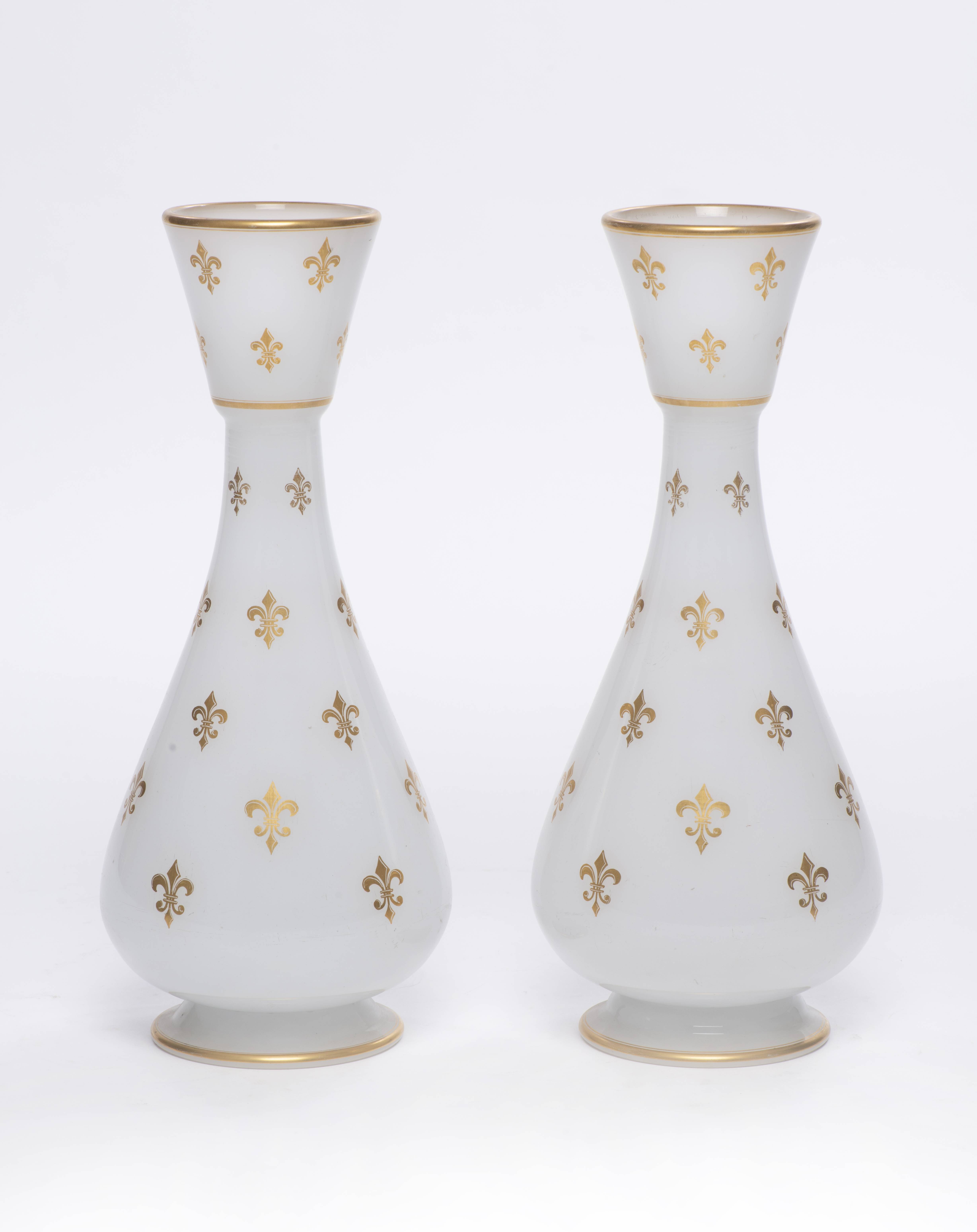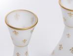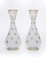 Paire de vases d'époque Charles X en opaline blanche soupe de riz à surdécor à l'or de fleurs de lys, XIXe.