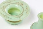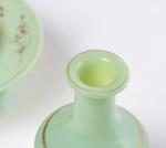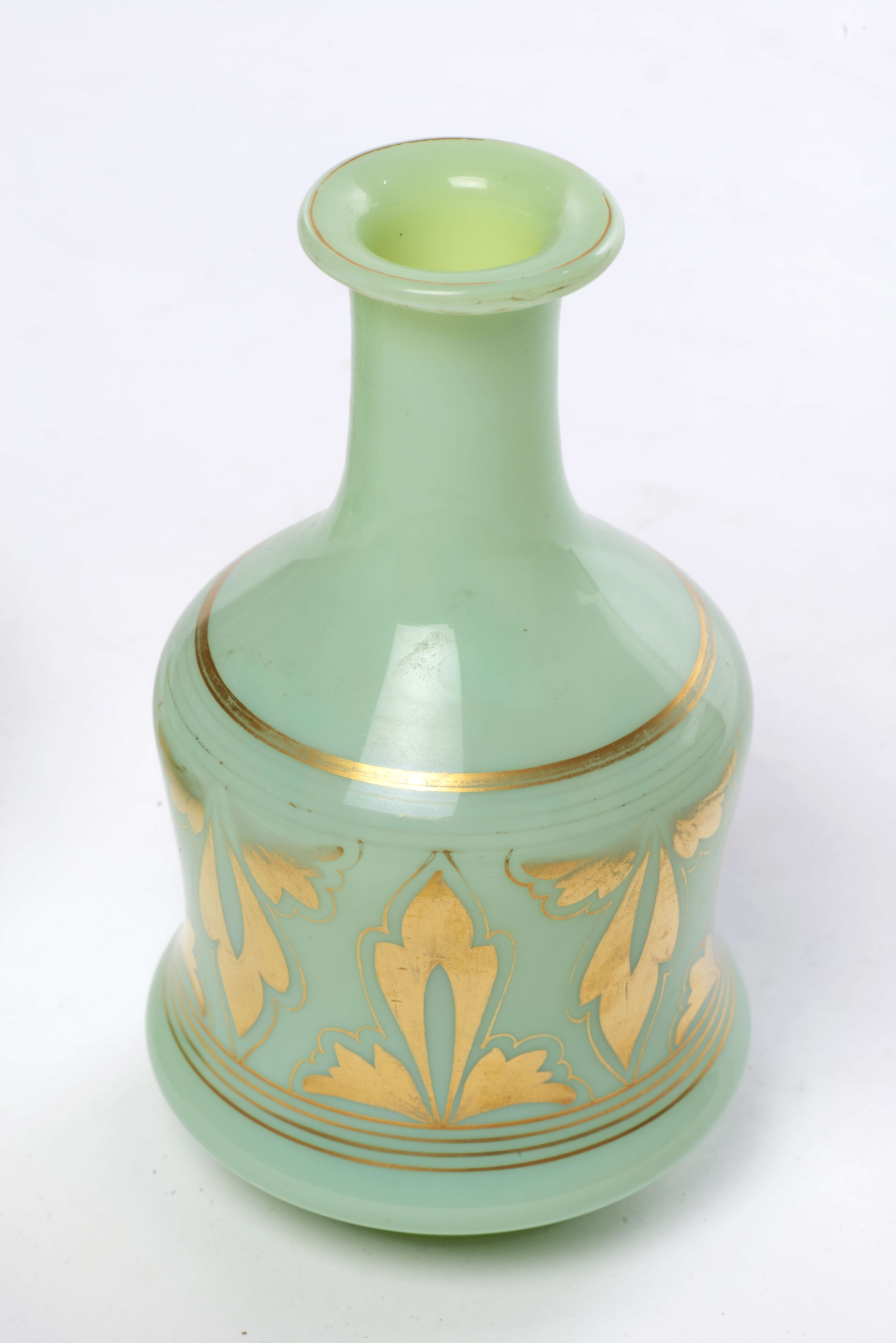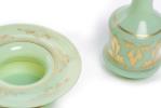 Crachoir et carafe de nuit en opaline verte à décor de feuillages à l'or, époque Charles X.
